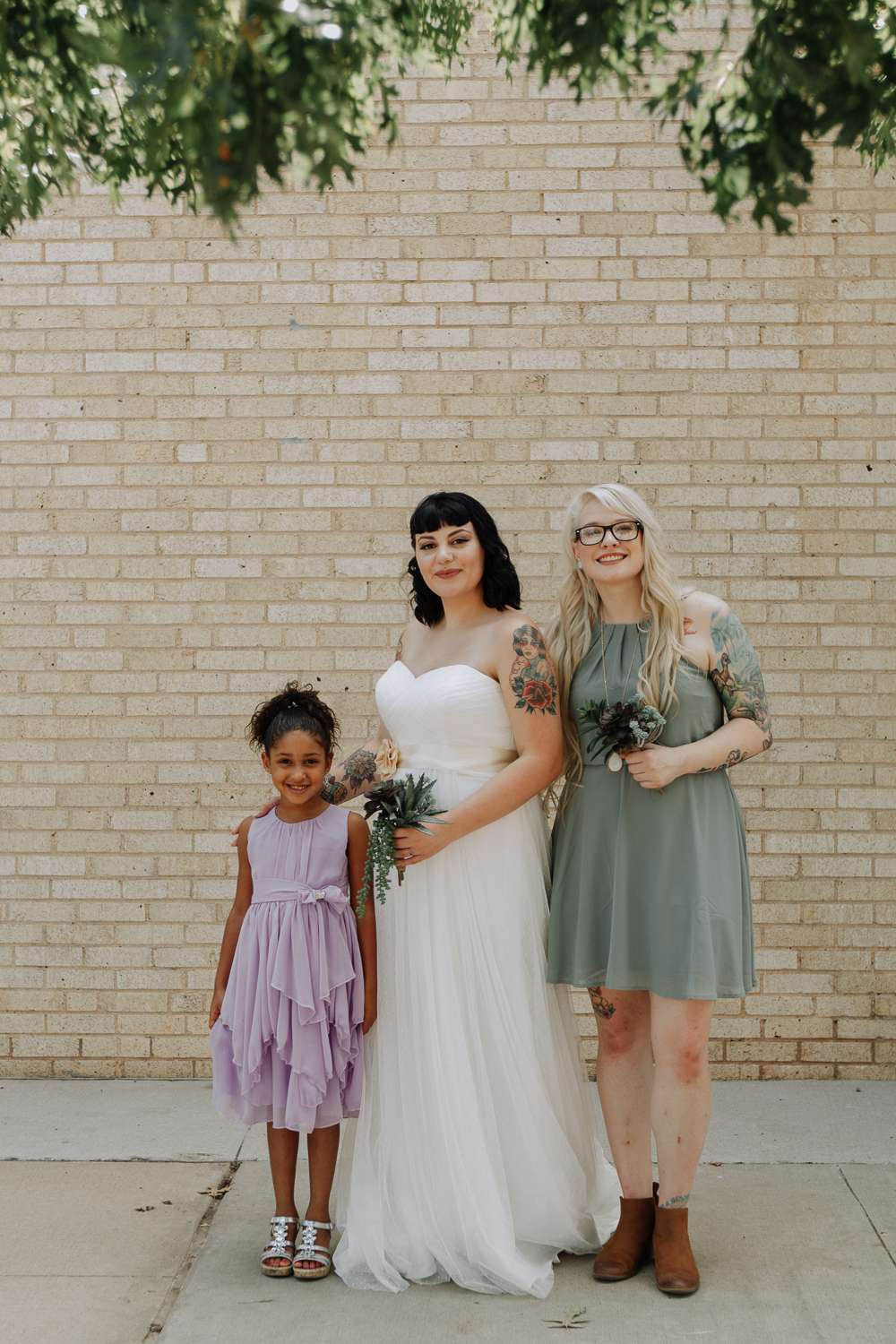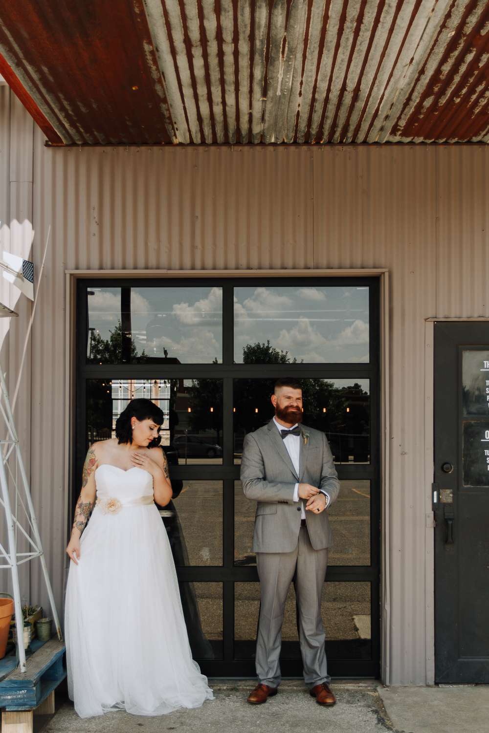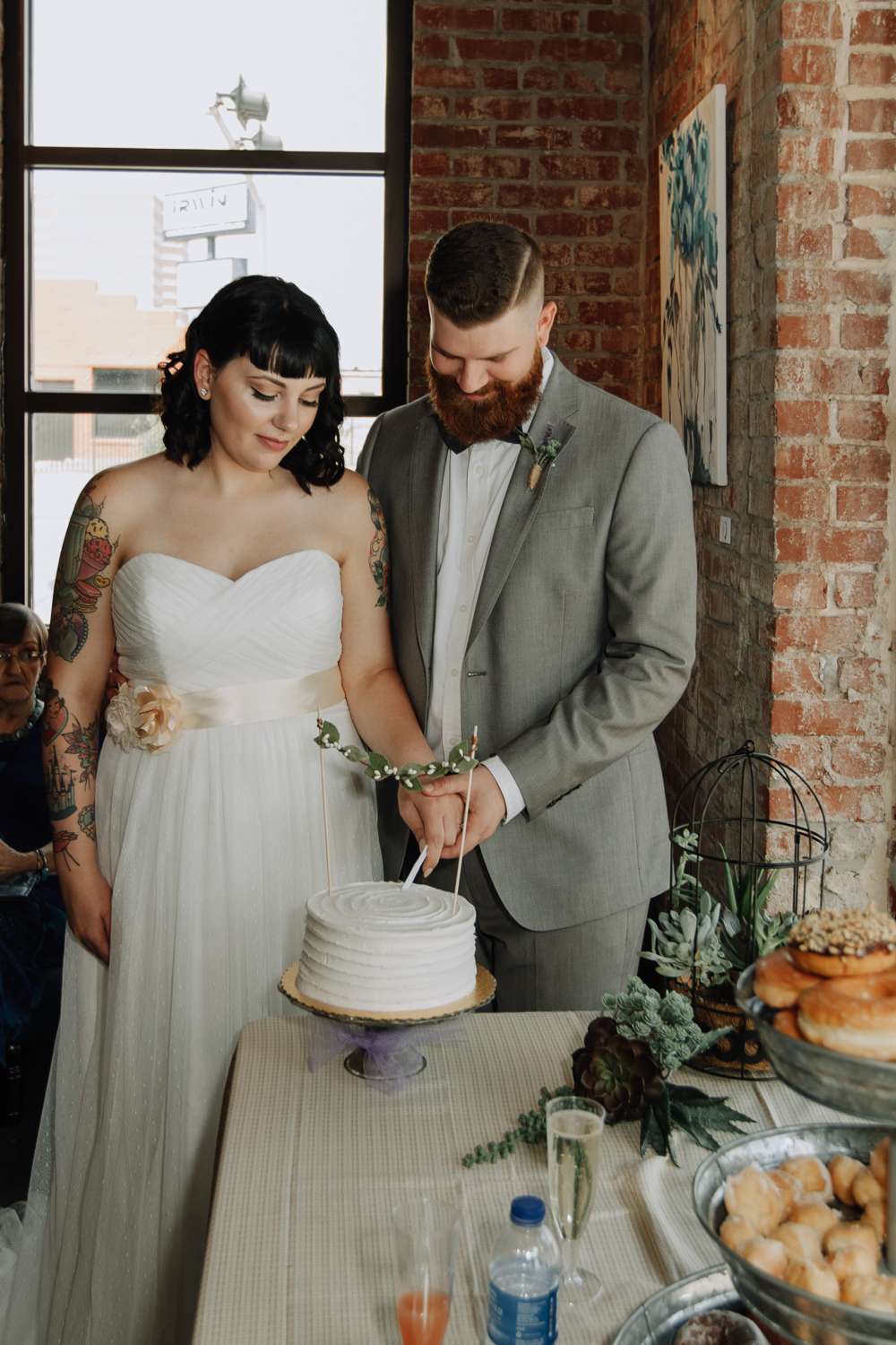 Raegan and Randy had their summer wedding at Blackmint Collective Tattoo Studio in Oklahoma City. It was the perfect venue as they and most of their bridal party and guests all have tattoos. There’s a real industrial feel to their day, with the venue’s exposed lighting rigs and brick walls dotted with modern art, all softened by details like pastel-glazed donuts and the delicate greens of succulents. It’s a look that says modern wedding with an edge, and it’s beautiful.