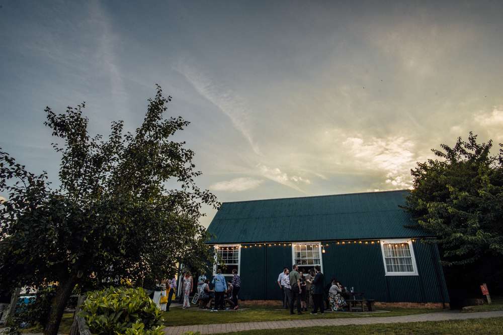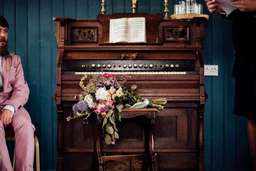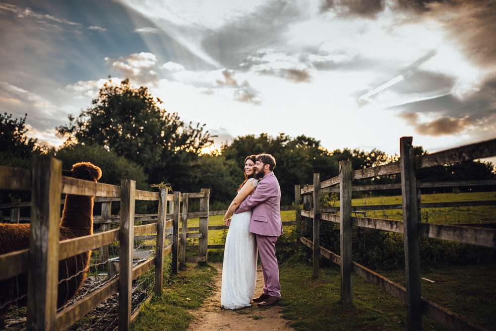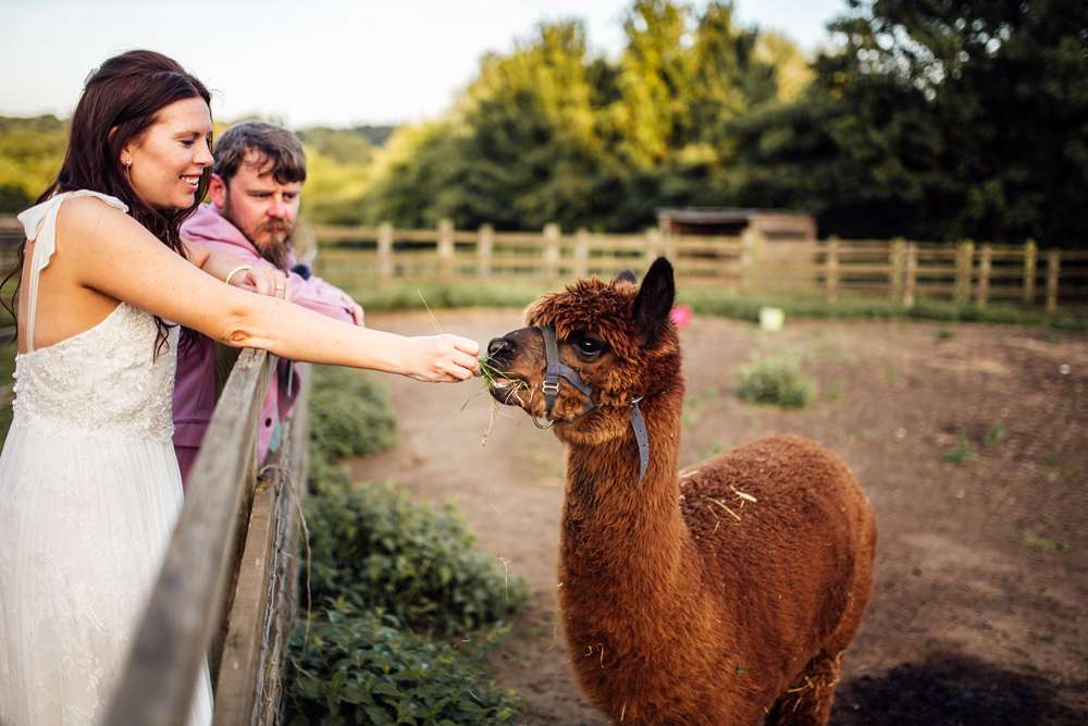 “We took a lot of inspiration from our venue. We had use of the grounds and three buildings. The ceremony took place in an amazing 19th century pink tin chapel called the Cuxton Chapel as it used to be in the town of Cuxton. The chapel is deconsecrated, which was perfect for us as atheists. Plus, I love religious iconography and symbolism so the dark teal interior with the organ and crucifixes were just perfect. It was like something from a film or a retro photo. Also, there are alpacas! We first visited Kent Life before we were engaged and after Jimmy proposed I think we both knew that there was never going to be any other option as to where we got married.”