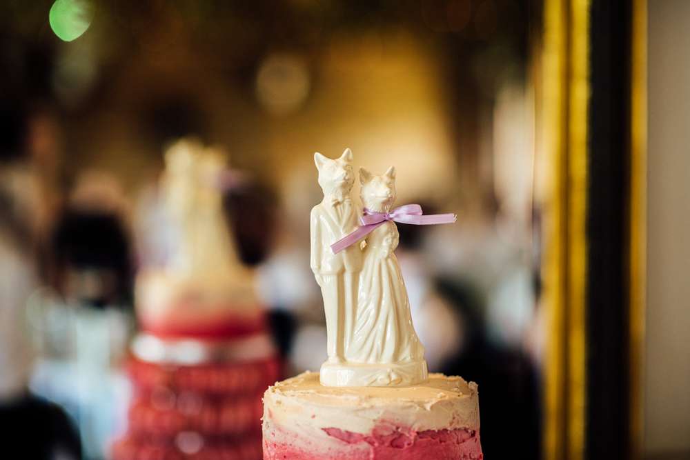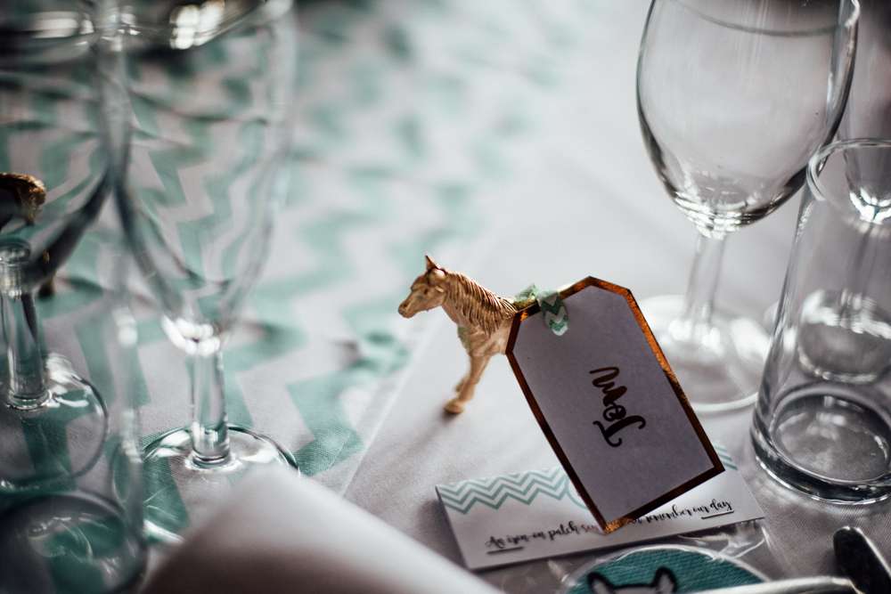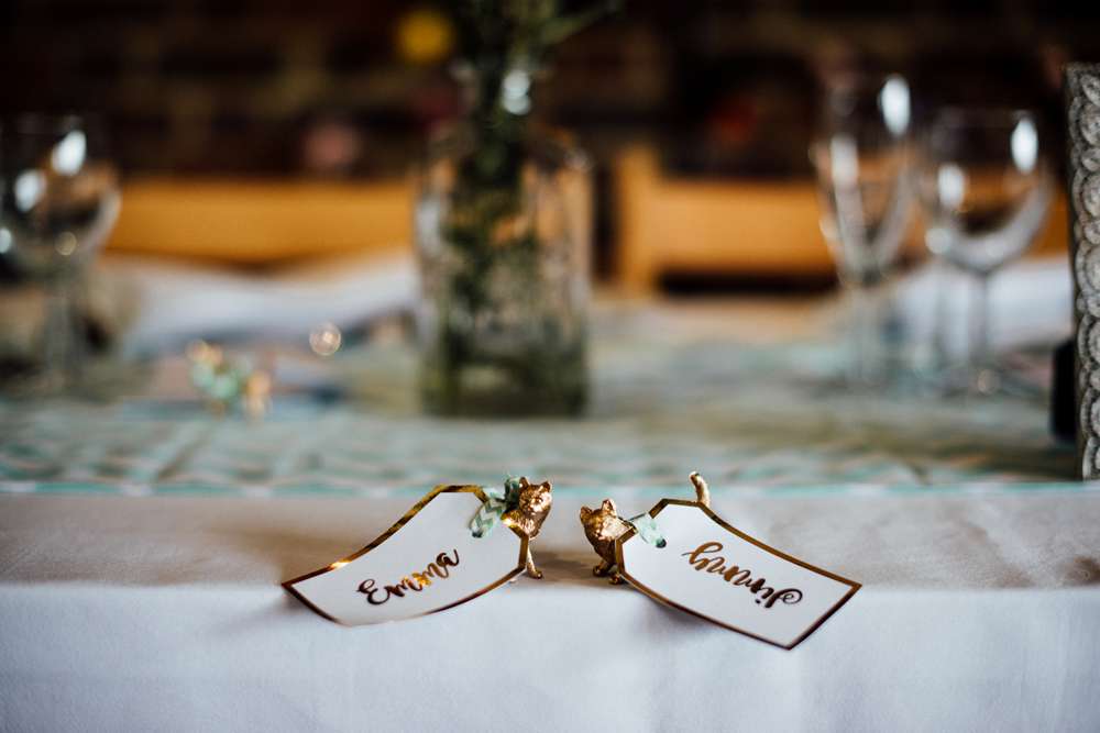 “We also both absolutely adore animals, so we loved that the farm had such a range and we incorporated these into the wedding a lot. We had them on our invitations, Jimmy created colouring books for the kids at the wedding that had farm animals in, we spray-painted plastic animals gold for placeholders – our guests had farm animals and we had cats because we have two cats at home (Audrey and Norma), our cake topper was an amazing ceramic cake topper of a Mr and Mrs fox that we got from Etsy.”