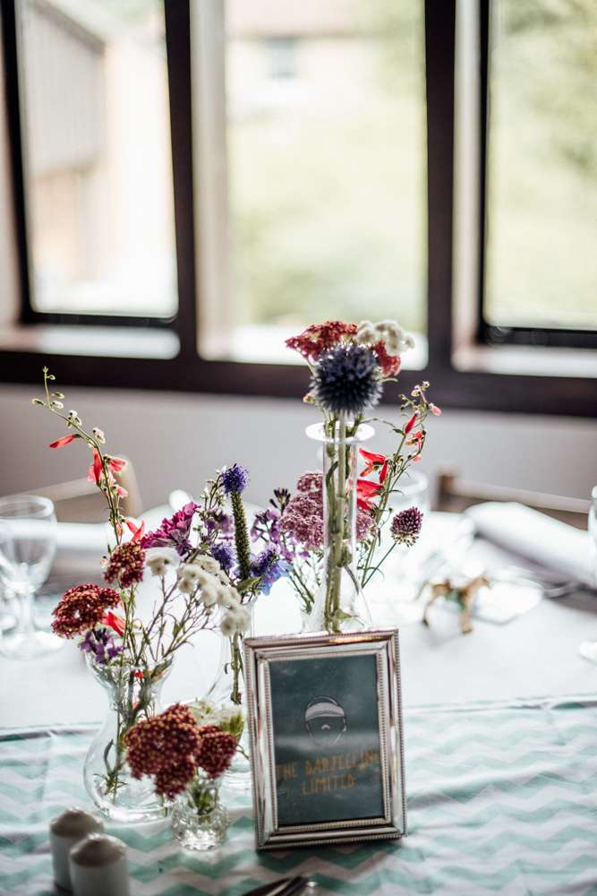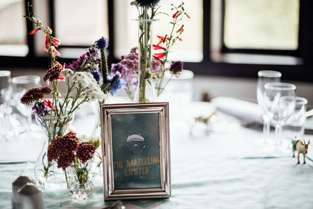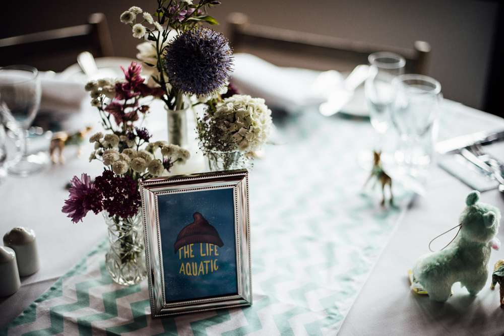 “We also made loads of paper pom poms for the party hall in our wedding colours, pink and green, and put up fairy lights. We made a flower curtain from artificial flowers and invisible thread, for the top table backdrop. We wrote some Wes Anderson film quotes on chalkboards. I also filled an old suitcase with flowers. We made our own table runners from some green chevron fabric that we bought from eBay. We named our tables after Wes Anderson films and Jimmy created designs for these that we put in frames. We spent months buying and collecting unusual glass vases and bottles for the tables that we put flowers in.”