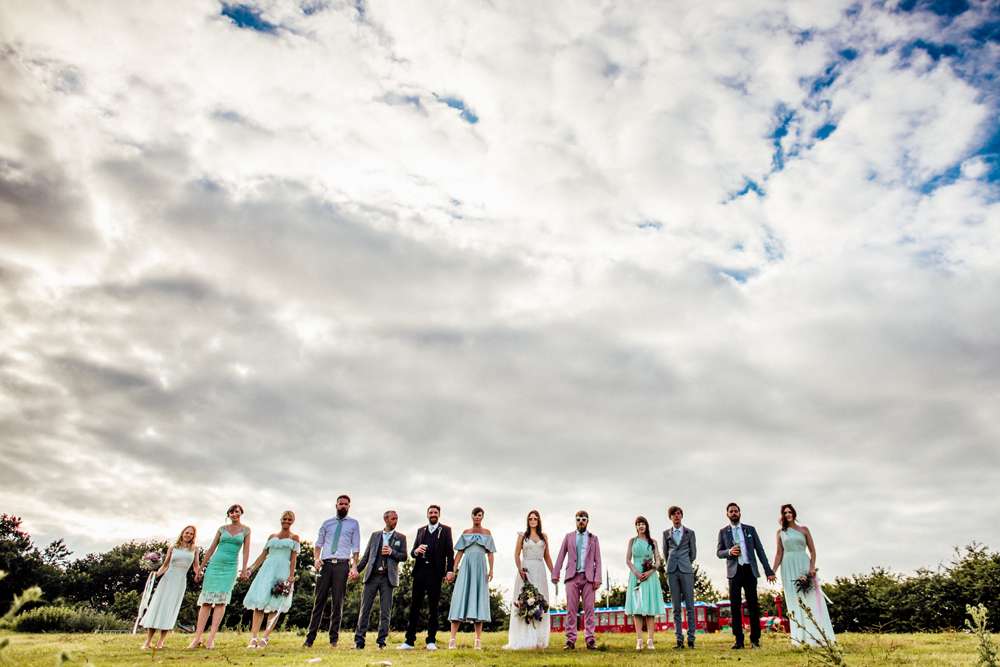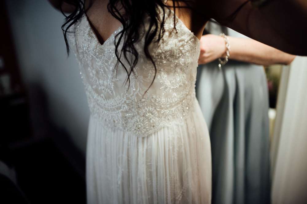 The bride chose the ‘Harley’ gown by Catherine Deane. It was the first dress she felt like herself in. Her shoes were a steal and found on eBay for £40! “I really struggled to choose a dress initially and didn’t order this one until five months before the wedding”, she explained. “My first appointment was at a traditional bridal store and I just felt so uncomfortable in every single dress I tried on. There was just way too much material for all of them, and I knew I wanted something easy to move in. My experience at Catherine Deane was amazing and although the dress was nothing like I imagined it would be, I fell in love with it the minute I put it on. My shoes were Collectif ‘Georgia’, which I bought for about £40 on eBay. I searched for low heeled (Jimmy and I are the same height) mint green shoes and these were really comfortable. I made my own crystal hairpiece as well as crystal hairpieces for my bridesmaids. I also made myself a crystal necklace.”