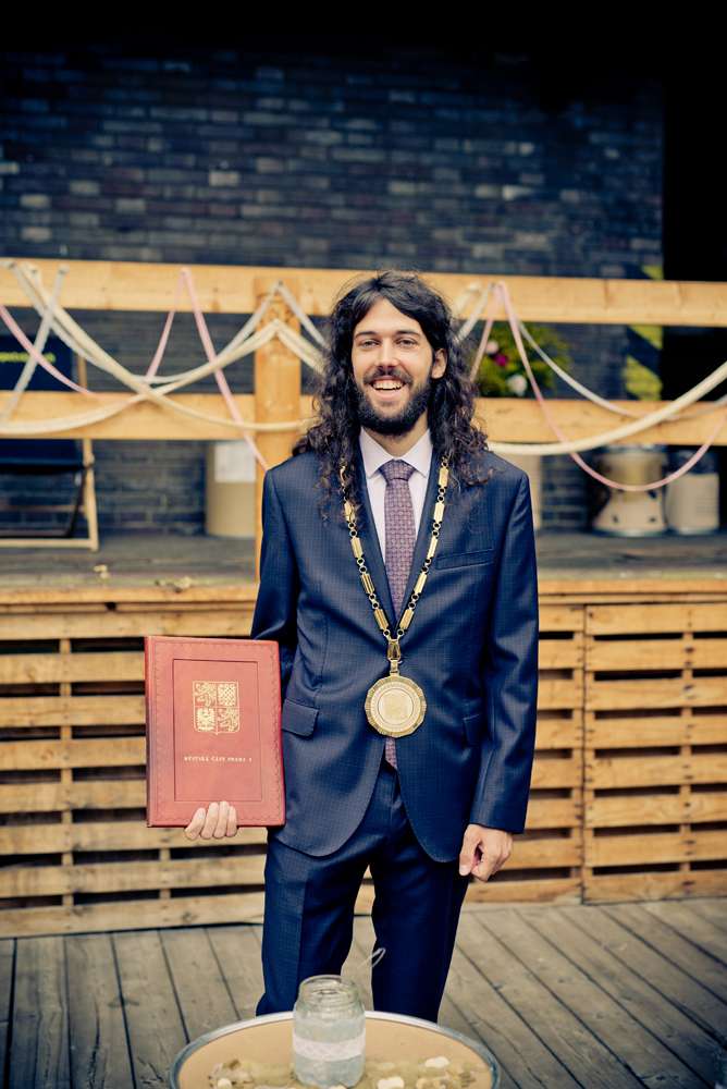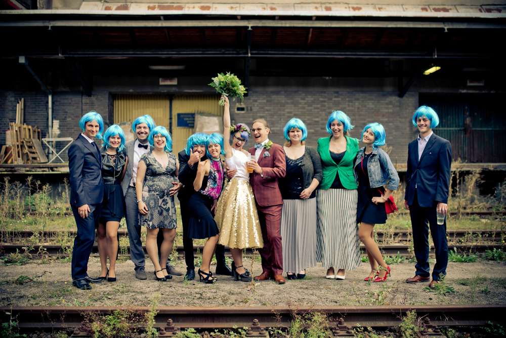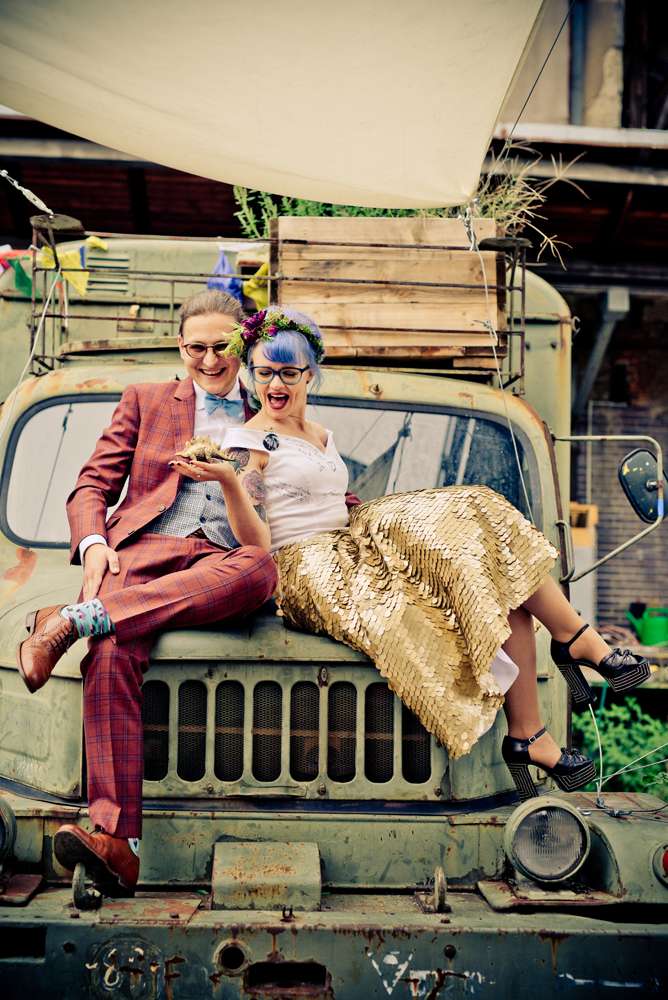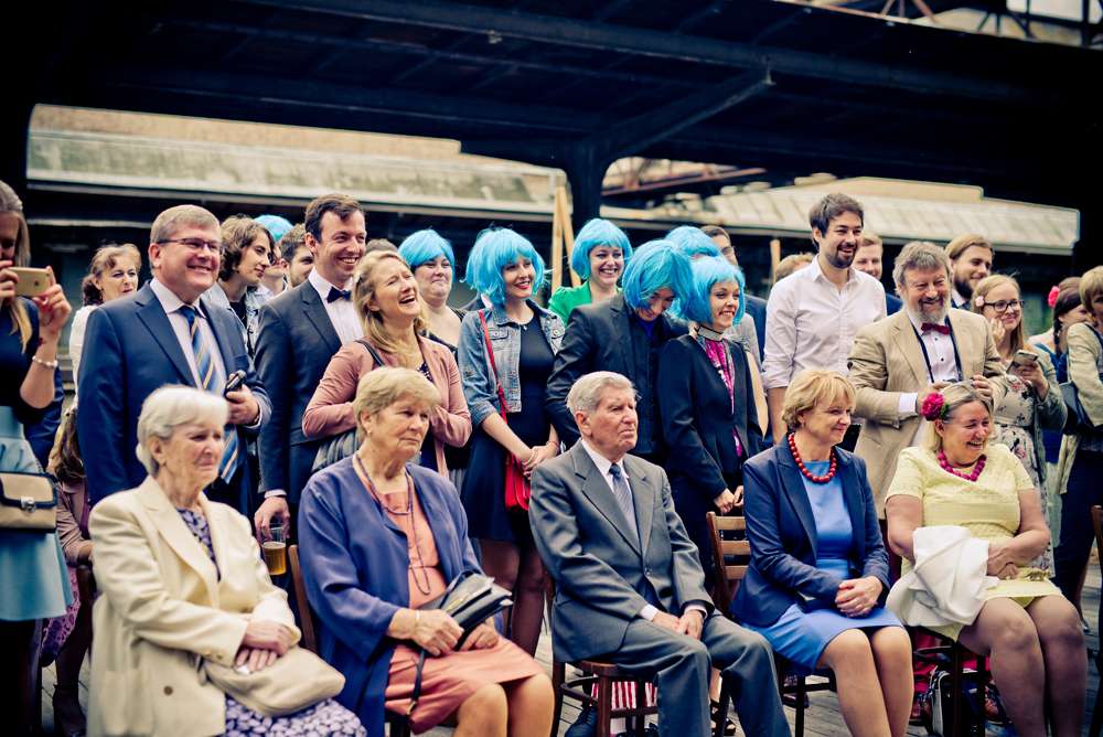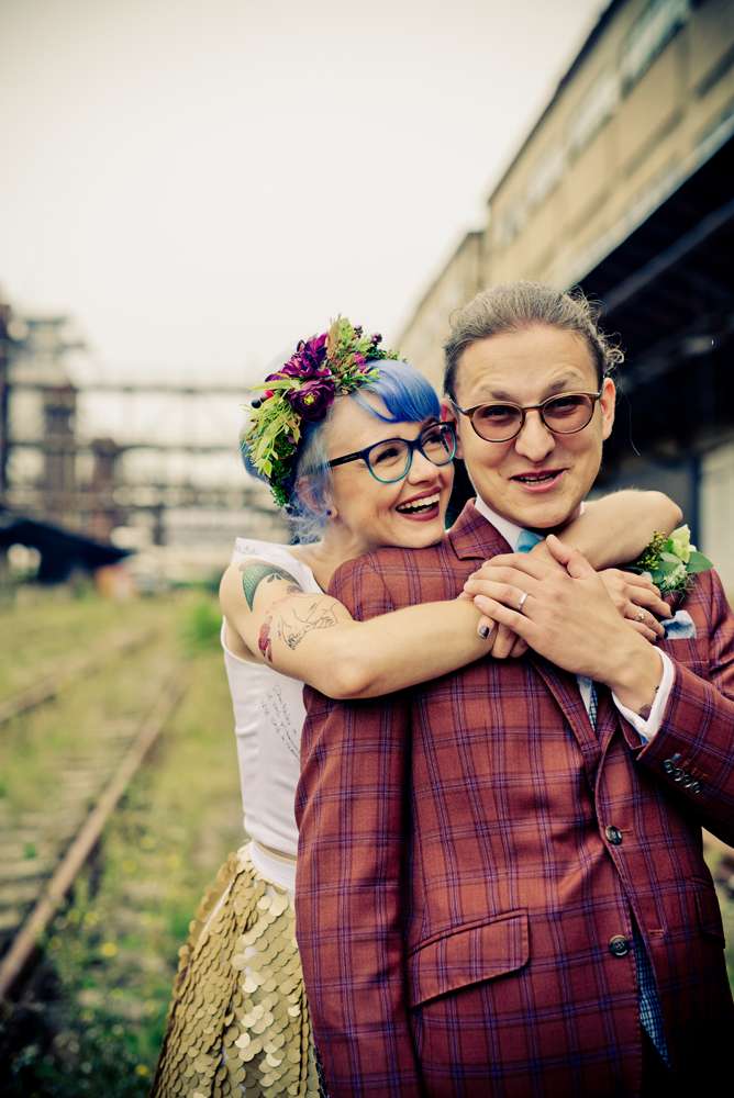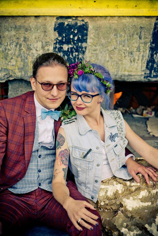“The ceremony was set outside, it was really fun!”, began Tereza. “We met with our officiant few days before the wedding in a pub, we got drunk and he asked us all sorts questions about our relationship and he made a lot of notes. His speech was awesome, very personal and everybody laughed. Also, a group of our friends put blue wigs on – it was a surprise for us and another hilarious moment of the ceremony! Instead of ring cushion, we had the rings ready on a heavy metal hand from Urban Outfitters.”
