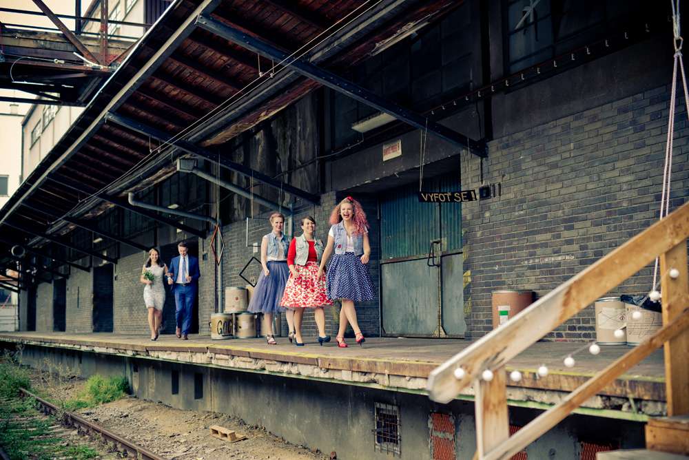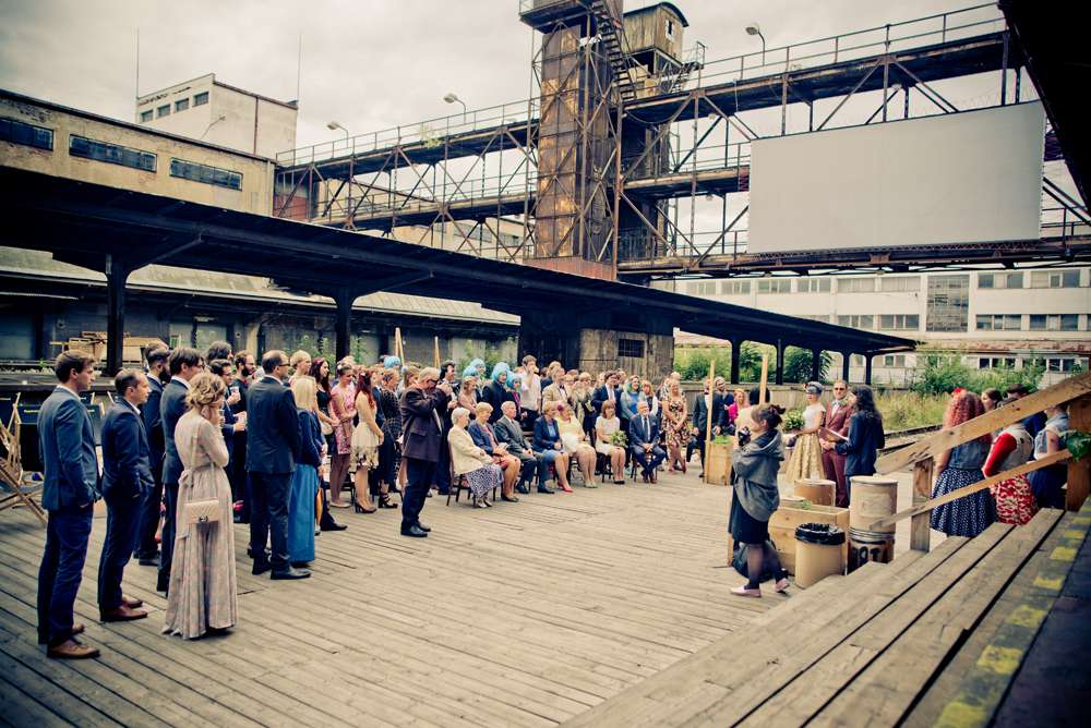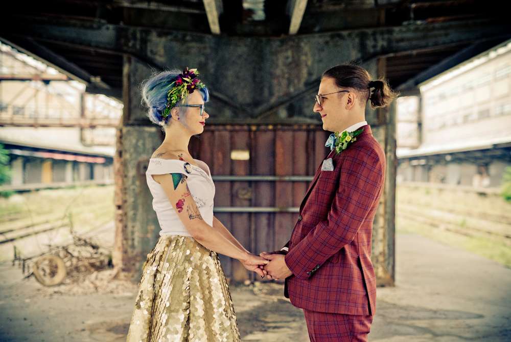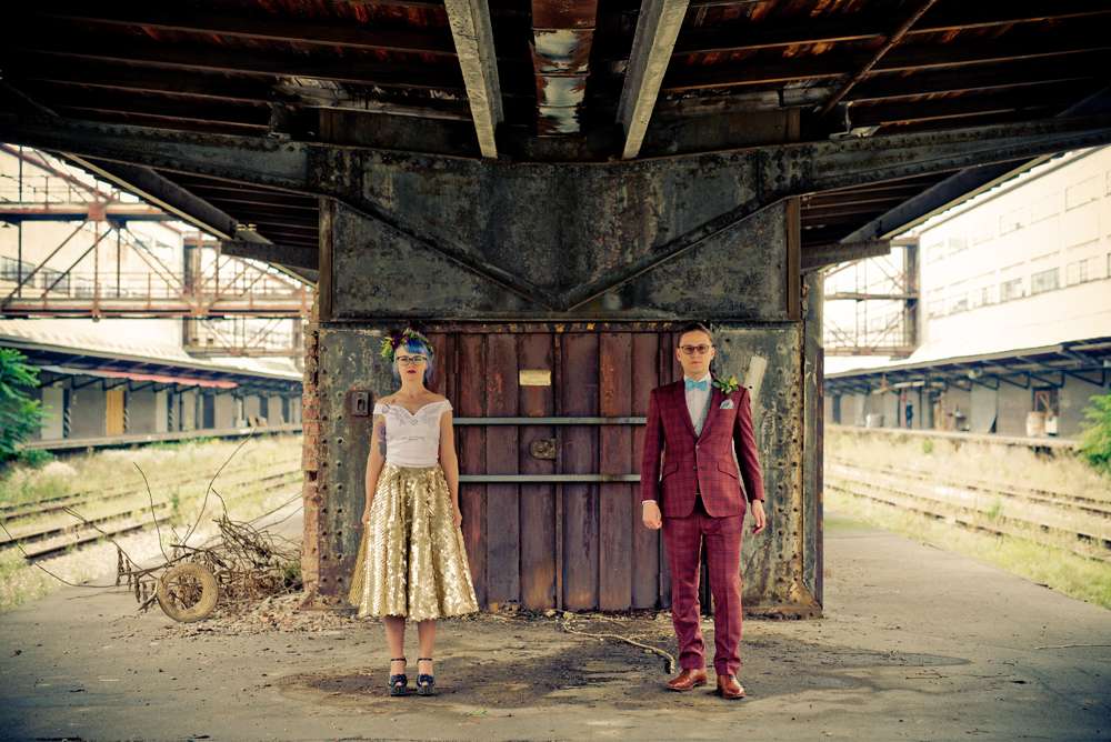 Tereza and Josef were married at an abandoned freight railway station in the Czech Republic! They had an outdoor ceremony followed by a reception full of all the things they love… and gold dinosaurs!