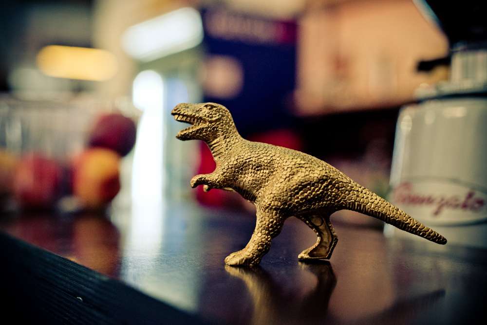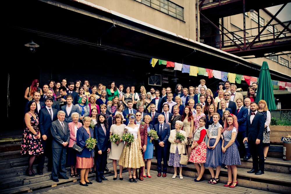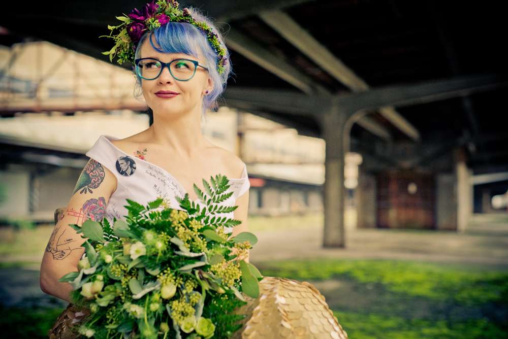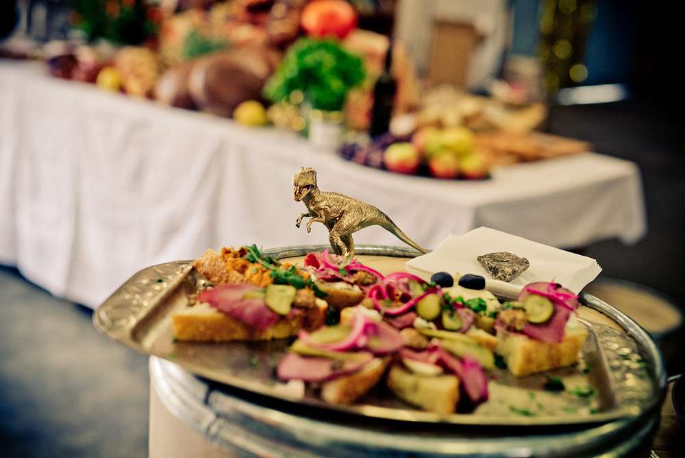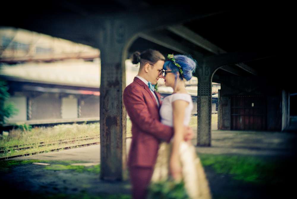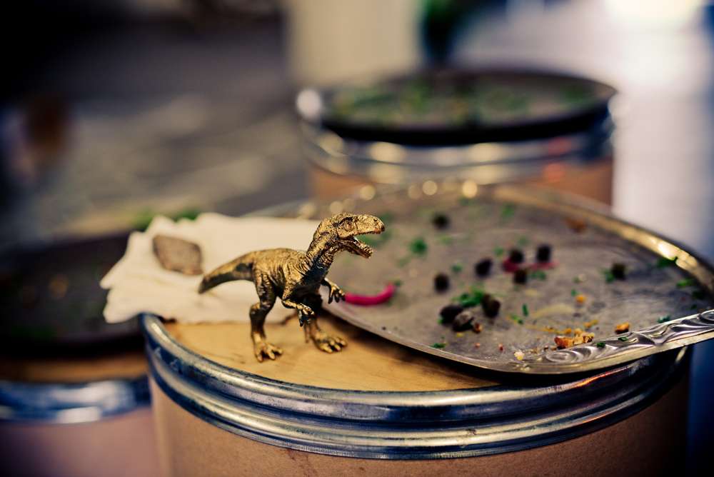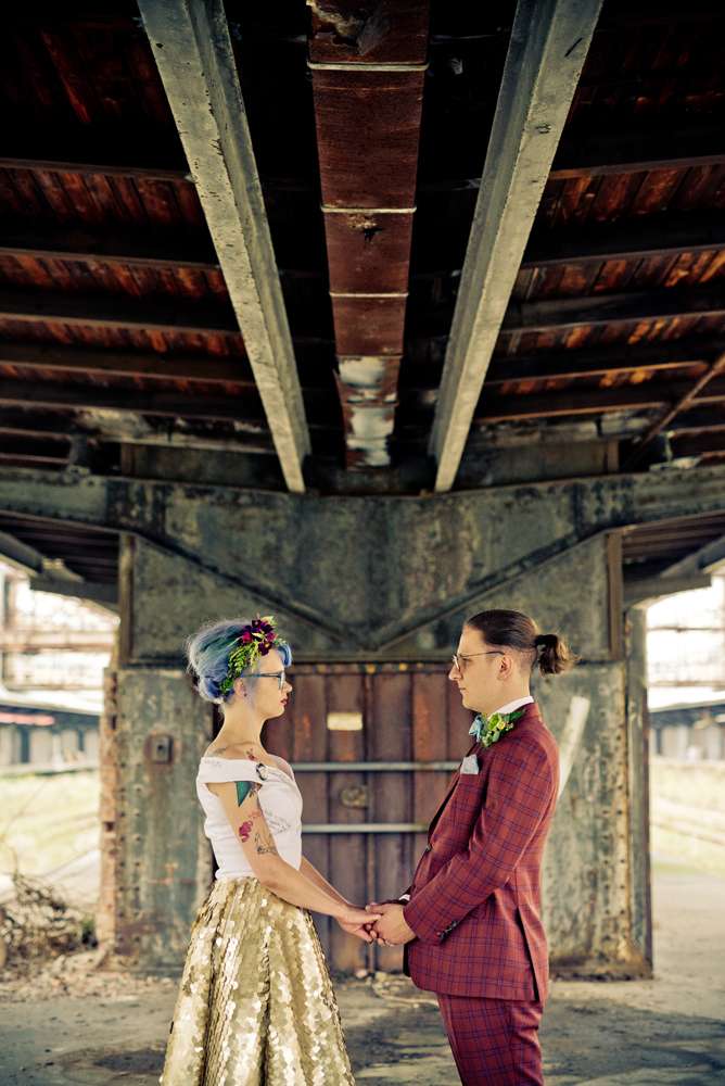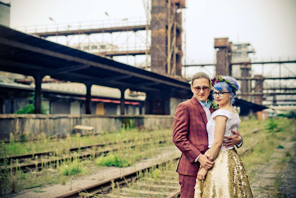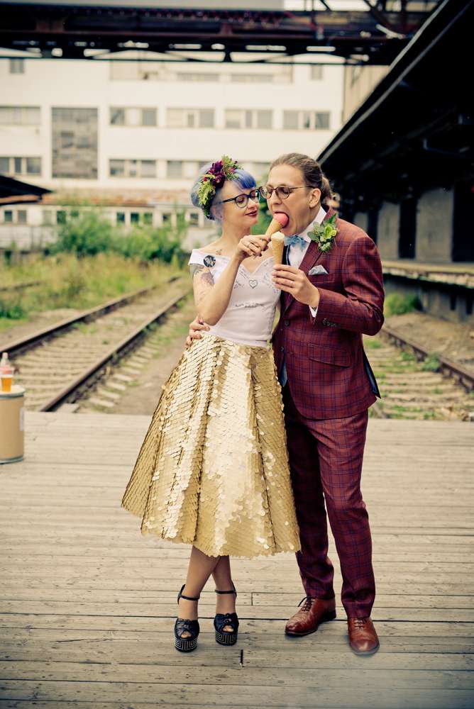 The day was inspired by all the things they love, and the bride got lots of different ideas from Rock n Roll Bride! “My style is Rock n Roll. It’s not just the fashion but all my life. It is freedom and happiness and little dirt and punk. So was the wedding. We love old abandoned factories and spaces of this kind. That is why we chose the railway station, so it was industrial. We also had gold dinosaurs. They matched with my golden skirt, and by the end of the day all dinosaurs were stolen by the guests! Five days before the wedding I woke up with the idea of having gold dinosaurs at the wedding. So I visited about five shops with kids toys and bought all the plastic dinosaurs they had and then sprayed them gold. We also asked two of our friends to draw big Stegosaurus on the floor of the venue. It was fenced with police tape, so it looked like the shape of a dead body of the Stegosaurus.”