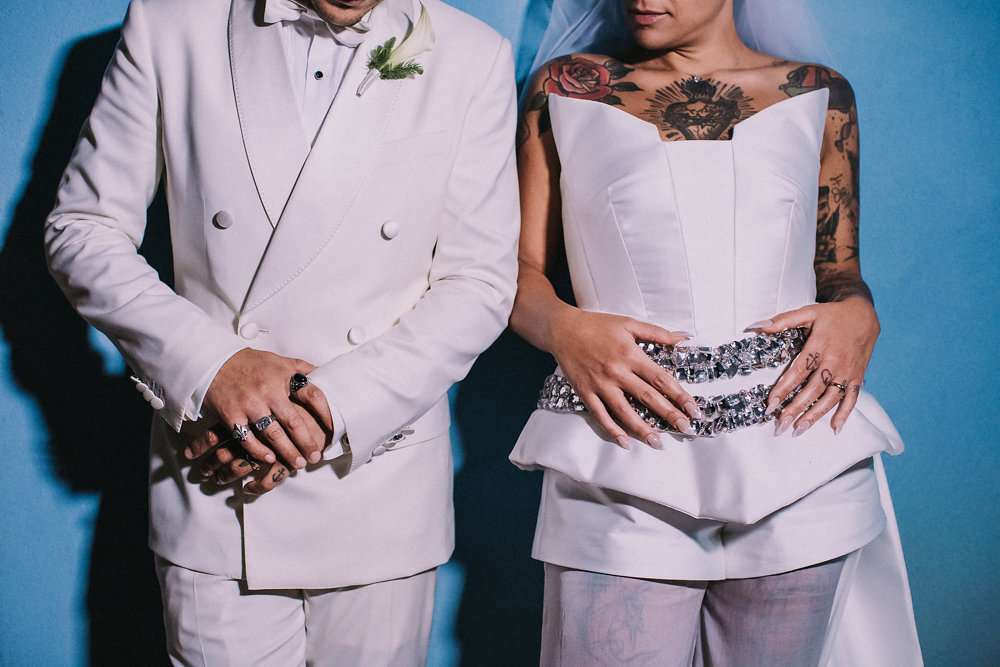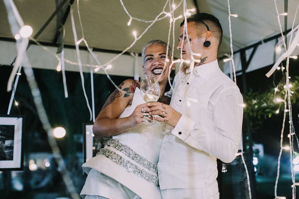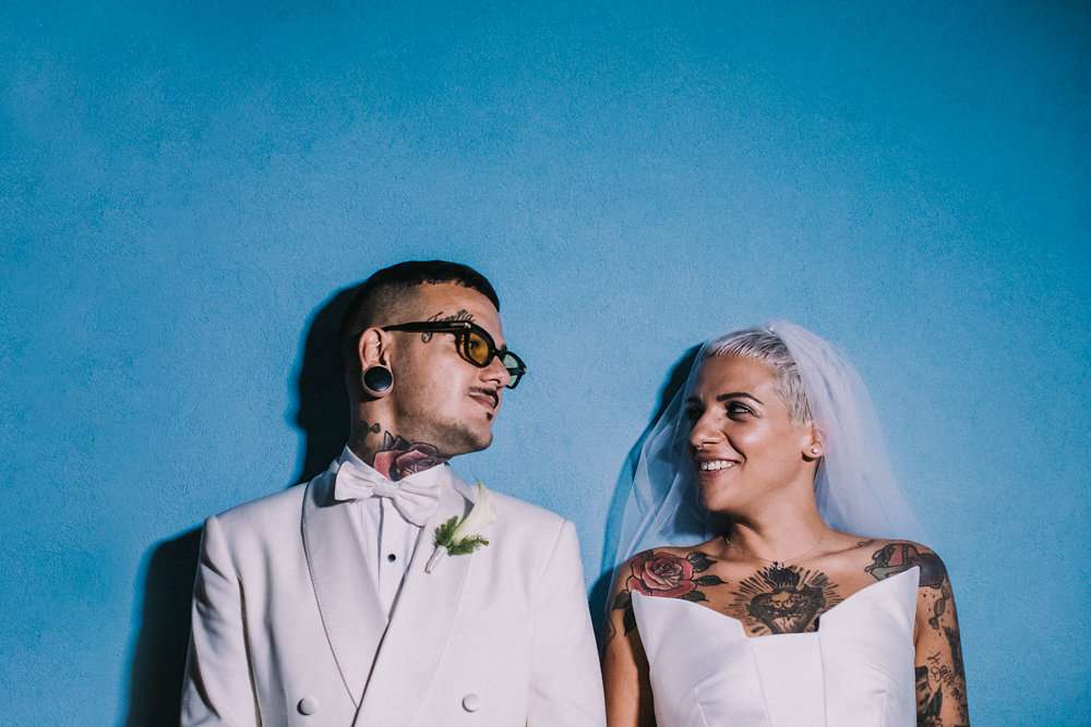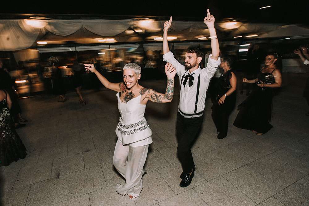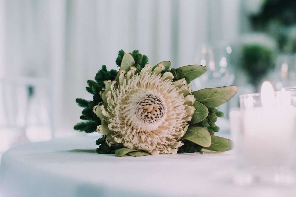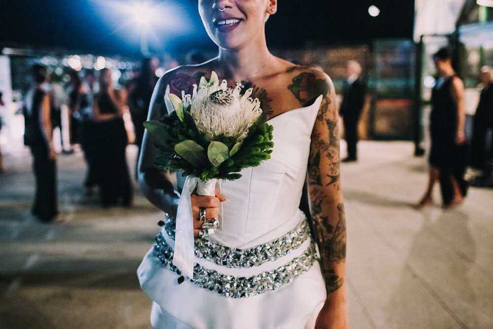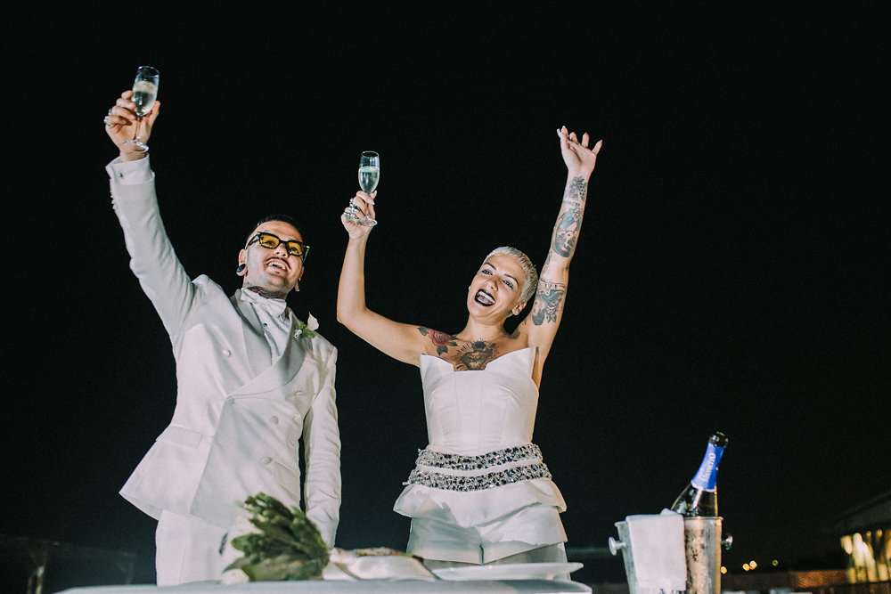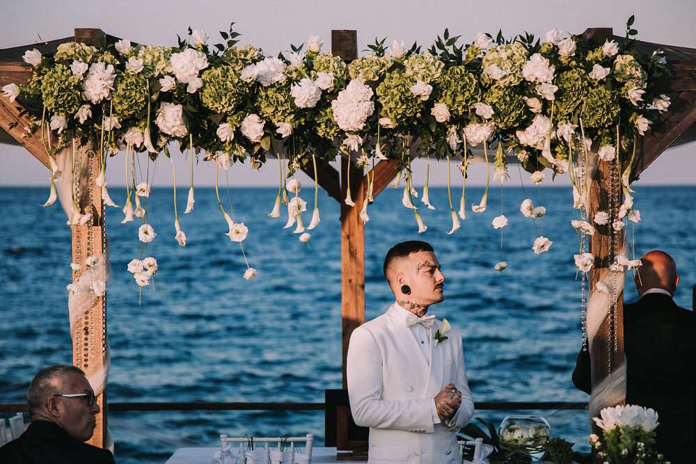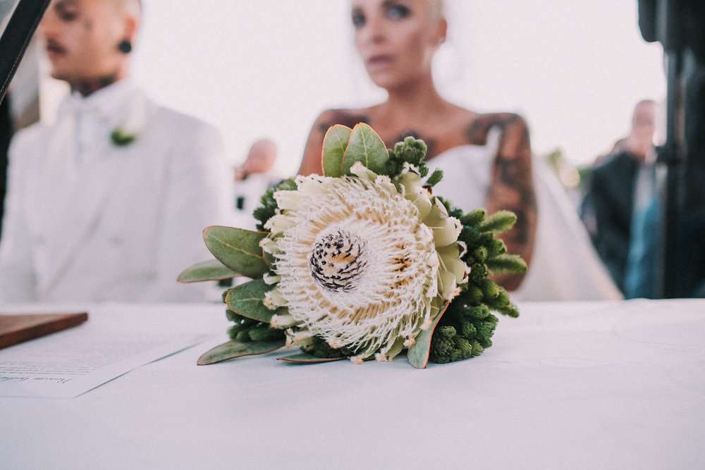 The bride’s arresting dress was from London-based Italian fashion designer Ilaria Lepore, which she wore with Saint Laurent shoes, carrying a single Protea flower as her statement bouquet. The groom’s white suit came from Dolce & Gabbana and was teamed with Paul Smith shoes.