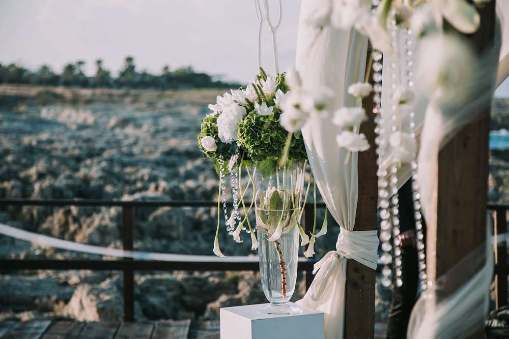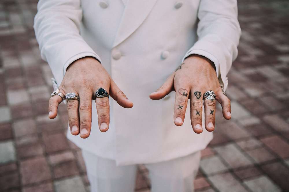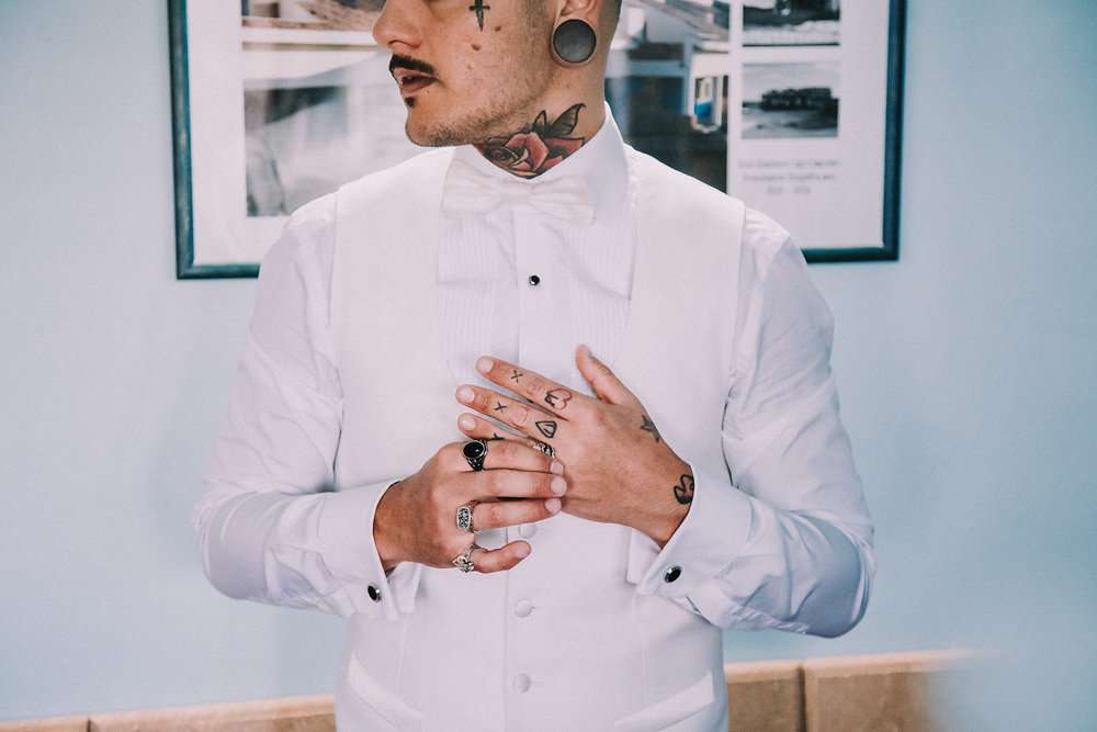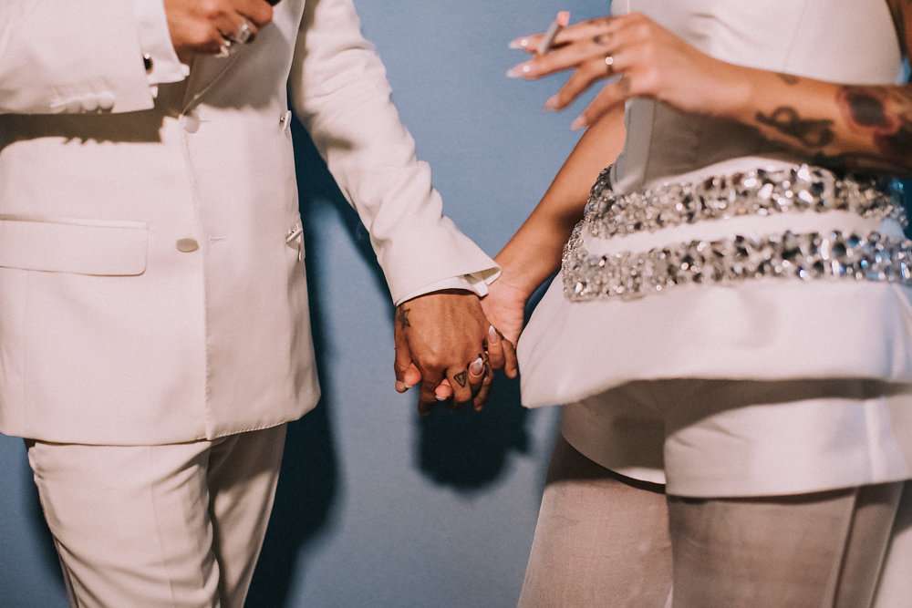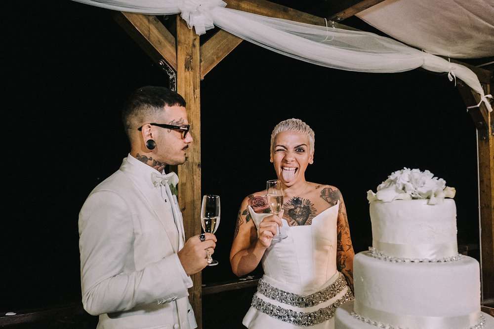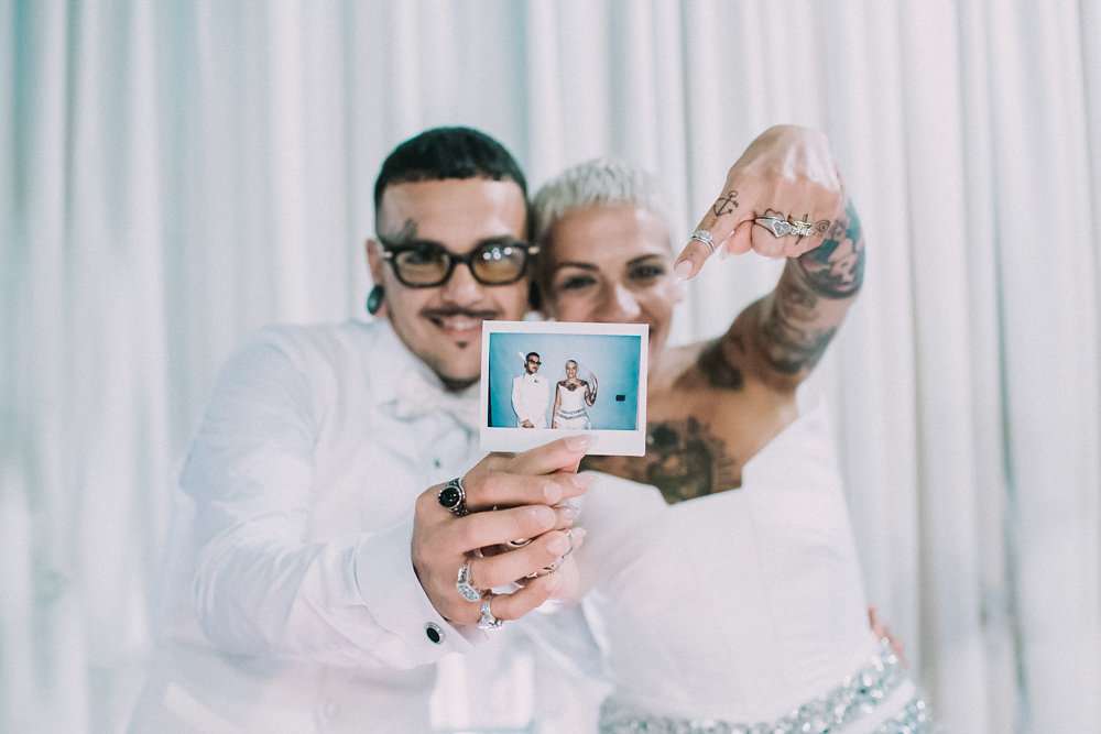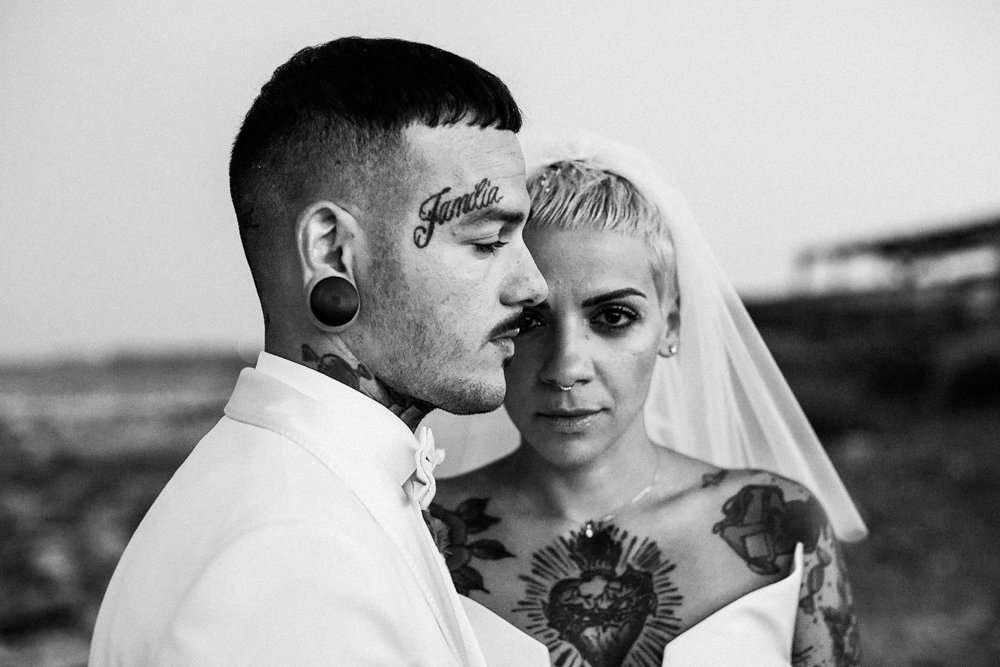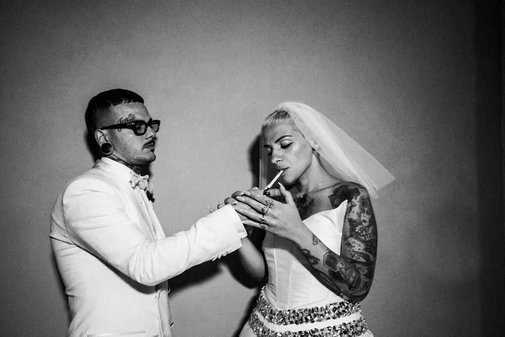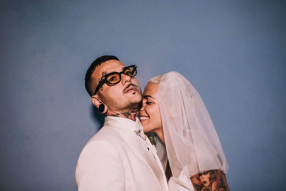 The bride’s arresting dress was from London-based Italian fashion designer Ilaria Lepore, which she wore with Saint Laurent shoes, carrying a single Protea flower as her statement bouquet. The groom’s white suit came from Dolce & Gabbana and was teamed with Paul Smith shoes.
