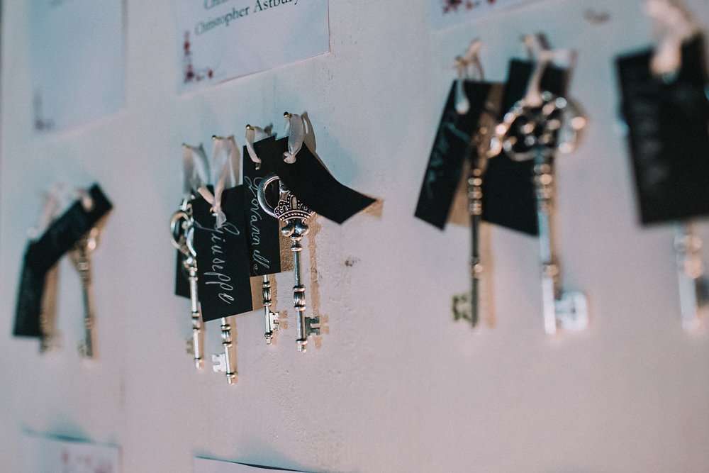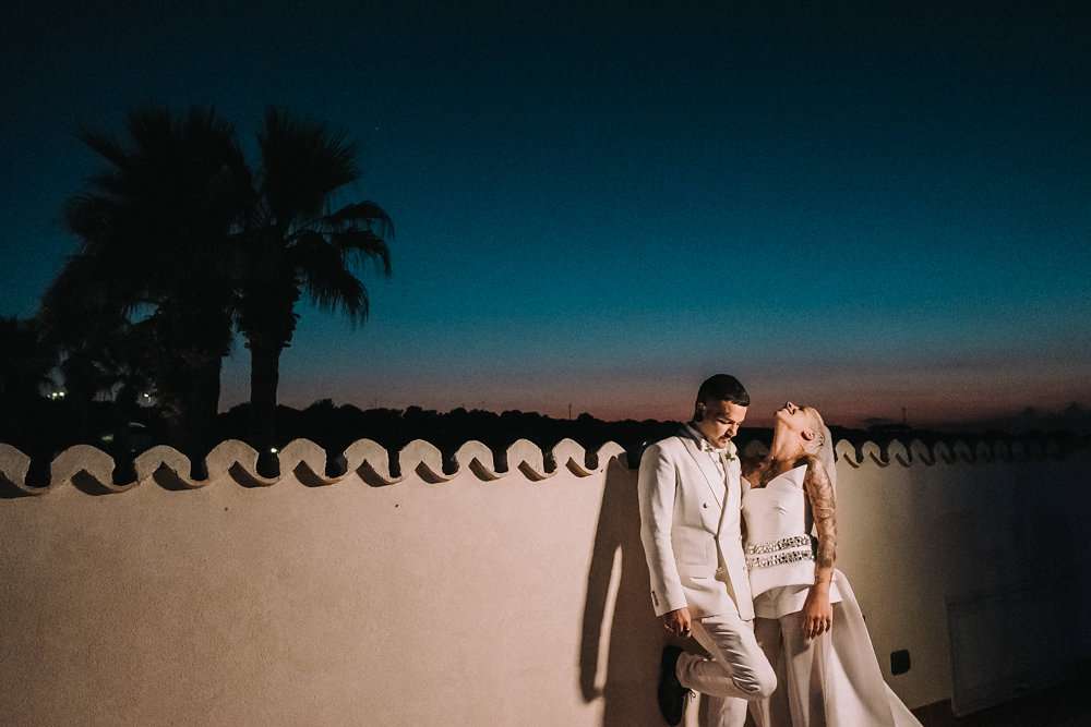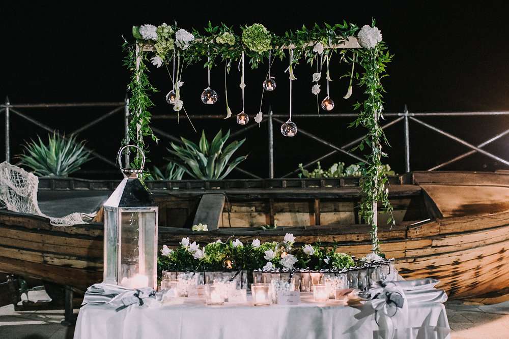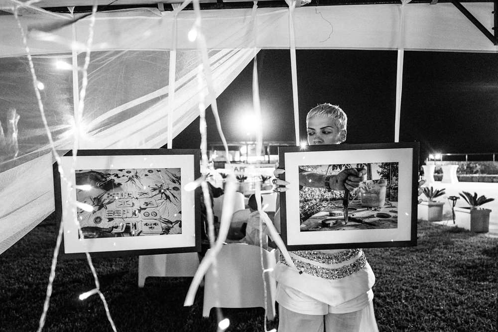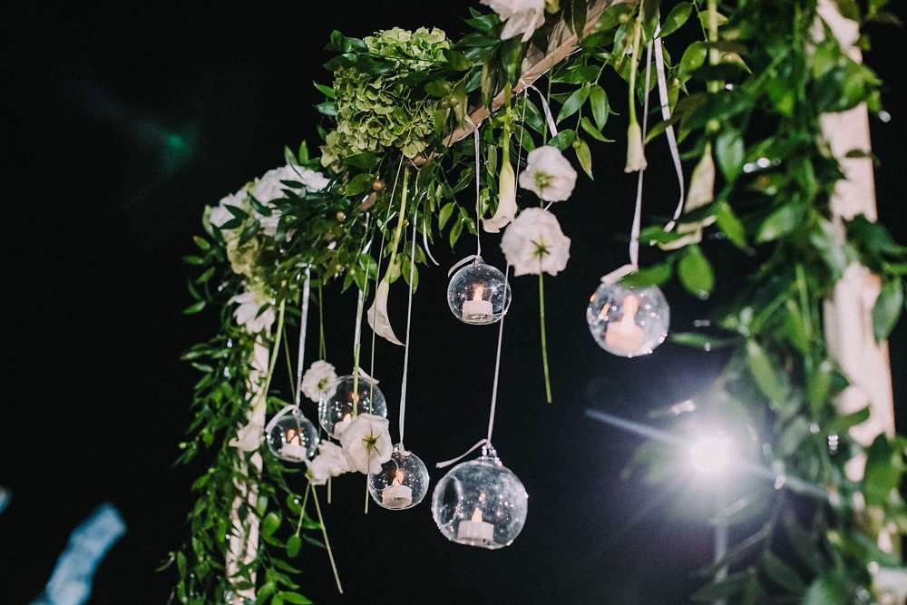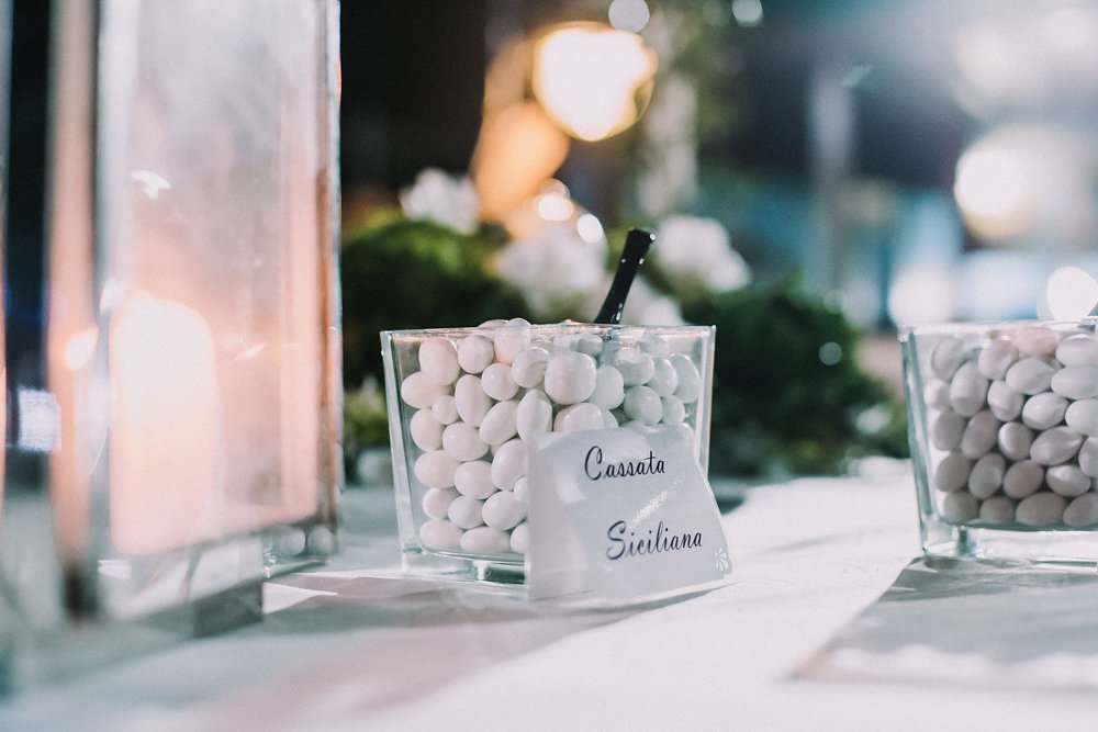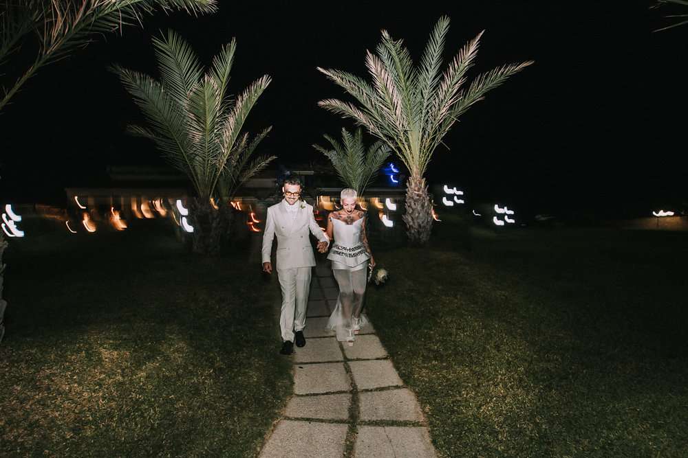 Their wedding was celebrated at sunset at the glamorous Hotel Capo Campolato, with friends travelling from all over Europe to dance and have fun with the couple. Hanging glass baubles filled with candles, suspended amongst calla lilies and lisianthus on an archway, gave the day a really enchanting feel. Place names were attached to little keepsake keys for their guests. Nearby, there was a street photography exhibition by Salvuccio Cappello, which entertained the guests as well as their DJ Gabriele D’Assisti, who kept everyone dancing and having fun all evening. Candles and lights festooned the tables into the night, extending the twinkly magic.