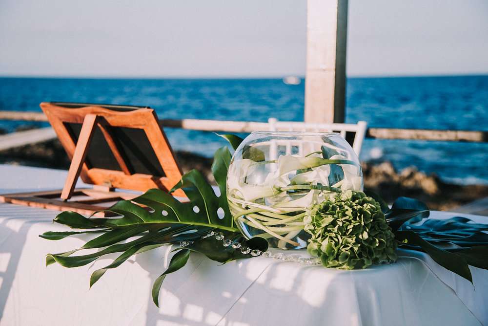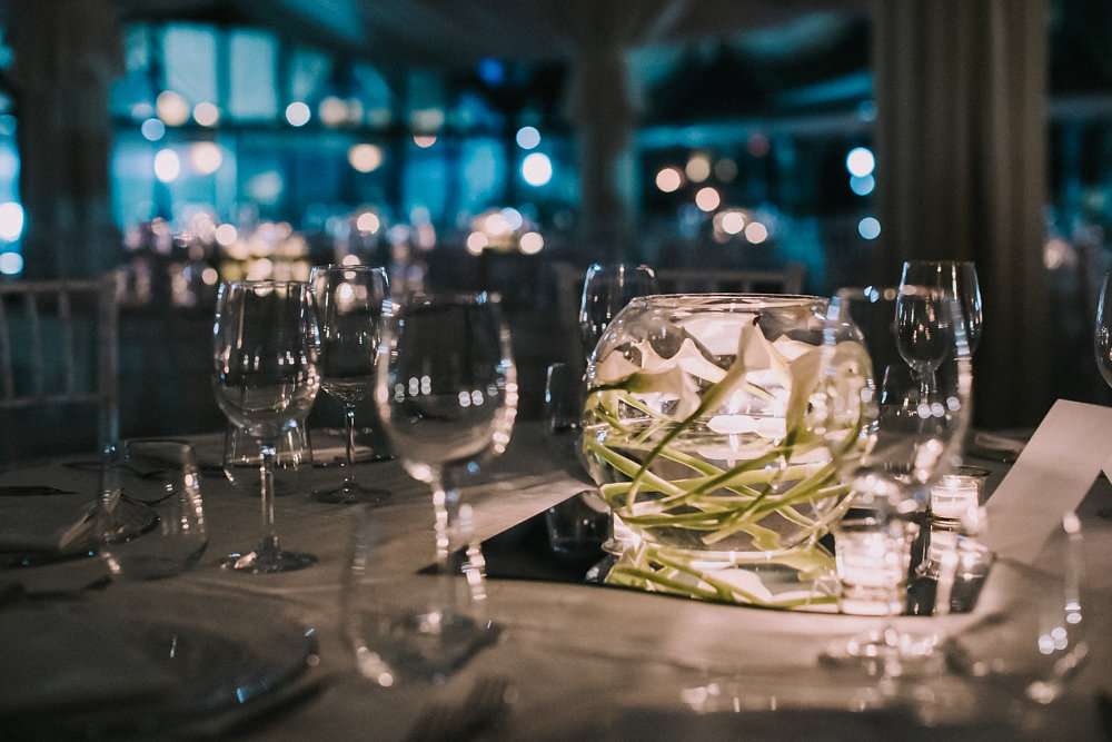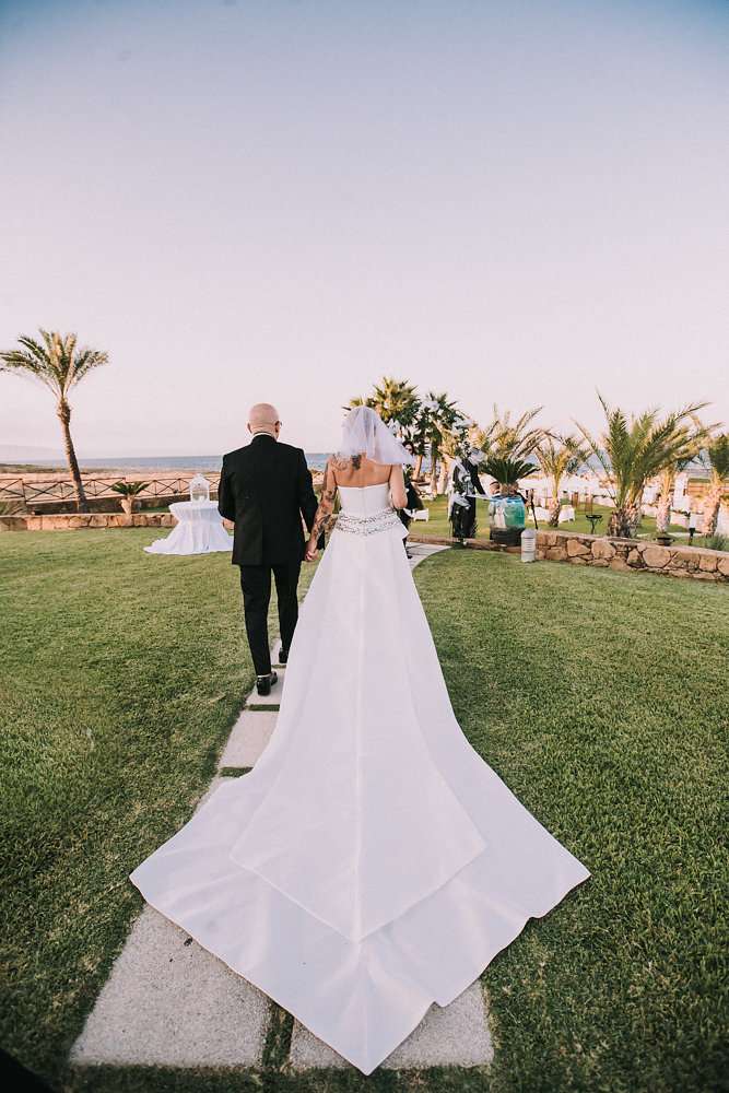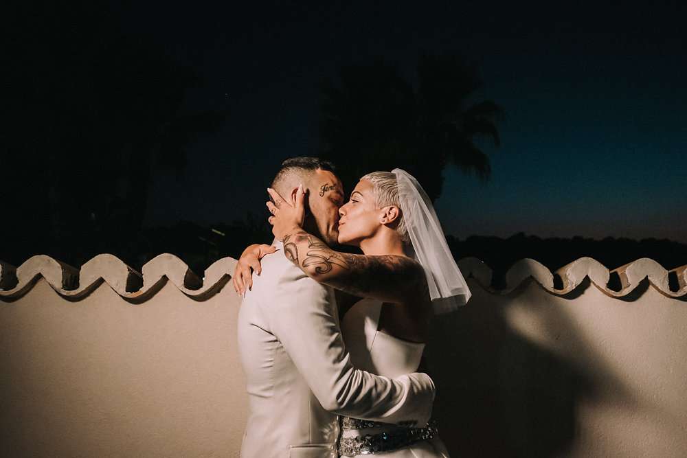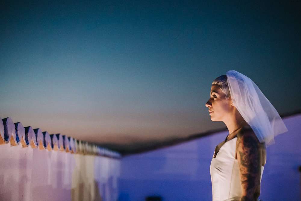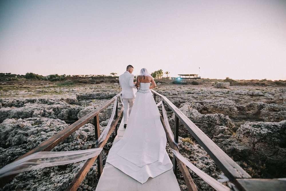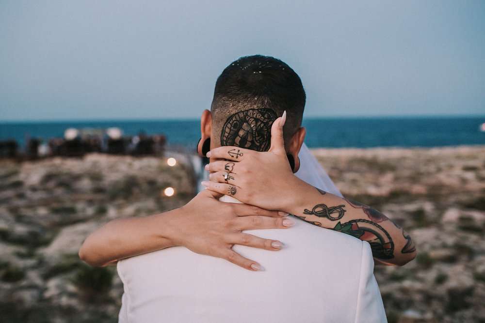 Their wedding was celebrated at sunset at the glamorous Hotel Capo Campolato, with friends travelling from all over Europe to dance and have fun with the couple. Hanging glass baubles filled with candles, suspended amongst calla lilies and lisianthus on an archway, gave the day a really enchanting feel. Place names were attached to little keepsake keys for their guests. Nearby, there was a street photography exhibition by Salvuccio Cappello, which entertained the guests as well as their DJ Gabriele D’Assisti, who kept everyone dancing and having fun all evening. Candles and lights festooned the tables into the night, extending the twinkly magic.