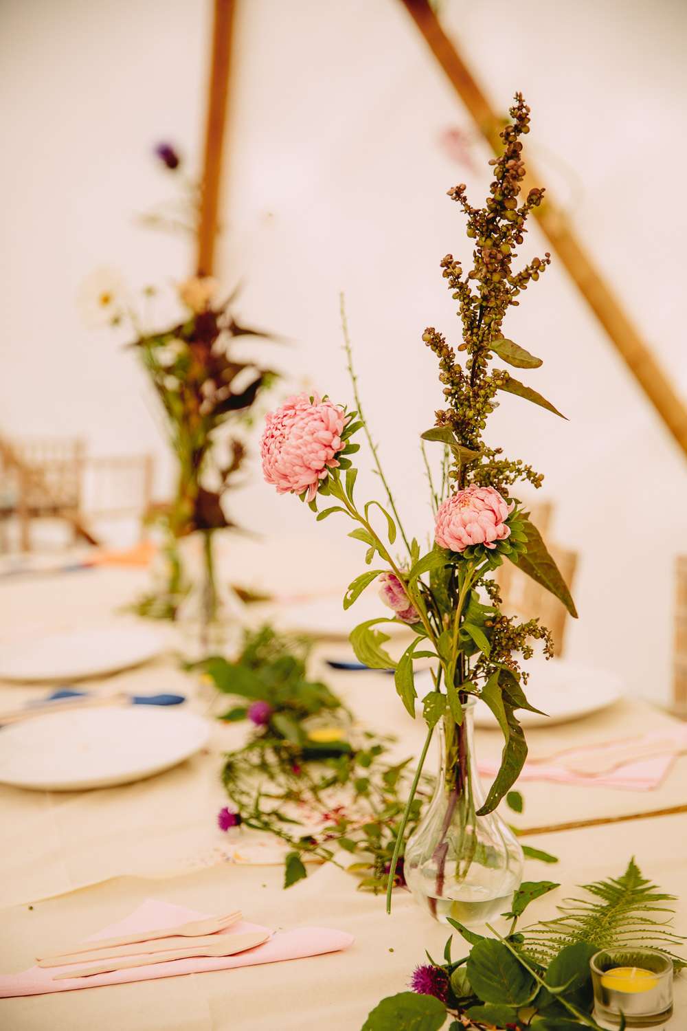 The reception was held in a dome shaped permanent marquee on the estate. “I made our invitations and origami dinosaurs to string up in the dome”, she continued. “I also knitted lots of little animals to go on the tables and then forgot to bring them! My bridesmaids and I did the flower arrangements including the bottles in the tree. I also made necklaces for my bridesmaids to wear and we decorated our own shoes for the day.”