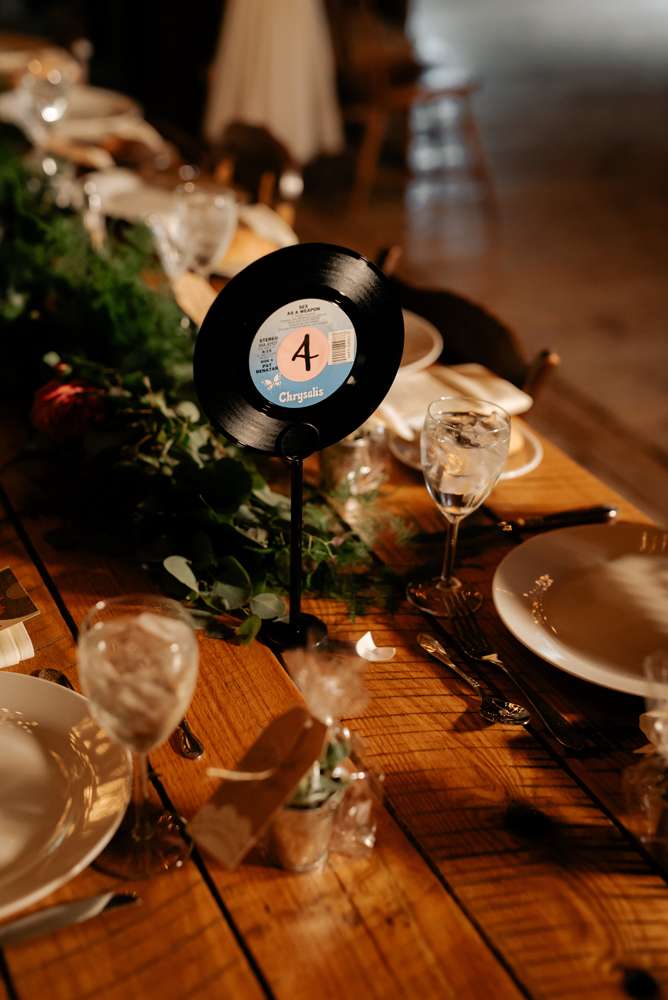 The majority of the reception decor was DIY, except the beautiful flowers which were provided by Desiree Dean Designs. “Brian is a freelance graphic designer and he designed our ceremony programs and menu cards, as well as our ‘wedding welcome sign’, which became the logo to our day. He made a custom sign with our illustrations, based off of the cover artwork to The Descendents album Milo Goes To College. We had the illustration made into vinyl stickers for our guests as well, and even got matching tattoos of it on our honeymoon! To further the music theme, we collected vintage 7” records from antique shops for our table numbers, and had stickers made in our colour scheme with each number, that we stuck in the centre of the record.”