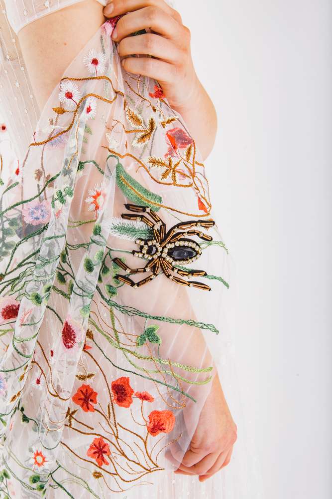 The Secret Garden veil comprises of delicately embroidered flora and fauna on ivory tulle and hand-sewn jewelled bugs, bees, flies and spiders throughout. Perfect for babes who want that cute but creepy vibe. Insects can be added to or removed on request. Available in 150cm/ 59” length only.