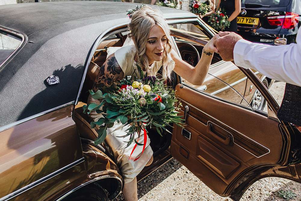 “There really was no big expenses, we literally saved money at every opportunity, My dress was vintage and cost £850, Stephen’s suit was in the sale on ASOS, the bridesmaids and groomsmen all brought their own outfits which was amazing of them and I let them pick whatever they wanted. A dear friend of us lent us their Ford Cortina and even drove me to the church as a favour, a client of mine who’s family own a catering company lent me black table cloths, I brought props and decorations from charity shops, I found an amazing drinks trolley for £10 which was turned into a whisky and cigar station. Our neighbours made our wedding cake and friends and family all brought homemade cakes along with them for desert.”