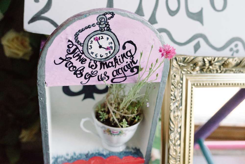 “We made the invites, lots of decorations, tea cup candles, cake stands and the order of service”, she continued. “We also had home made ‘Eat Me’ and ‘Drink Me’ favours. My grandfather made a lot of cheeseboards as well flamingo croquet bats.”