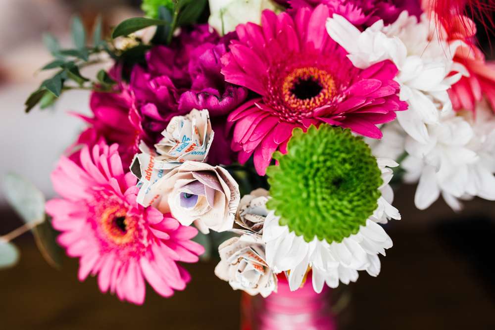 Their biggest expense in the €10,000 budget was by far the food, and because it was a small budget, they had to get creative with the order of the day. “Our guest list was really hard”, Bren said. “We were intent on having everyone we wanted there, but had a tiny budget, so we did things a little differently with the small ceremony and dinner with about 70 guests at the country pub, then from 6pm the massive party with around 200 guests at the nightclub. We did our speeches, cake-cutting and first dance with our bigger crowd so it still felt like they were very much part of the day, but we saved on providing the meal. There was, of course, wine, cake and DiFontaine’s pizza provided later in the evening. We really saved money on flowers, too. Neither of us were picky about what flowers we had, and they were bought at Moore Street Market and Aldi and arranged by friends. The bridesmaids were making their bouquets minutes before the ceremony! My bouquet was created by our friend Vicky, who took items significant to us and incorporated them into the bouquet. It had old cinema tickets fashioned into flowers, and pieces of jewellery from family and friends.”