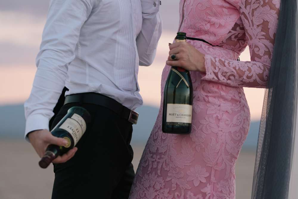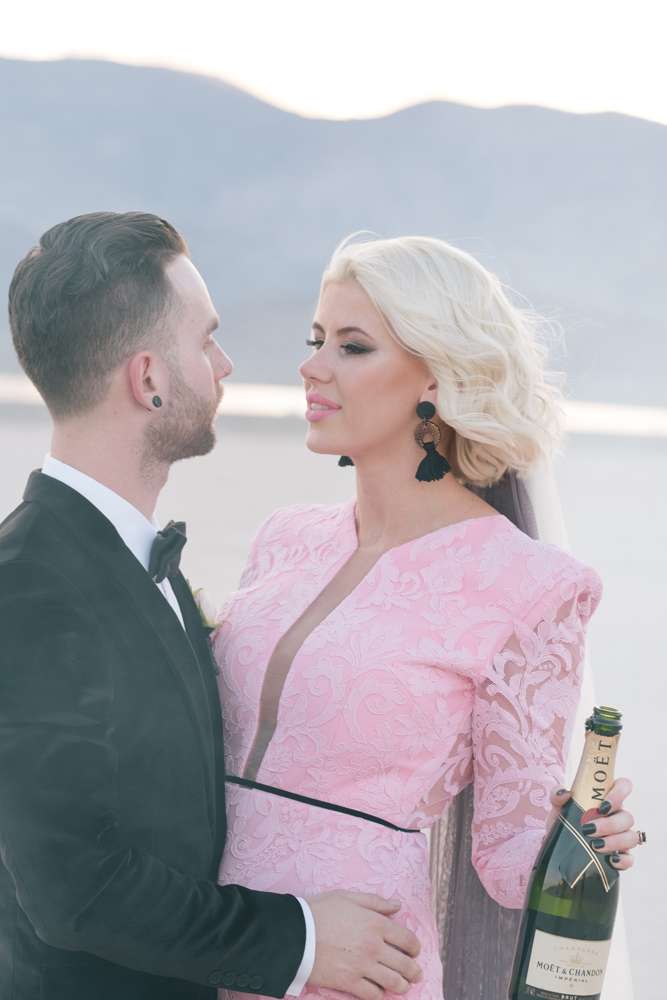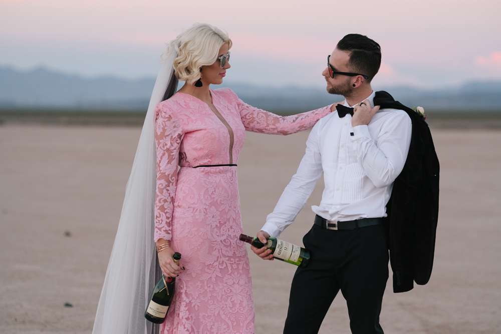 The ceremony was a small and intimate affair at Eldorado Dry Lake Bed, about 45 minutes out from the Strip, at sunset. Just the two of them, their photographers and officiant were there and after the vows they let off smoke bombs and drank Chandon from the bottle! The bride said, “Eloping and avoiding the traditional type of wedding made it more about just the two of us.”