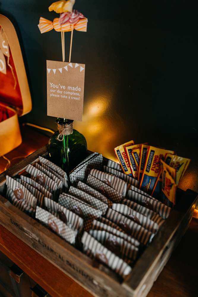 “The majority of our wedding was filled with DIY projects from the retro sweet favours to our vintage bottle decorations. However we were particularly proud of a ‘DIY dance floor’ we created on the floor of the pub using some cool £1 tape.”