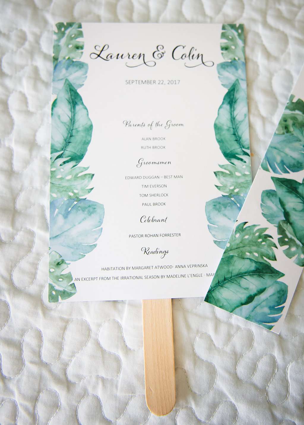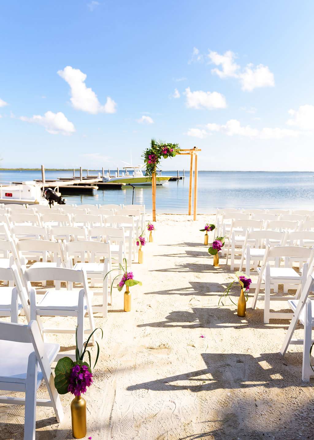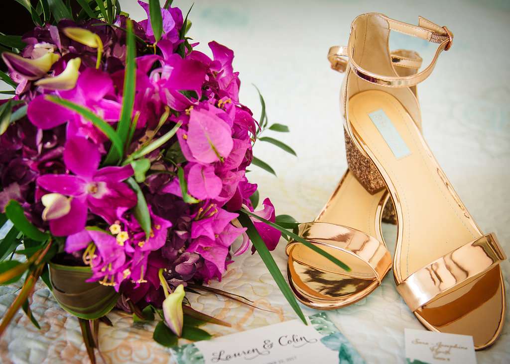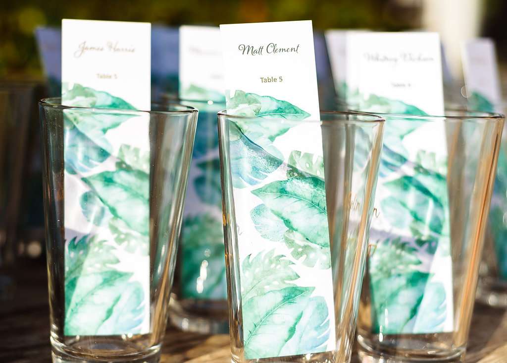 The wedding was held at Kaibo Restaurant, Beach Bar and Marina which has the most gorgeous beach backdrop. “Our wedding theme was ‘Tropical Glam’”, said Lauren. “The inspiration for our wedding was actually a piece of fabric. I saw this gorgeous turquoise fabric with monstera leaves on Google images and thought, ‘Oooh that would make a lovely table runner’, and the whole thing spun out from there. We knew that we wanted our wedding to have a tropical vibe, but as we were already having it on a beach we didn’t want to go too kitschy. Instead of seashells we decided to go for bright tropical flowers and beachy greenery with décor in shades of turquoise (reminiscent of the ocean) with metallic gold for a hint of glam.”