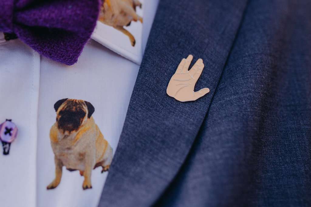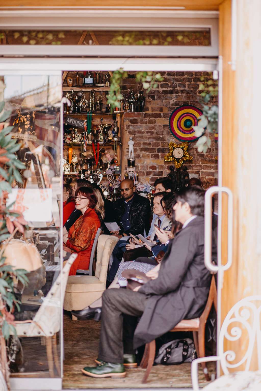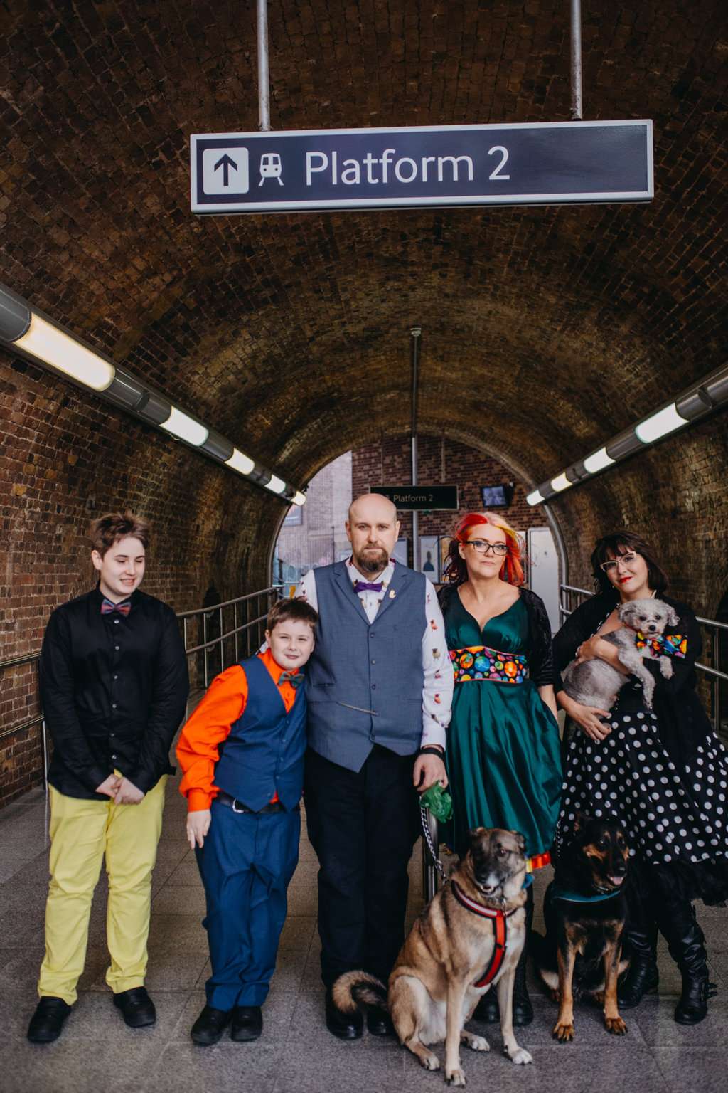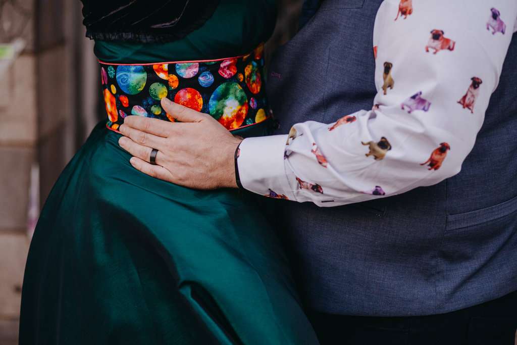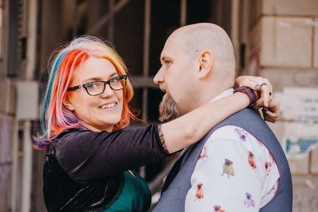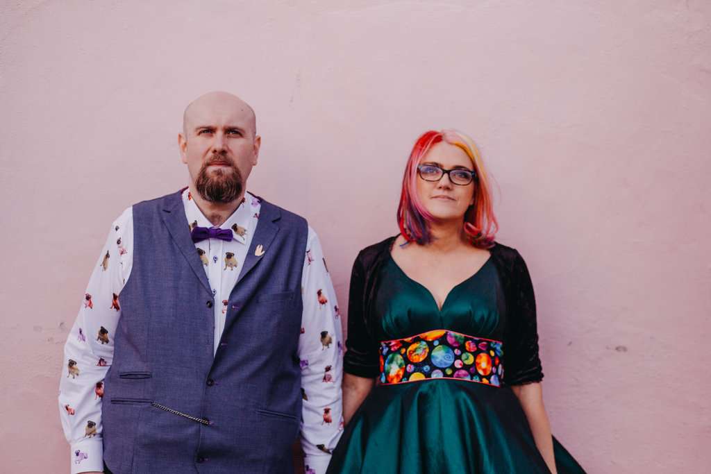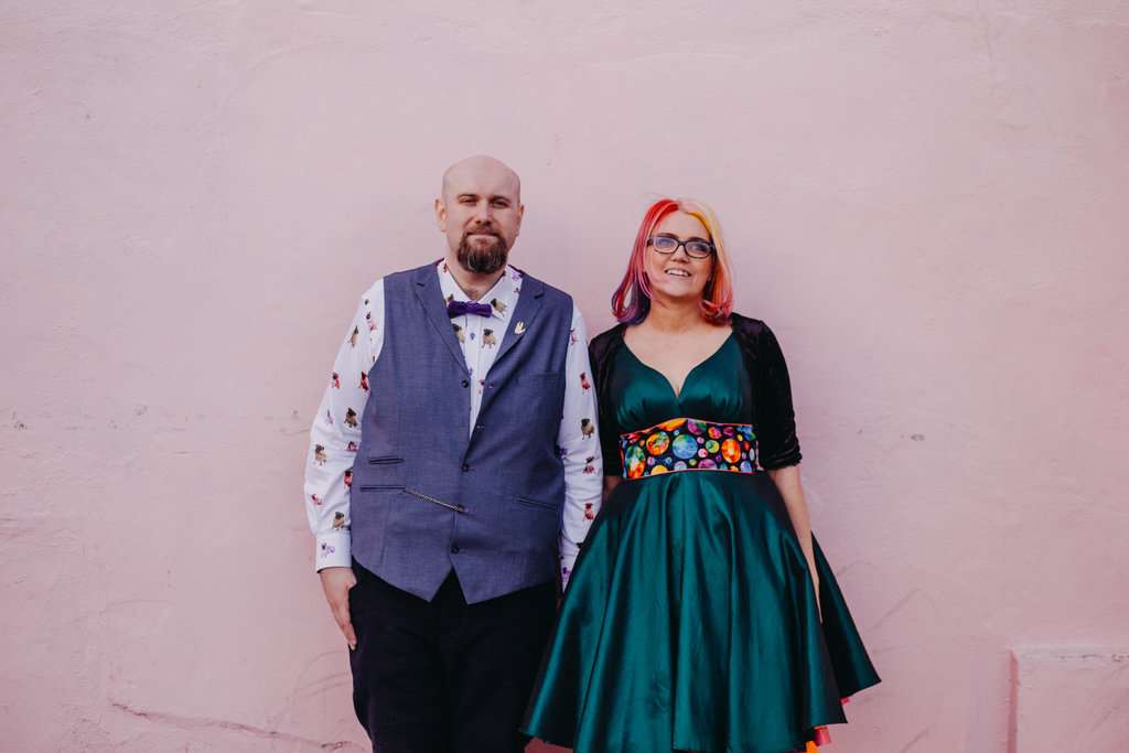 “Our wedding was a rainbow heavy metal disco with a science fiction twist… plus dogs!” began Shannon. “We were inspired by so many people, things, and events, but mostly music, bunting, food (we are both vegetarian so we wanted all the food to be both vegetarian and delicious) and Deptford, where we live  We love our neighbourhood! It can be rough around the edges and has a less-than-polished reputation but we love it just as it is. It’s vibrant, colourful and multi-cultural. We wanted to make Deptford the star of the show. We used local merchants and venues wherever possible. We created a Deptford prize pack with local goodies, artwork and craft beer for the winner of our pub quiz.”
