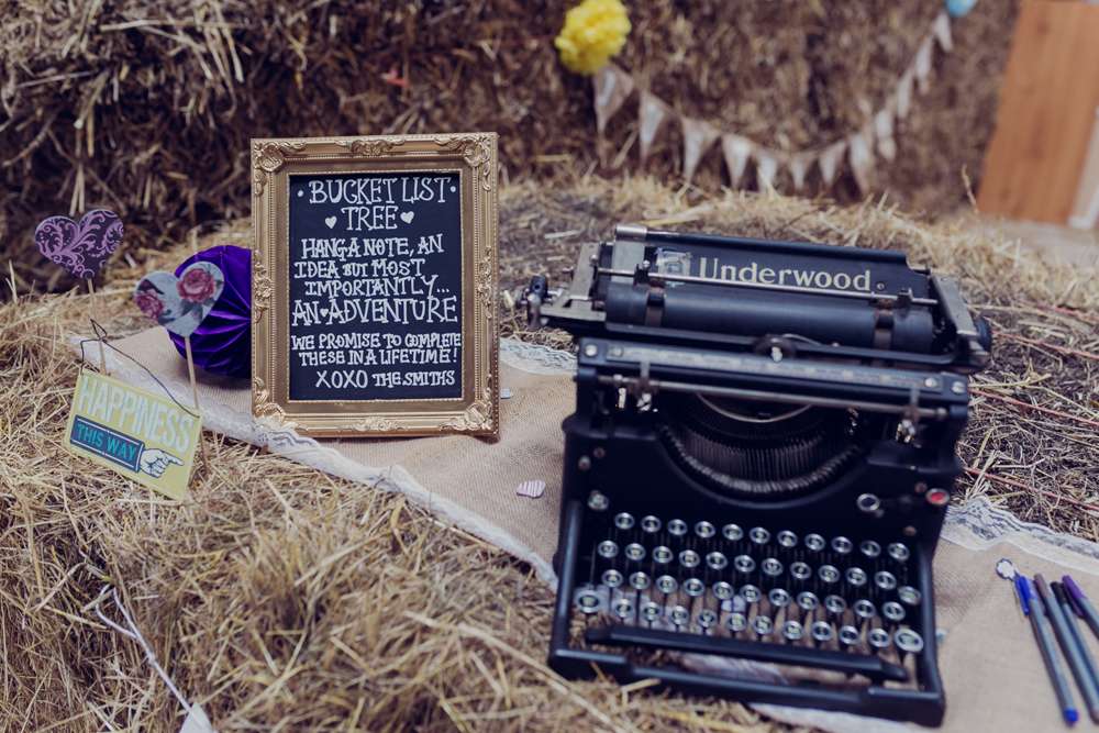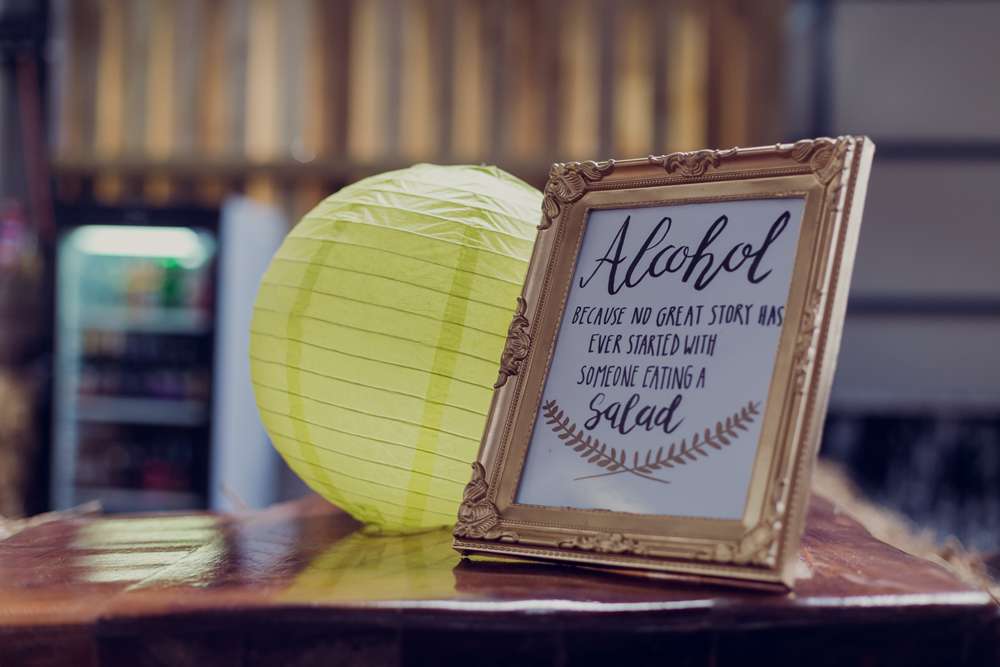 “Our whole wedding was a DIY project!” continued the bride. “For the entire time we were engaged, we would constantly be bargain hunting and collecting vintage jars, vases, bottles, cake stands… you name it, we collected it. My sister, Beth, made 120 metres of beautiful bunting from vintage fabrics, and turned my mum’s living room into a factory; she was still sewing the day before the wedding! Trystan hand-painted a traditional tattoo design for each table to be used as the table numbers. We made a bucket list tree in which guests could add a wish or an activity for us to do as a married couple. I made mini chalkboards and spray painted loads of different vintage frames gold to make signage for all around the barn. Trystan painted and made all the invitations, save the dates and table names. As a tattooist, this was something he was really keen to do, to put across his love for the traditional tattoo style within them. We hand-stamped hundreds of tags for the favours and hand painted everyone’s names onto mason jars. We made the wedding archway, arranged all the flowers at the venue and decorated the venue from top to bottom – it was an empty cowshed at the beginning of the week!”