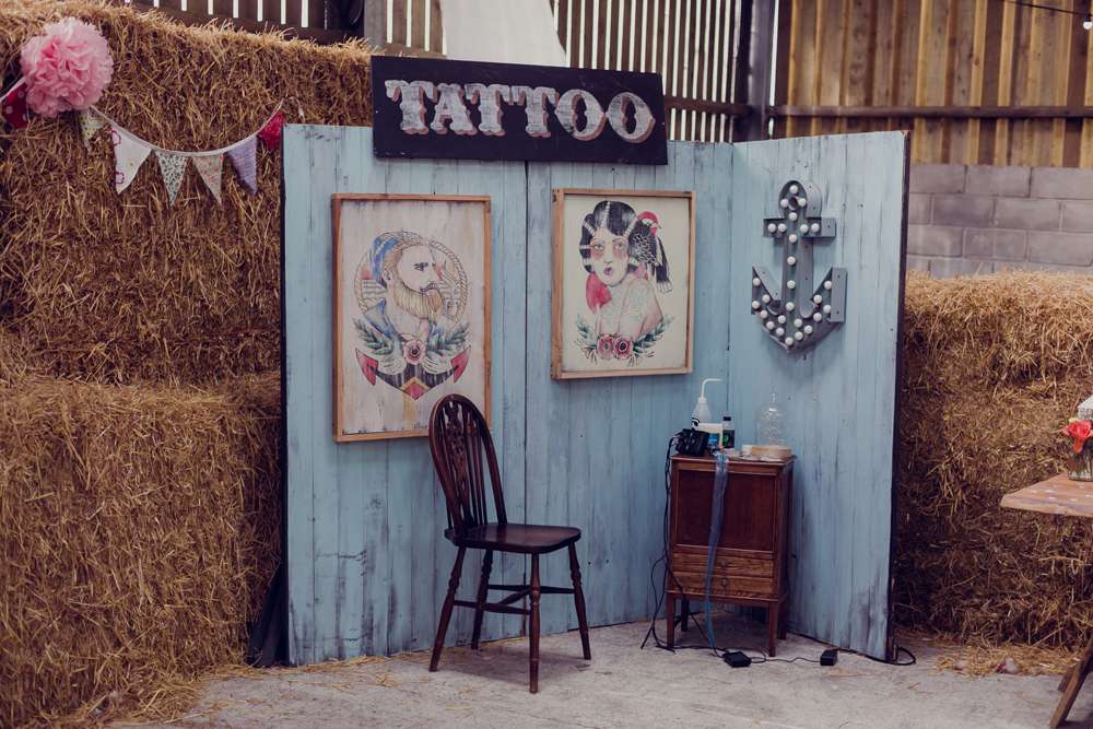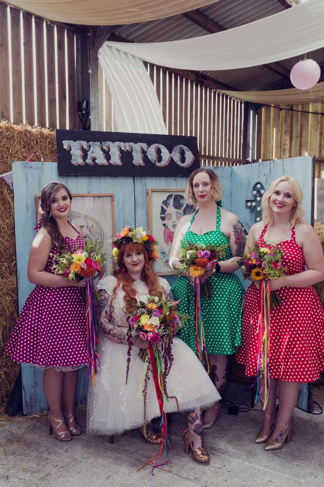 The couple described their wedding vibe as, “Traditional tattoo art mixed with bright, bold colours and a hint of vintage. Trystan is a tattooist, and we are both collectors of tattoos and tattoo art, plus we have spent several years travelling around getting tattooed by our favourite artists. We knew we wanted our wedding to reflect this about us as it’s a major part of our lives that we love. The best man and most of the groomsmen are all tattooists too, so it all came together very naturally. The day was a true reflection of who we are as people.”