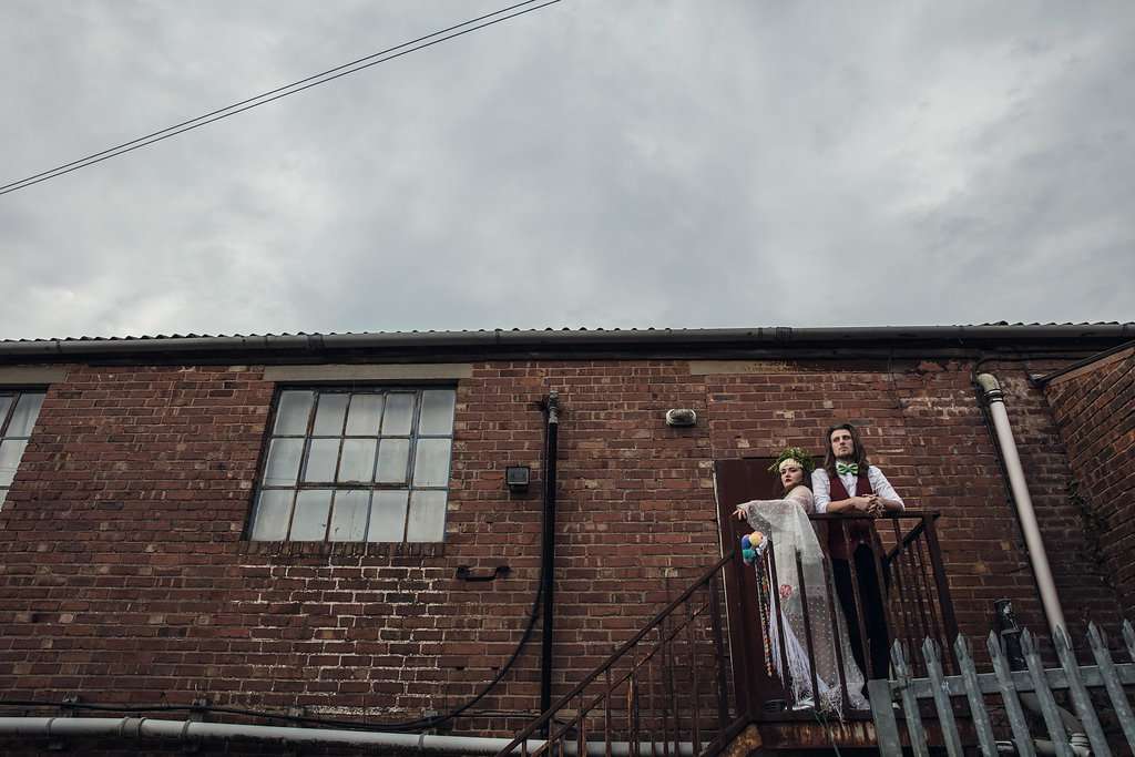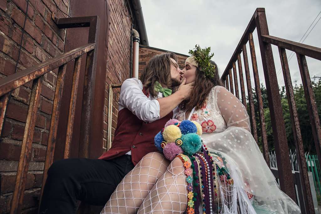 Alex also stayed true to his personal style on the day, and cut a dash in all high street attire. “We wanted a really chilled and REAL wedding, without the faff and fanciness that is expected, and we wanted to be comfortable in what we wore (this rule also applied for the guests as we opted to have a ‘no dress code’ rule so that everyone could wear whatever the hell they liked! If they wanted to dress fancy, they could, and if they wanted to dress more casual, that was cool with us! We just wanted everyone to be themselves.) With Alex being an avid wearer of skinny jeans, it would’ve been rude not to carry on the tradition on our wedding day! The jeans and shirt were from Topman, and we stumbled across the waistcoat in TK MAXX and it went perfectly with his green polka dot bow tie. We paired this with silver Converse, which are the only brand of shoes he ever wears! Plus they matched my Docs, to his surprise!”