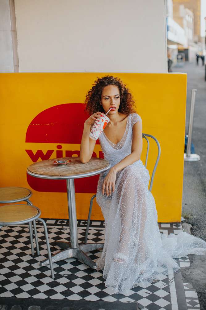 This was one of my favourite shots of the shoot, but unfortunately it didn’t work for the magazine spread. I think Margate must be one of the only places left with an operational Wimpy! Putting Nalu in front of it with one of the most glamorous dresses of the shoot was a stroke of genius from our photographer, Lisa. Dress is by Anna Campbell via The Bridal Edit and the shoes are Charlotte Mills.