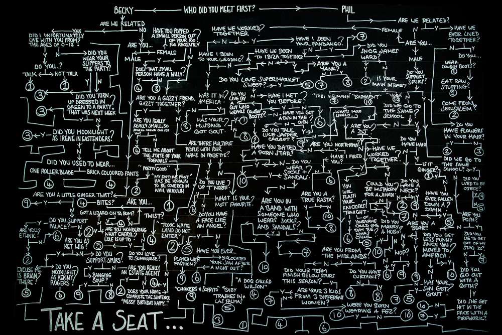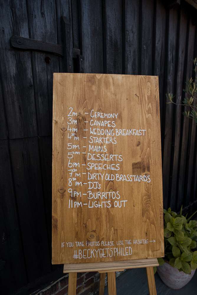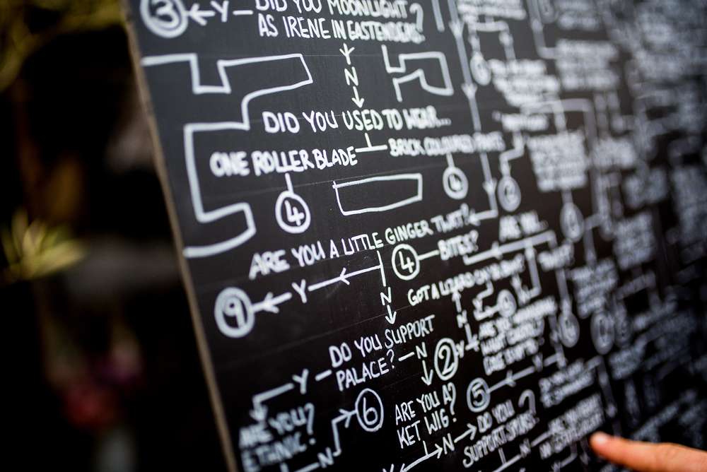Guests found their table via a giant handwritten flowchart through which they had to answer a series of questions. They include gems like ‘Did you moonlight as Kenny Rogers?’ and ‘Did you get less funny when you moved to America?’ (Seriously, if you have a spare minute, just keep zooming in on different parts of it, and you’ll keep getting different questions that’ll make you laugh!) That’s where the stationery ended though. “We didn’t have any orders of the day or menus laid out, as we knew no one really cares to take them home so it would be a waste of money. Instead of favours, we just had Paracetamol and rehydration sachets in bowls on the table for the next day’s headaches!”