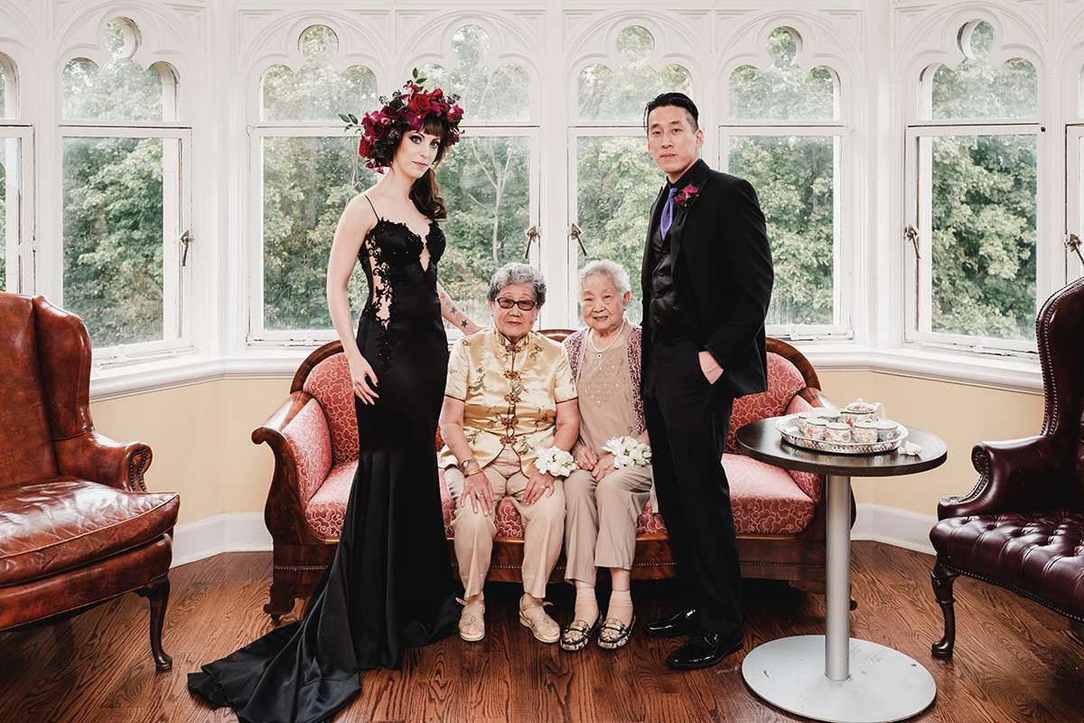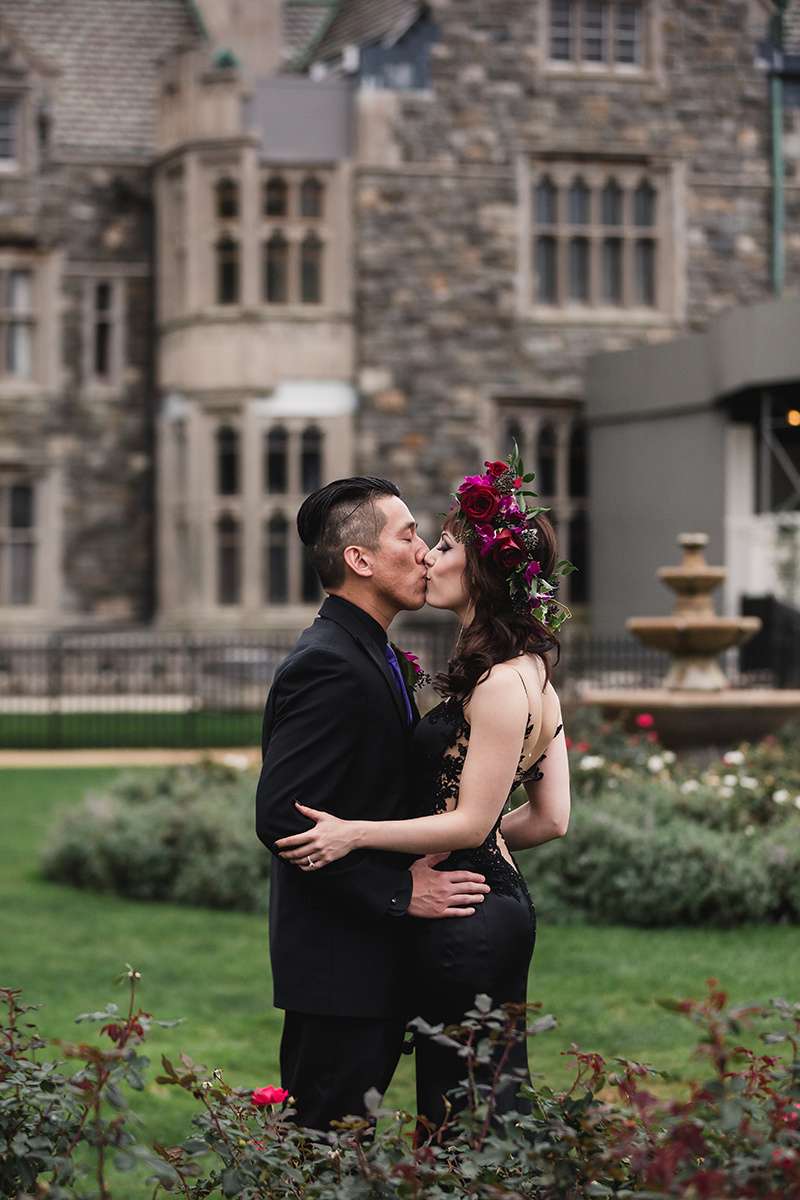 It was the same with Bunny’s sheer-backed figure-hugging black wedding dress, by Galia Lahav, “I’ve seen maybe a handful of other brides wear black, but I wear black everyday and couldn’t see myself getting married in any other colour! When an opportunity presented itself to save some money on it, it was kind of a now or never situation – I don’t regret it one bit.'” The venue and her dress were the two biggest expenses – but TOTALLY worth it! Arcadia Floral Co‘s dark and delightful flower headpiece also brought serious regal vibes to the look in a delicious colour palette, finished with SimpleAndLayered jewellery.