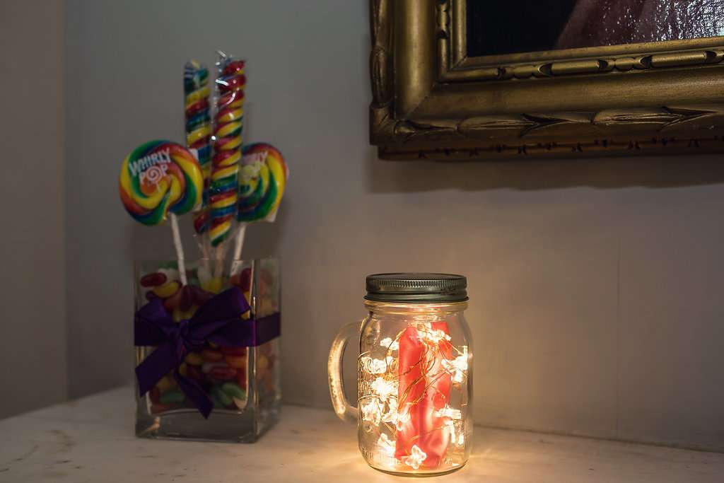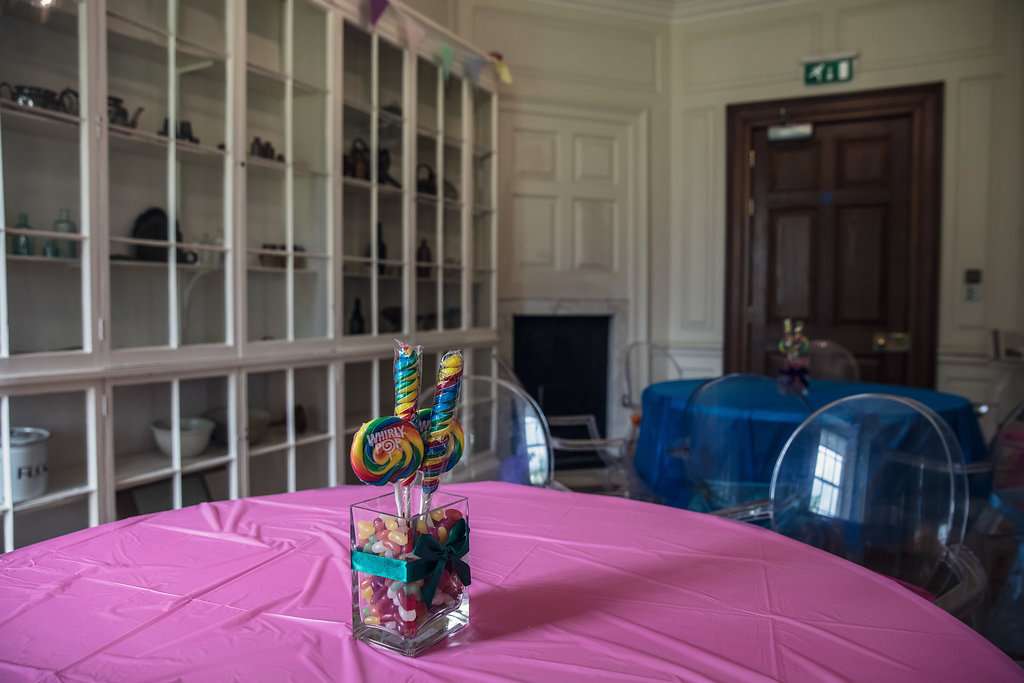 And sweet and saccharine it definitely was, even from the start. “The invitations were handmade in the form of a colour-pop chocolate bar wrapper, which we then printed onto a Galaxy Bar and posted to everyone! The chair ribbons, bouquets, bunting and so on were all rainbow coloured. All the centrepieces were candy jars and whirly pops, and we had candy trees on the mantelpieces and a large pick ‘n’ mix buffet.”
