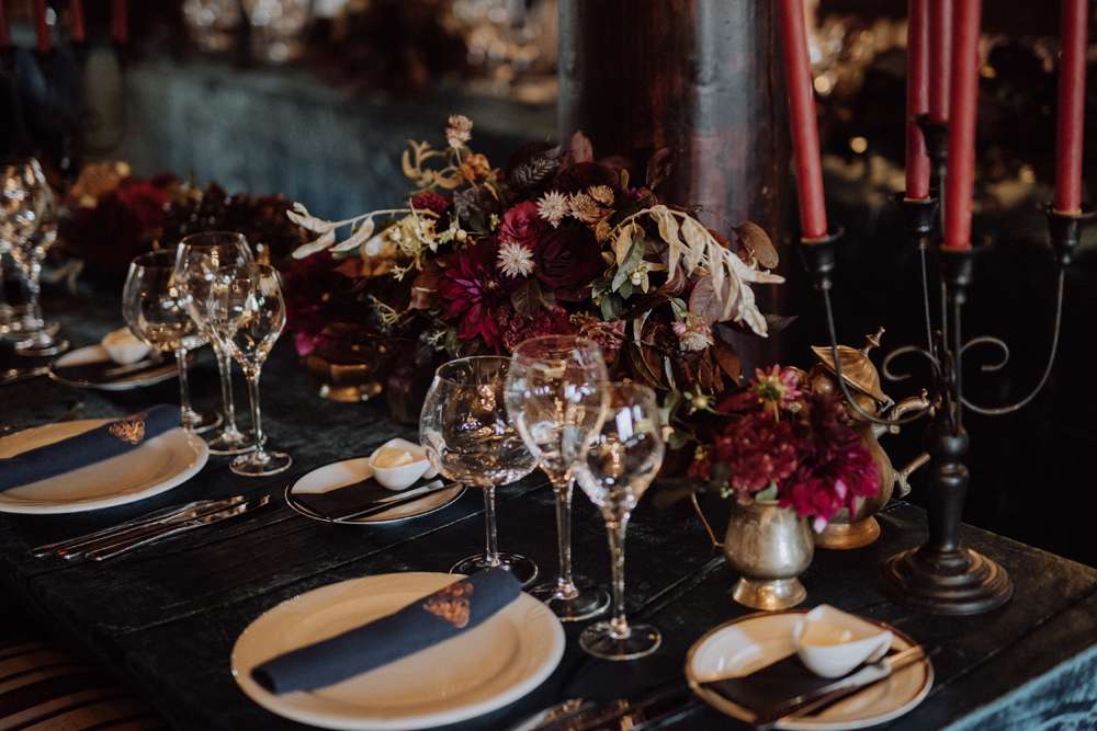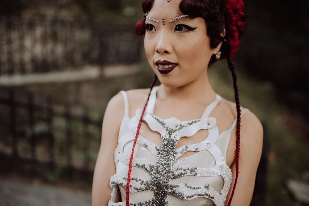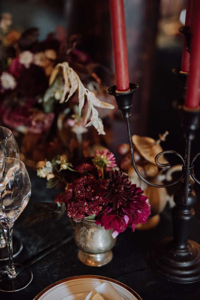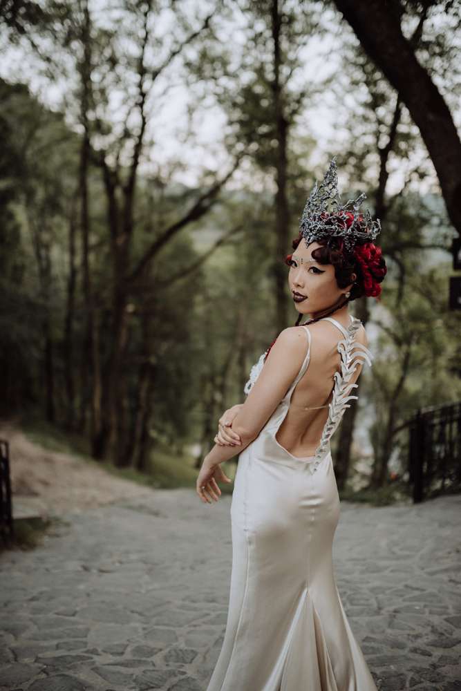 “We met in a life-drawing session, near Waterloo”, began the bride, “Our wedding theme when Sci-Fi has a baby with neo-gothicism! Our inspiration was Giger’s Alien, 16th Century Dutch style life and a few other things that felt very ‘us’.”