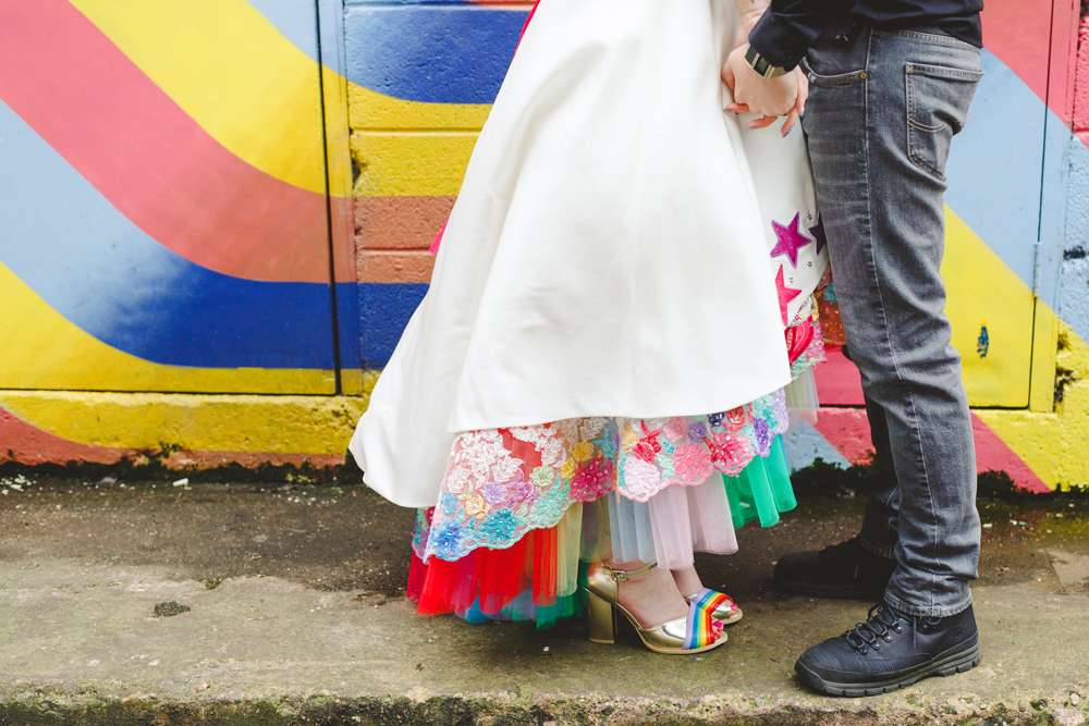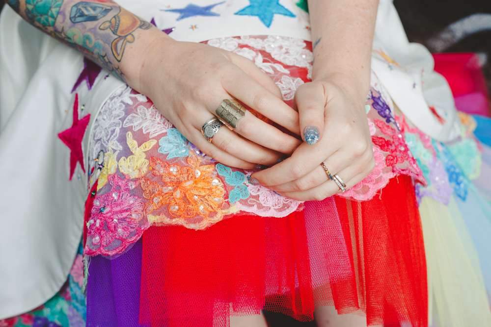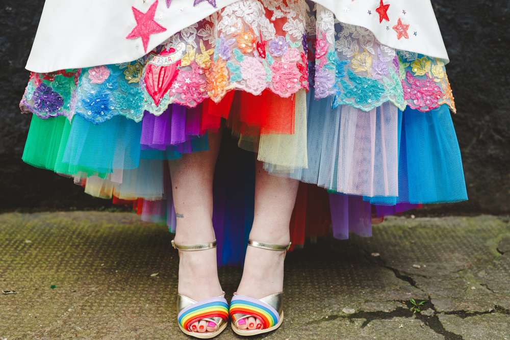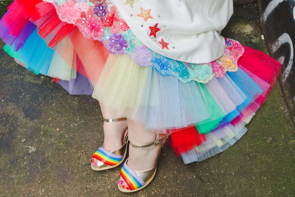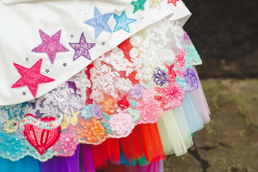 It will come as no massive shocker to most of you, but I had to incorporate rainbows. Rainbow is my favourite colour after all. I knew I wanted to get rid of the rouched bits in the skirt and make it shorter and Jo suggested a high/ low cut to show off my shoes and the custom-made rainbow petticoat that she was making for me. She also said we could actually paint the lace at the bottom in different colours too which got me very excited indeed!