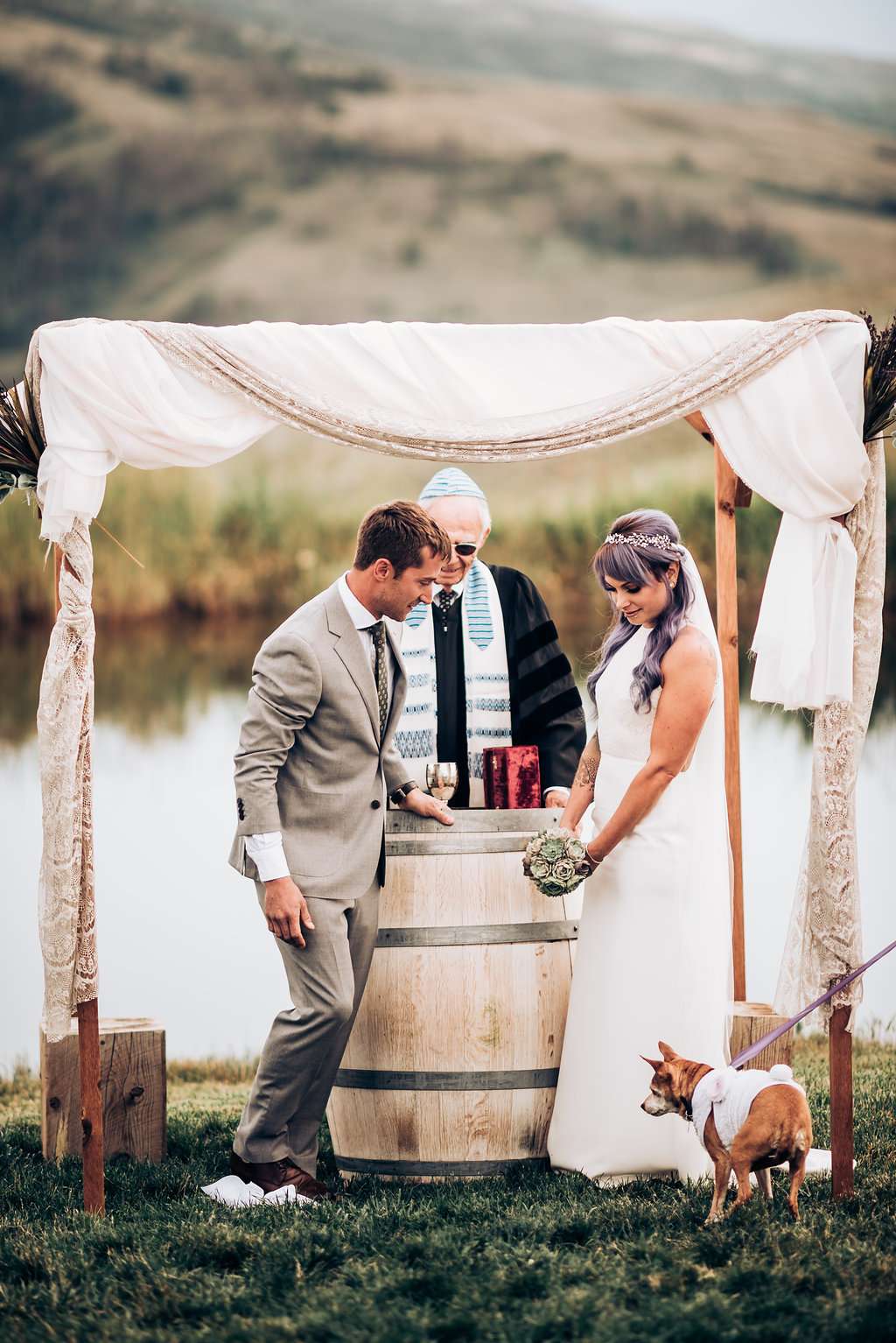 Emyli walked down the aisle in a beautiful backless halterneck Sarah Seven dress (and gorgeous lilac hair that’s total #hairgoals) to Hans Zimmer’s You’re So Cool. “Looking back, I wish I’d walked slower down the aisle but I was too excited!” she says. “The sun came out just for our ceremony underneath a chuppah on the Strawberry Creek Ranch lawn and it was perfect. Our small dog, Sarah, fell asleep during the ceremony – in spite of us trying to keep it super short and sweet – so I guess it was a little boring!”