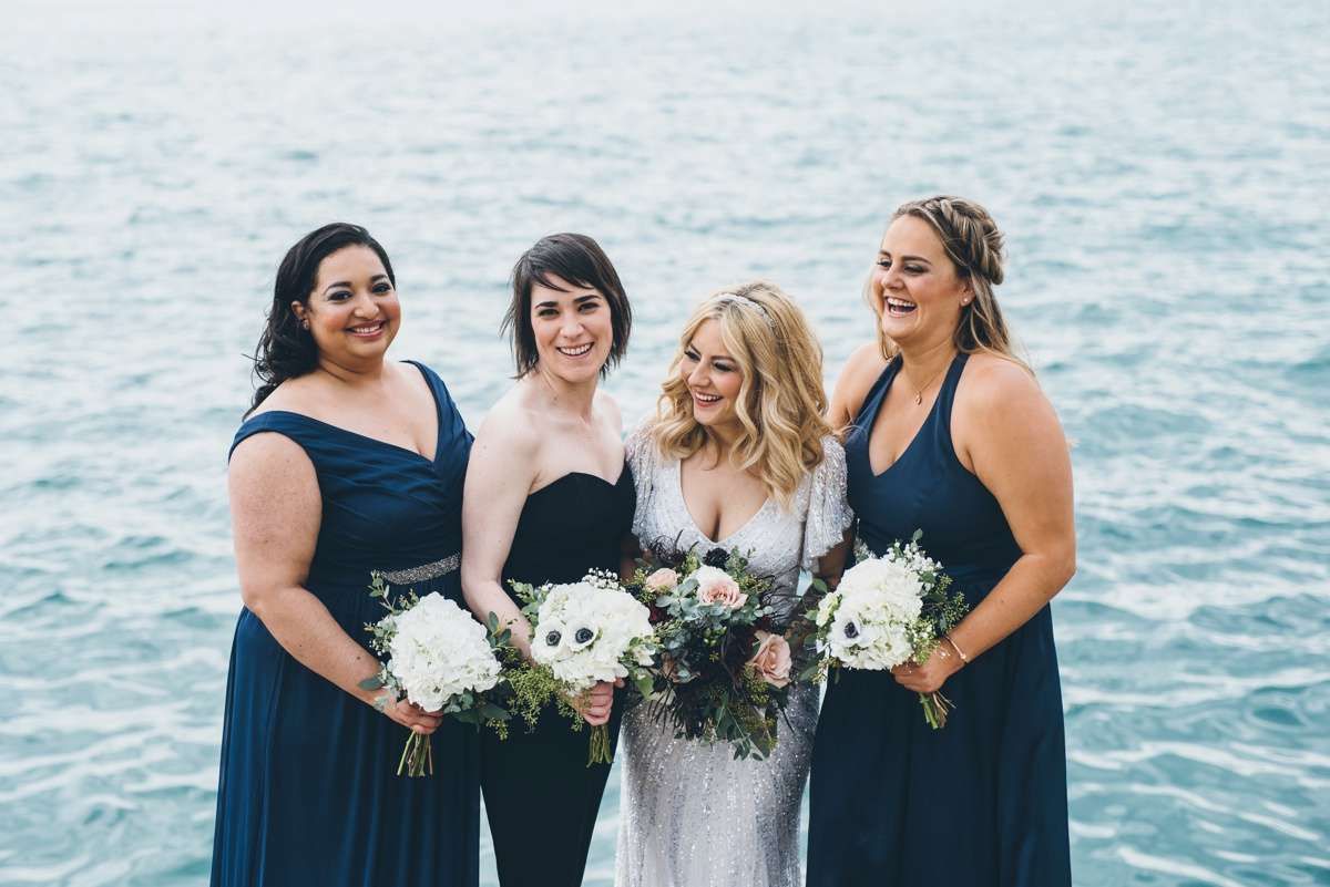 Brandi’s beautiful glinting sequinned dress was from BHLDN, worn with complementing glittering shoes from Badgley Mischka, and headband from Etsy. Chris from Kate Johnson Artistry did her hair, while Brooke from Brooke Klay Artistry did her make up. David’s suit was custom made by Indochino and his accessories came from The Tie Bar. The bridesmaidsdresses were from David’s Bridal and there was a bridesmaid in a jumpsuit from Nordstrom.
