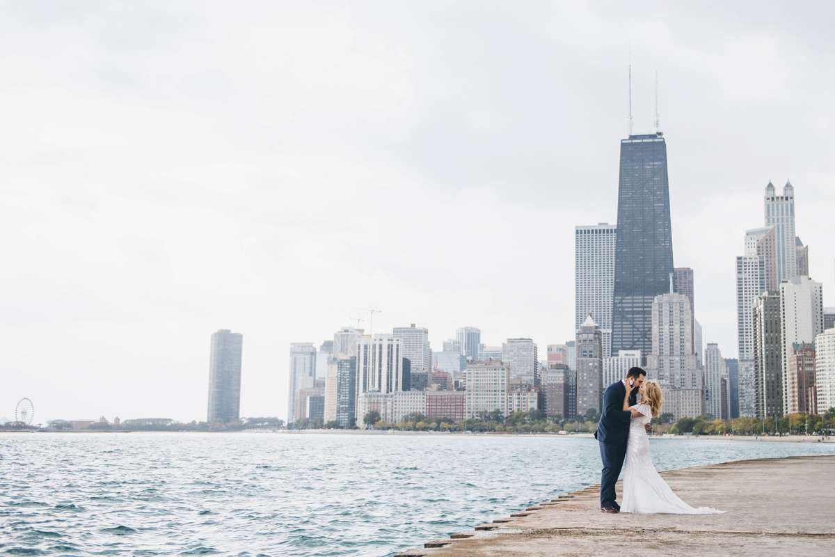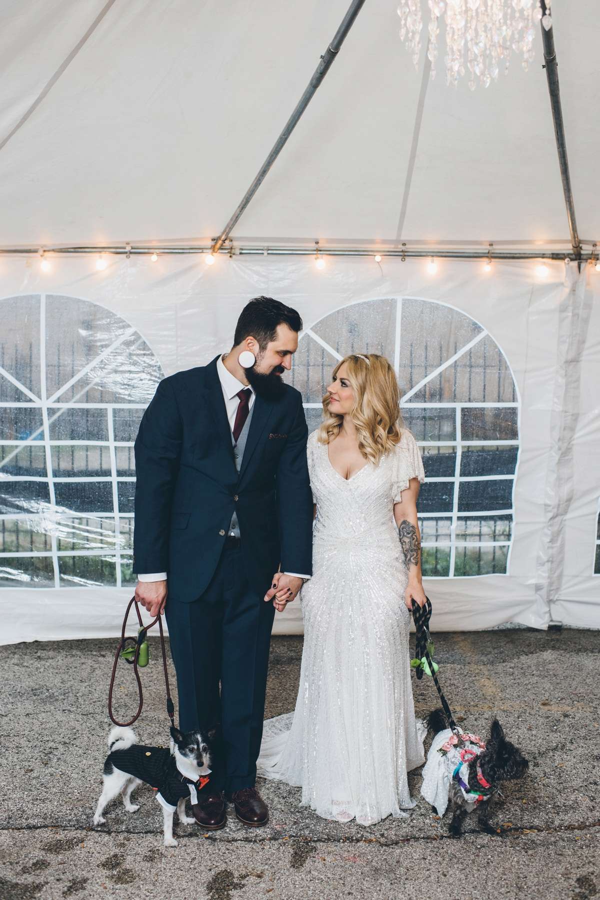 If this is how you do weddings in Chicago, I want in. Let me just list the boxes Brandi and David ticked on their incredible day: a romantic rooftop first look, getting hand tattoos in their hotel room, playing with smoke bombs against the backdrop of a spectacular rainbow, and their two pups were the ring bearer and flower girl! Then, as if that wasn’t kickass enough, a week later the bride contacted photographers Ed and Aileen Photography to do a ‘trash the dress’ session, which took place in Lake Michigan on a 2°C day! That’s not just setting the bar high, that’s sending it stratospheric.
