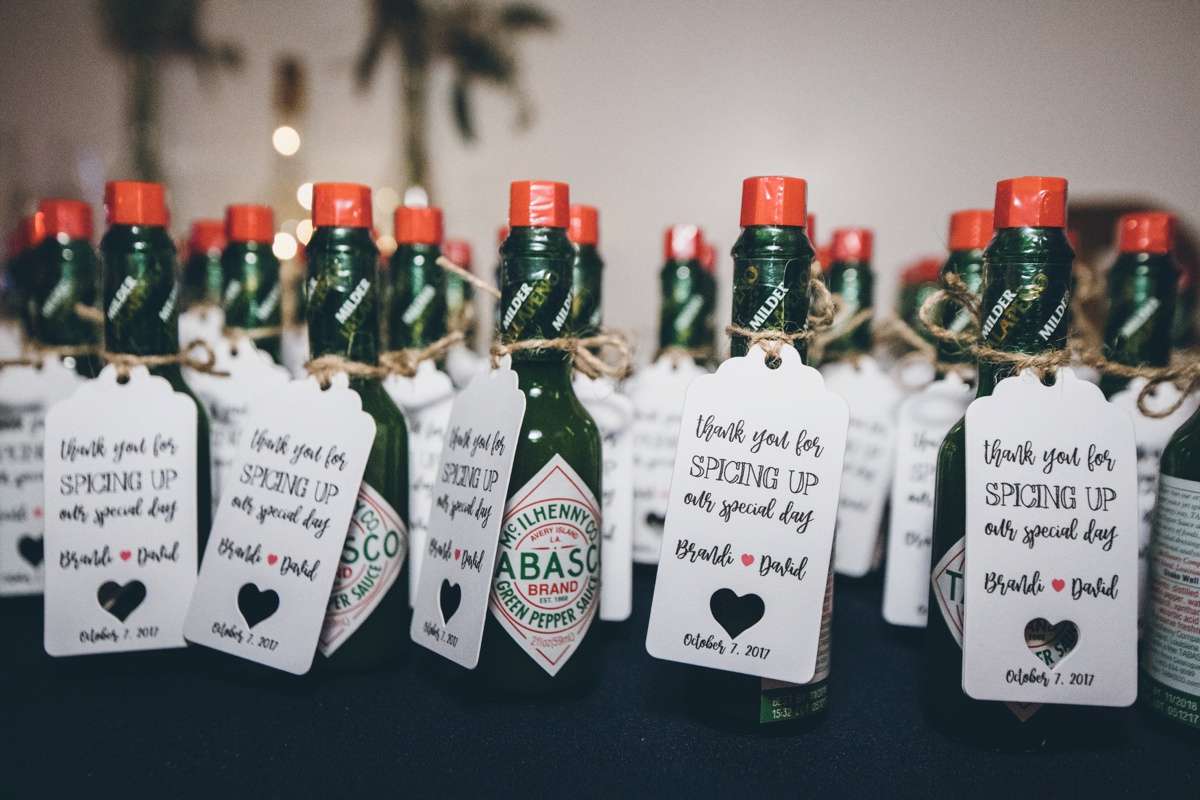 The couple saved money on the flowers and centrepieces. “We just didn’t go overboard,” said Brandi. “We DIYed all of our centrepieces, which were wine bottles with fairy lights, and pictures of our pets, and we did tags on our favourite hot sauce bottles for favours. We really didn’t want favours that people just toss to the side; we wanted something people would use.”