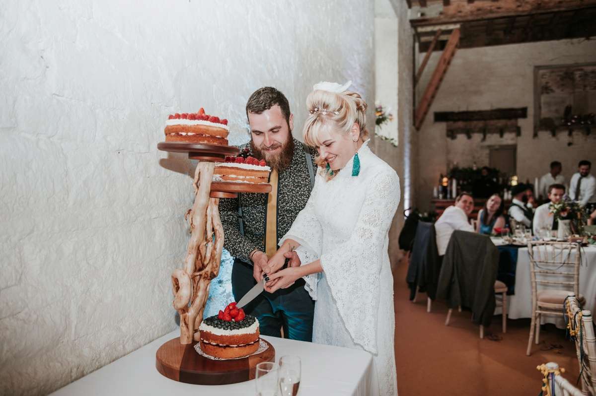 Their approach to food was laid back, too, with local caterer, Helen Furness, providing the buffet, and Posh Pigs Hog Roast doing a hog roast in the evening. The cake was made by a friend. Lizzie said, “We wanted a naked cake with loads of fruit to go with the cake stand. Kyle made the stand from a piece of Ivy with a knot in, which made him think of ‘tying the knot’.