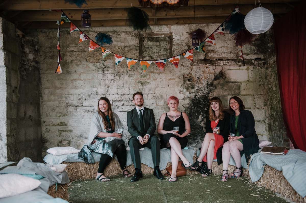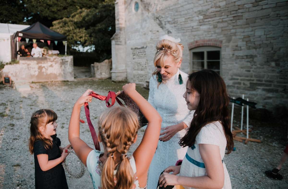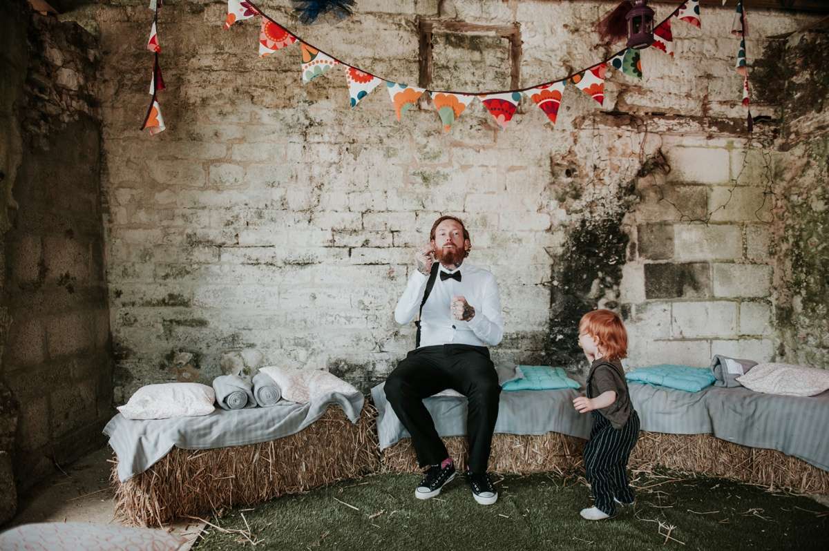 “We made a tipi and decorated it with pom poms and fairy lights and put activity snack boxes in and around it for the kids, plus we bought dog beds to use as giant cushions for them to nap on. We painted jars and filled them with fairy lights and dotted them around the venue. Kyle made outdoor games and signs, and I made what felt like miles of bunting. My step mum made sloe gin and raspberry vodka, and we had stickers for the bottles printed up through Vistaprint, who also printed the stationery I designed.”