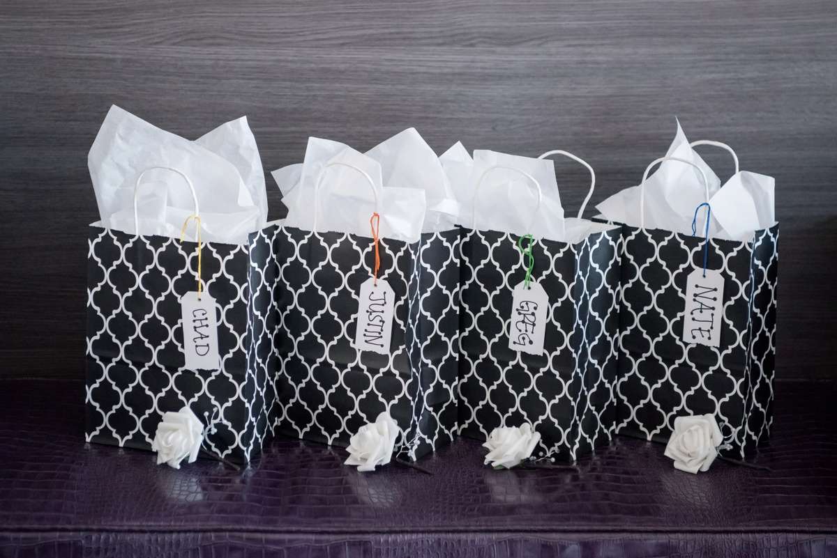 Steven wore a tuxedo rented from Men’s Wearhouse, with a black and white bow tie, braces, and cufflinks from various vendors on Amazon, and also custom some Converse with the wedding date on the back to match his bride. The bridesmaid dresses came from David’s Bridal, with alterations done again by Diana Eden.