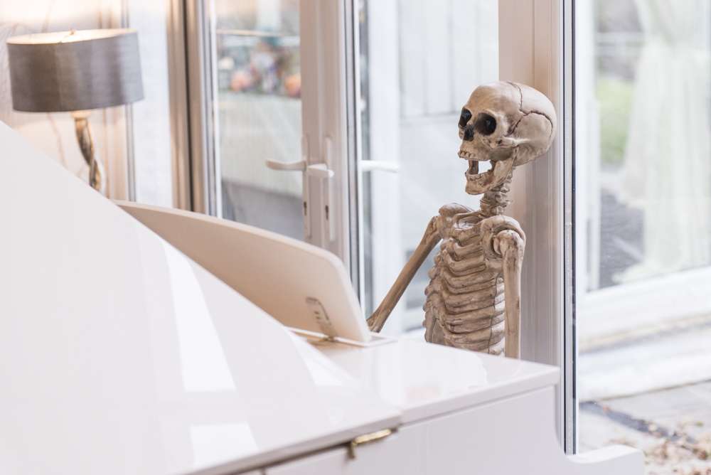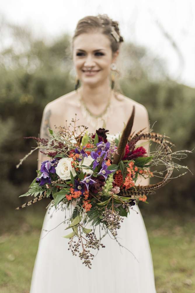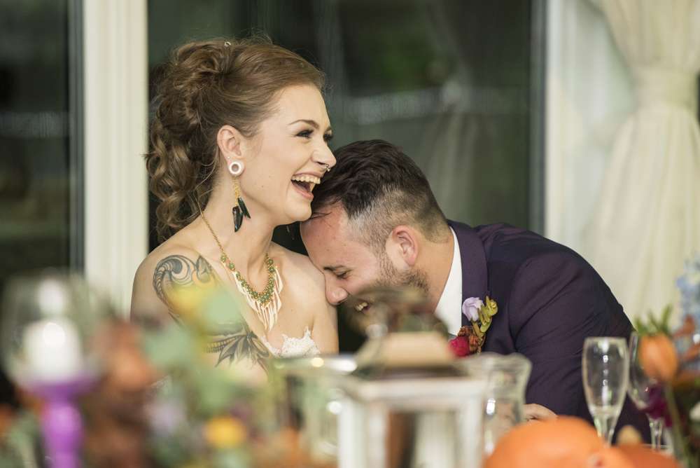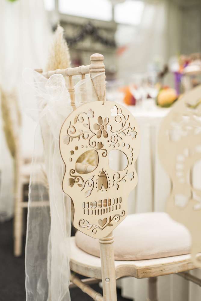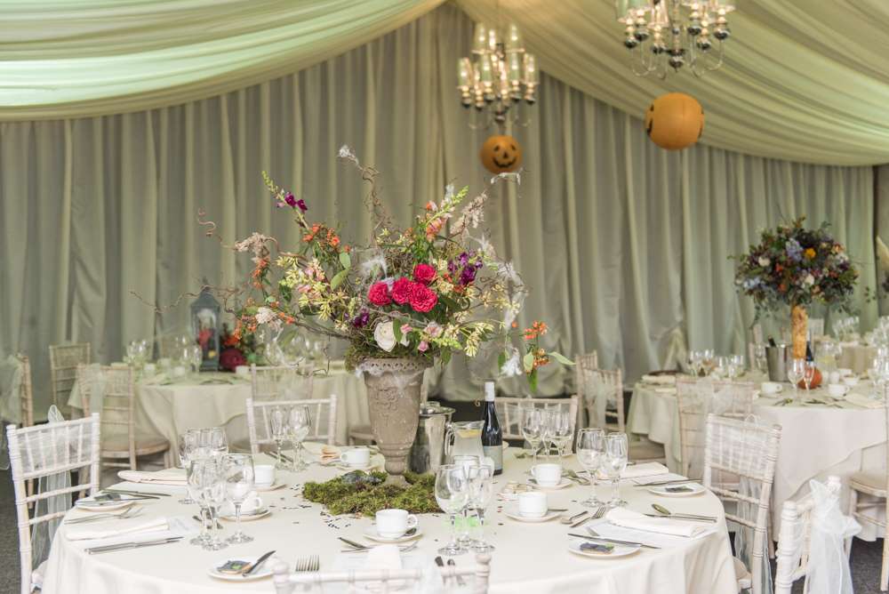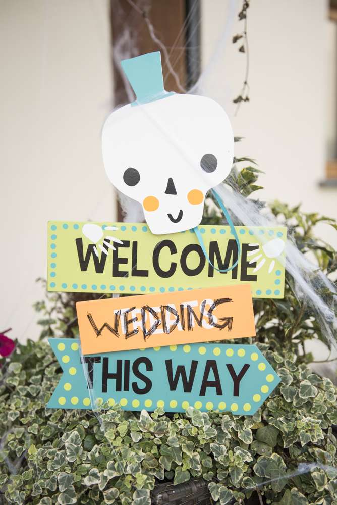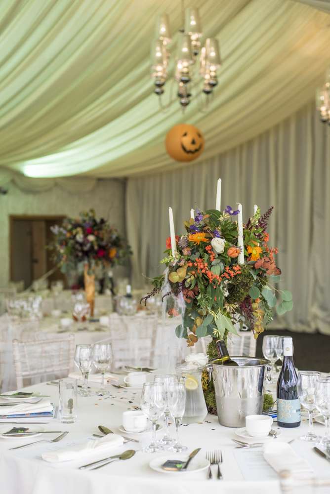 “I spent years collecting Halloween props and decorations in addition to my own little knickknacks that I’ve had for a long time”, Melanie explains. “The decorated stag skull on the arbour, from Dead Gorgeous Skulls, is now mounted to our bedroom wall, which is a nice keepsake as well as being totally bad ass!” The reception was held in a spacious orangery (fittingly!) area, and filled with Halloween curiosities dotted about amongst The Dancing Daffodil‘s kitsch floral arrangements.
