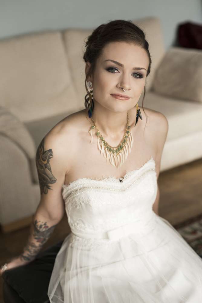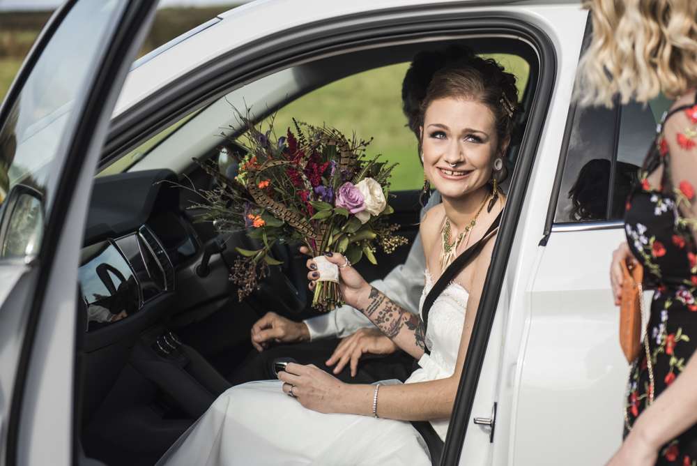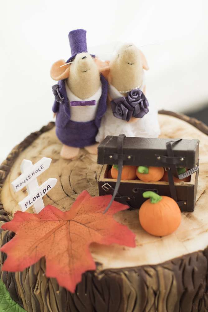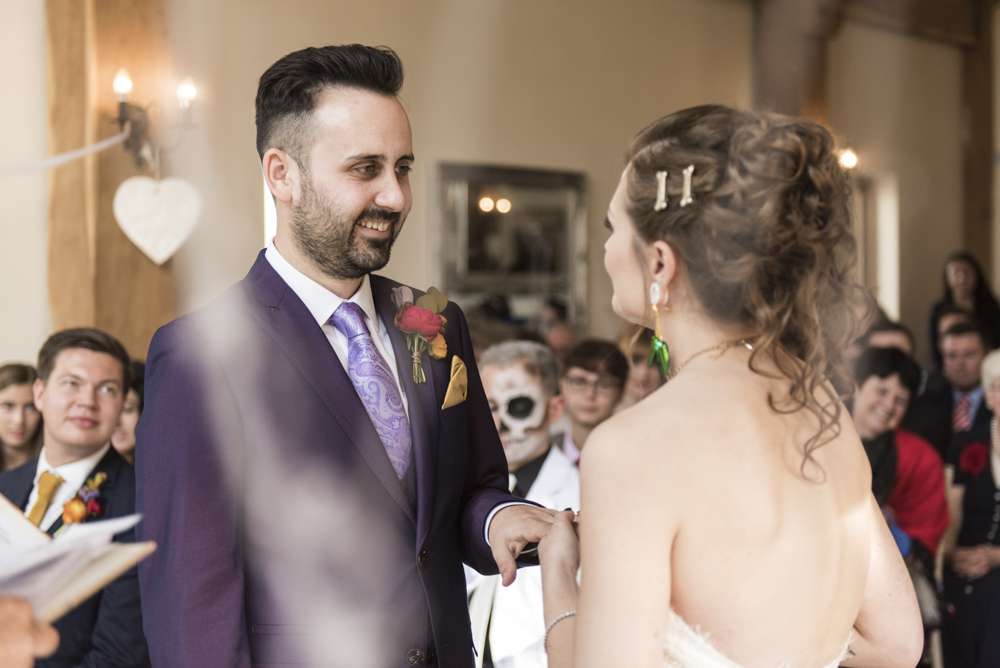 The decor also featured loads of DIY projects, including the order of service tombstone, the spider web table plan and the place settings. “I’d spent ages playing with different ideas for those and I hated all of them!” Melanie explains. “In the end, we made little icing tombstones with everyone’s names written on them individually in edible ink – a total faff, but people loved them!” Melanie’s mum also made the cake, with a gluten-free and dairy-free top tier, decorated with felt figurines from As Nice As Mice, and Melanie’s best friend Rhi Pardoe designed all of their personal stationery.