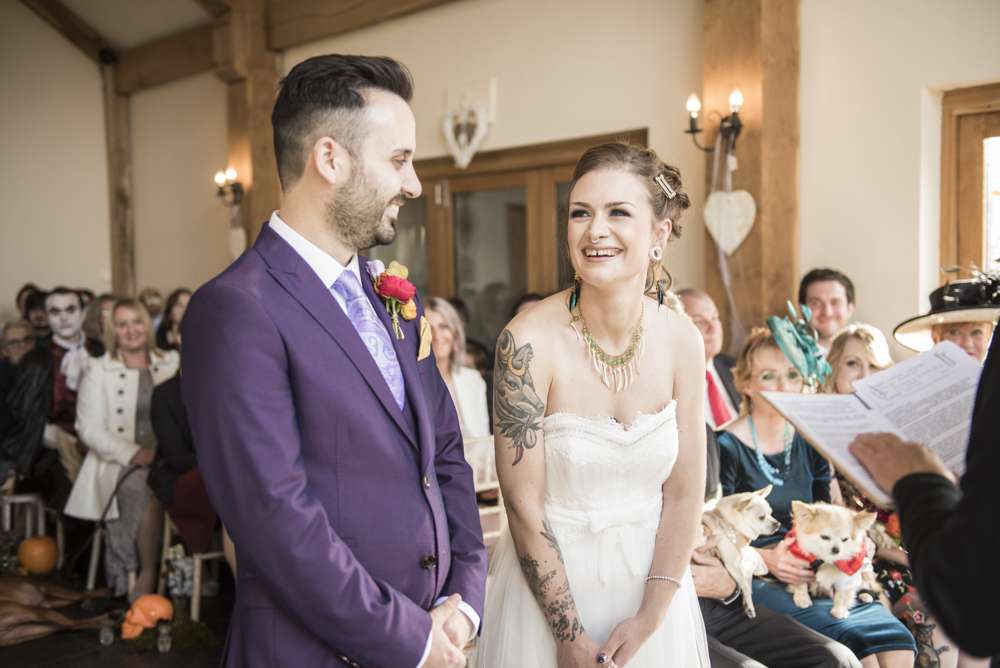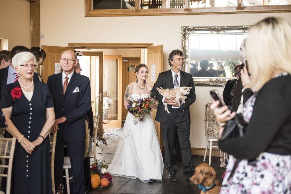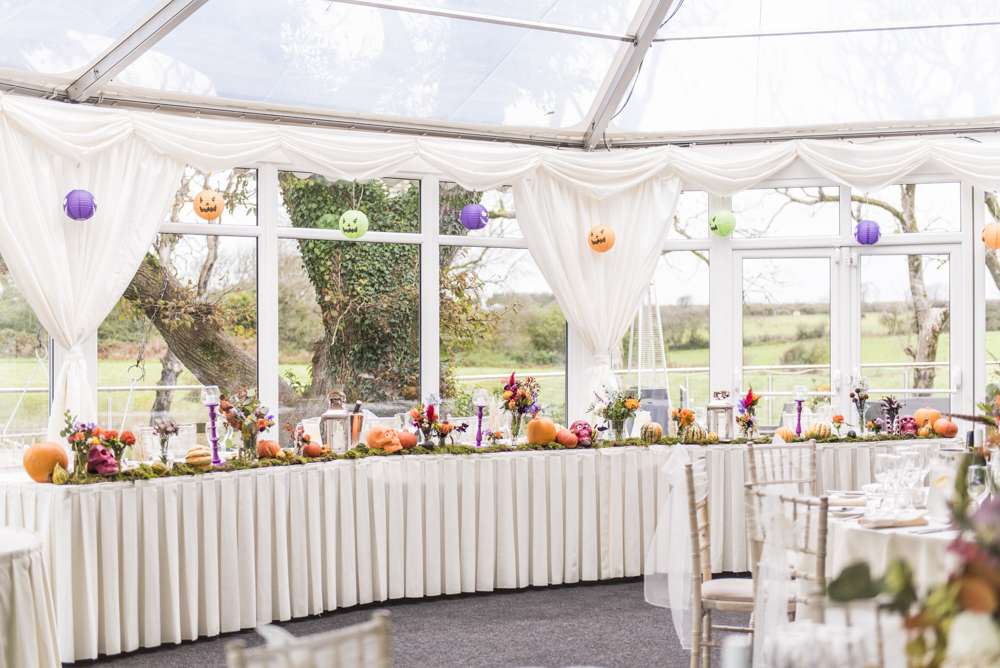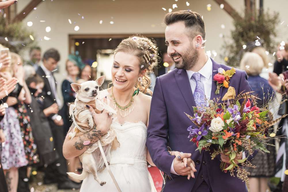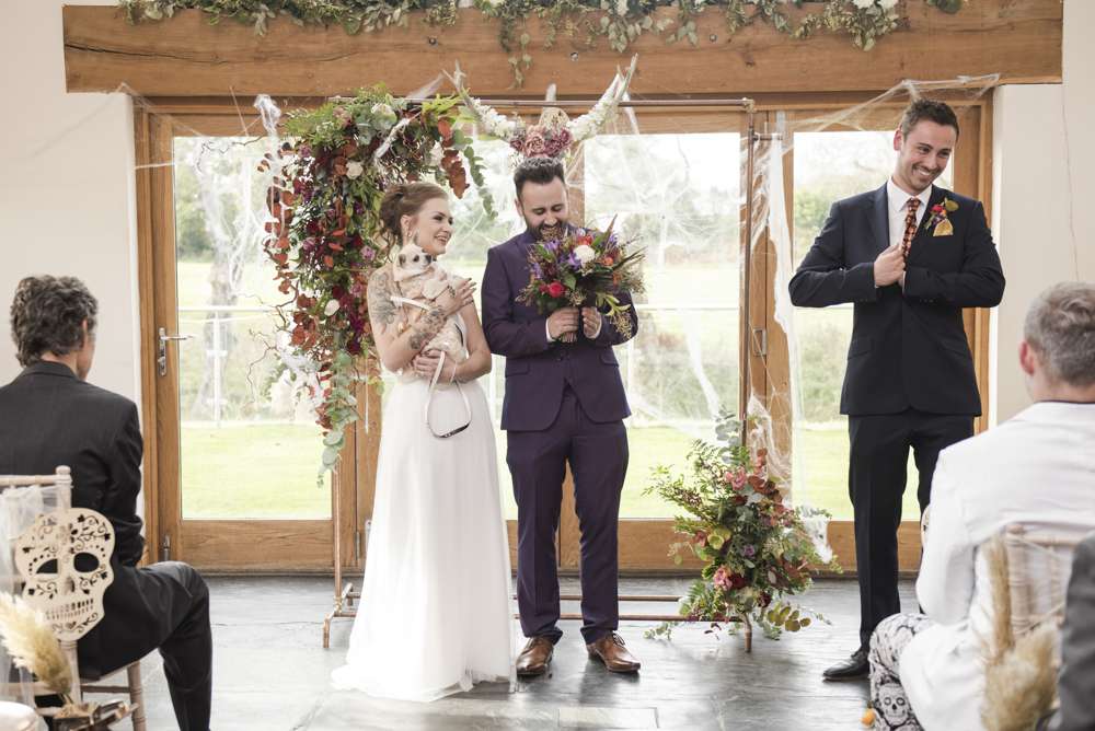 Melanie and Adam’s October wedding was a super cute take on a Halloween theme, keeping everything super light, bright and airy at Oldwalls in Gower, Swansea. As an ex practical-SFX artist and with it being Melanie’s favourite holiday, the couple wanted to evoke the imagery and colours, but most importantly the fun of it for all of their friends and family to enjoy. It was also a non-negotiable that her rescue chihauhau, Periwinkle, was able to take part in the day.