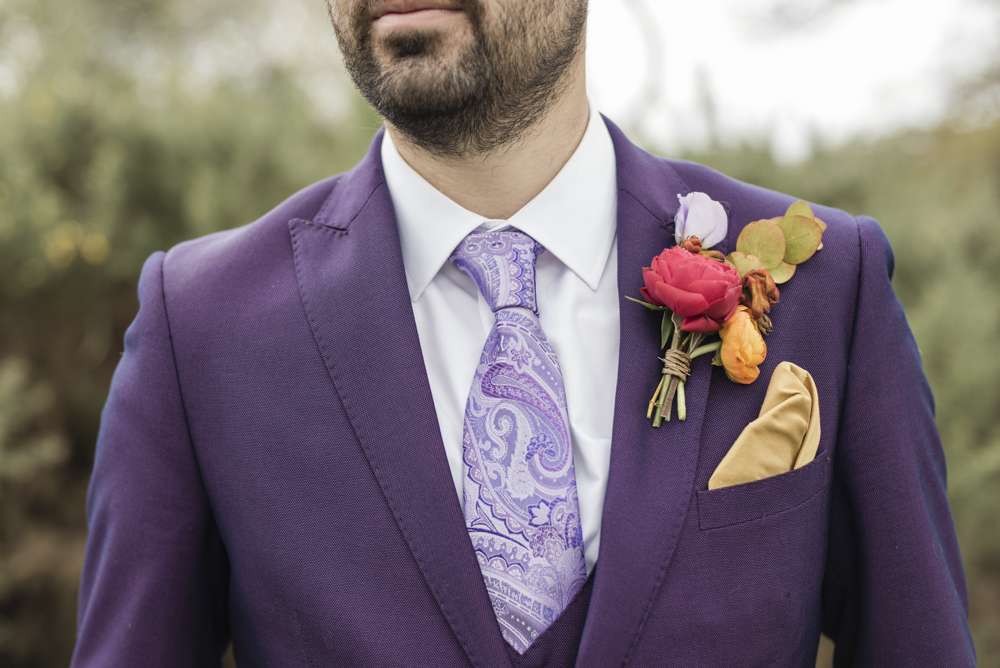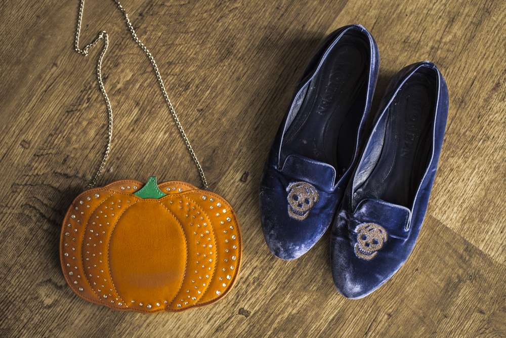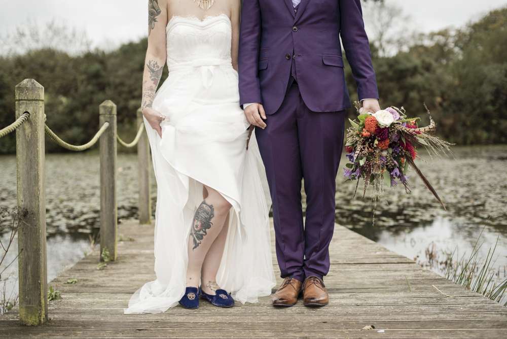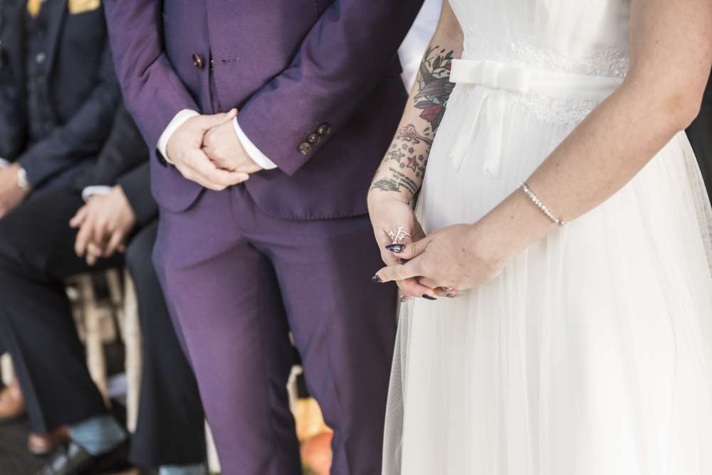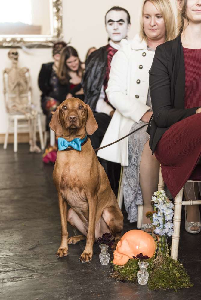 Melanie wore a strapless Rembo Styling dress with Virginia The Wolf bone jewellery and her everyday Bloody Mary Metal rings. On her feet she wore purple velvet Alexander McQueen flats with embroidered golden pumpkins, which she found second-hand on Vestaire Collective, and which matched Adam’s purpley Marc Darcy suit. In line with wanting it to be a big excuse for friends and family to have fun and see each other, fancy dress was of course encouraged too, making the ceremony pictures so much fun (spot the skeleton at the back!) It also totally helped that Melanie describes her and Adam as ‘not particularly serious people, so it was a bit more like a stand-up gig with some legal bits in it!’