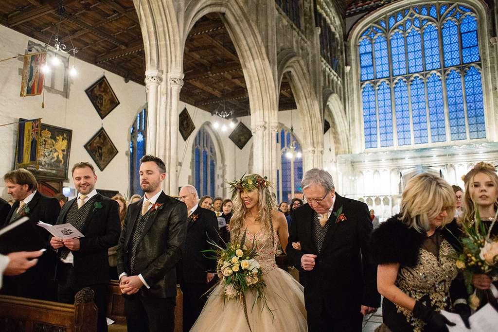 Their offbeat choices continued, with bridesmaids holding lanterns instead of bouquets, a prophetic artist who, during the ceremony, unveiled a portrait he’d created with the guests’ signatures instead of a guestbook, and Katie’s daughter surprising them with a reading she’d pieced together from a Tupac song! Katie’s dad did his father of the bride speech in the church rather than the traditional pre-dinner time slot. They had their mince pie and drinks reception right after the ceremony in the church (vegan ‘Jesus Beer’, no less!) and then Katie’s uncle led the procession on foot to the reception venue by playing 60s and 70s pop songs on his acoustic guitar. “Much to the bemusement of onlookers,” laughed Katie, “it was like having our very own Pied Piper!”