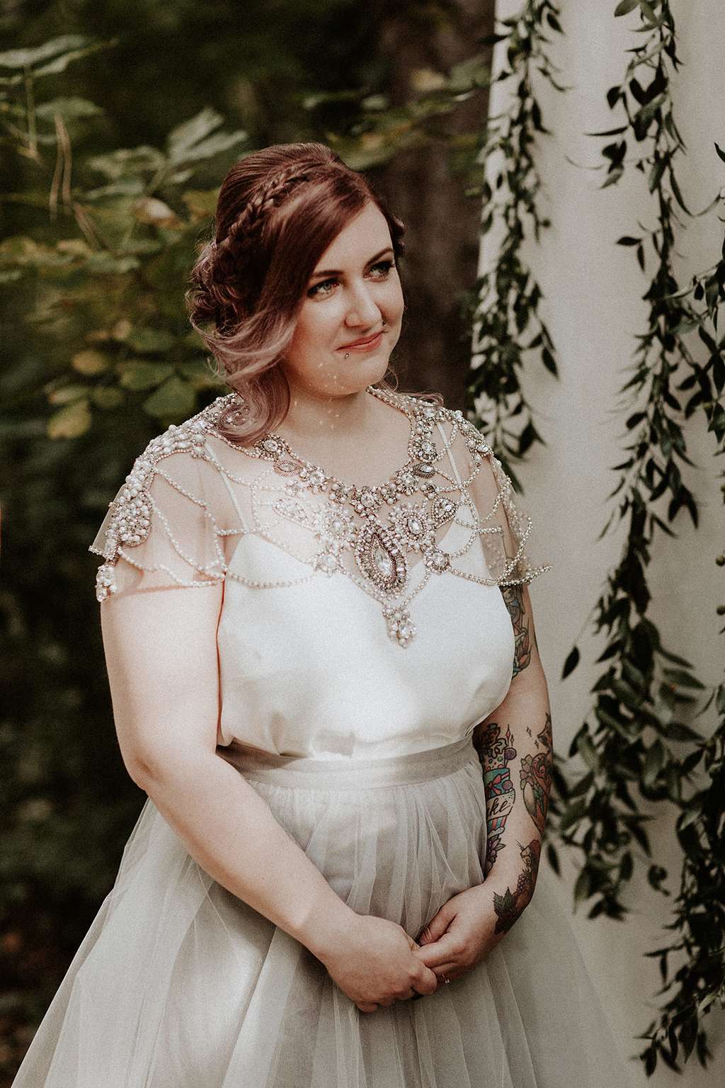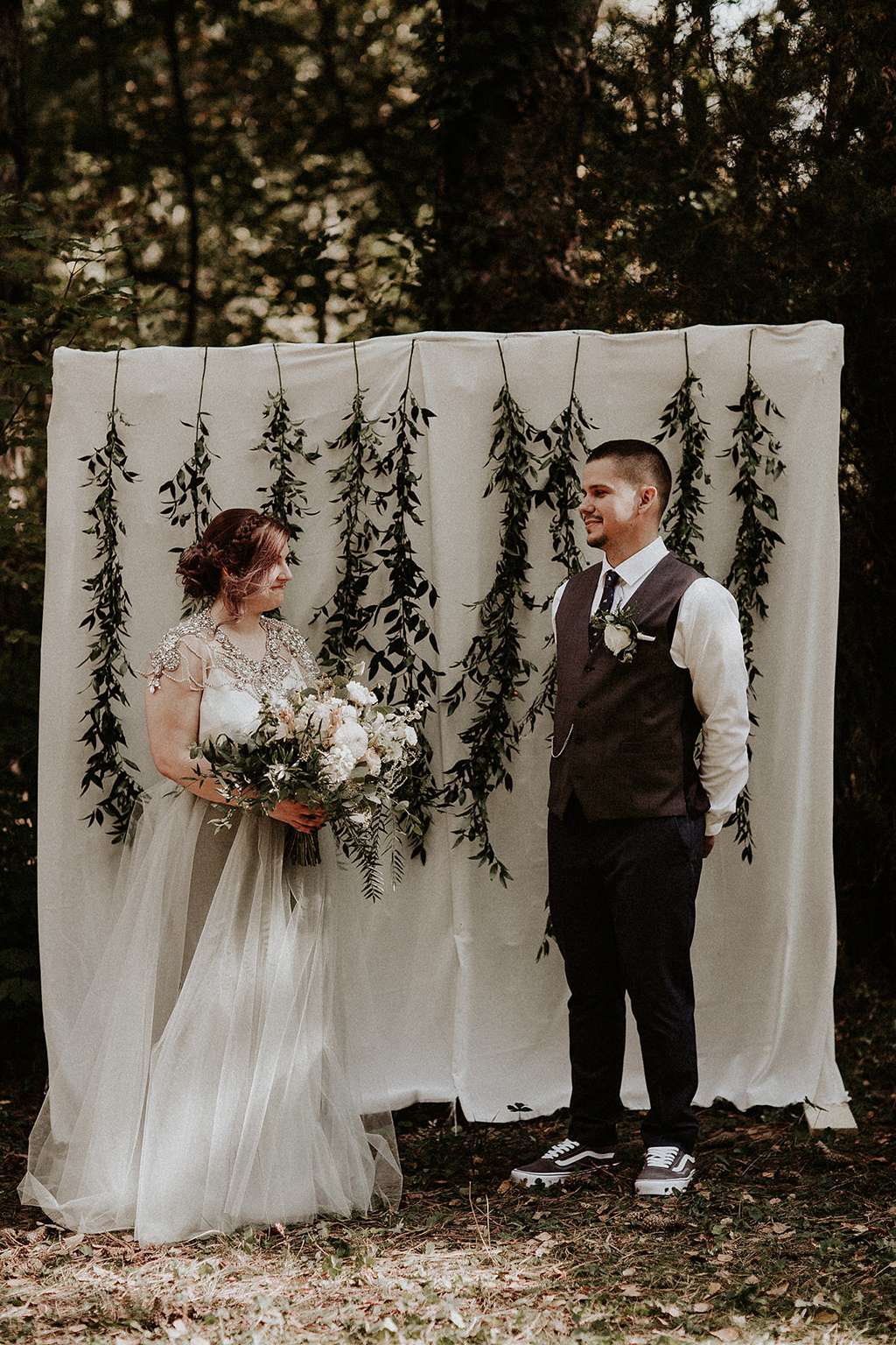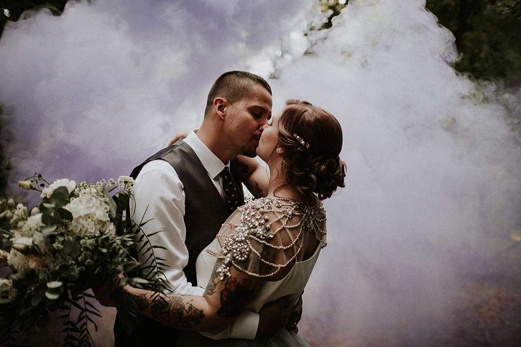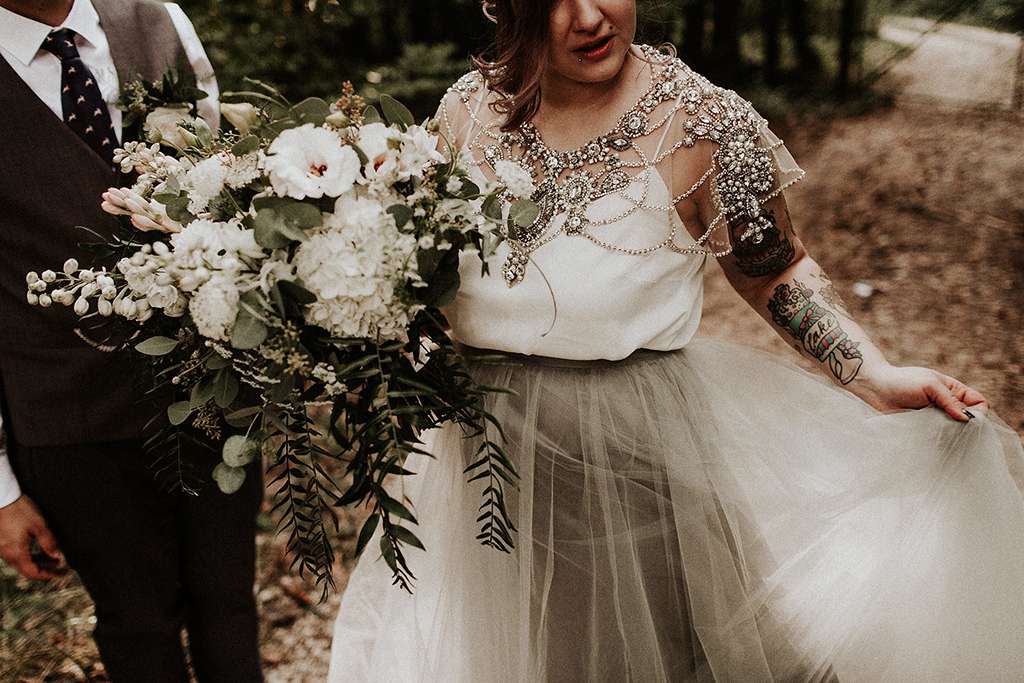 Their big day was held at a hunting lodge – specifically chosen for it’s location amongst the pine tree forest. The couple have a love of the outdoors, and pine tree forests especial. The bride explains, “We love the spooky, weird darkness that under a pine tree forest brings – the beautiful green/blue-ish light they case and and mysterious, dreamy vibes. We started out wedding planning with this one criteria in mind and the rest fell into place after!”