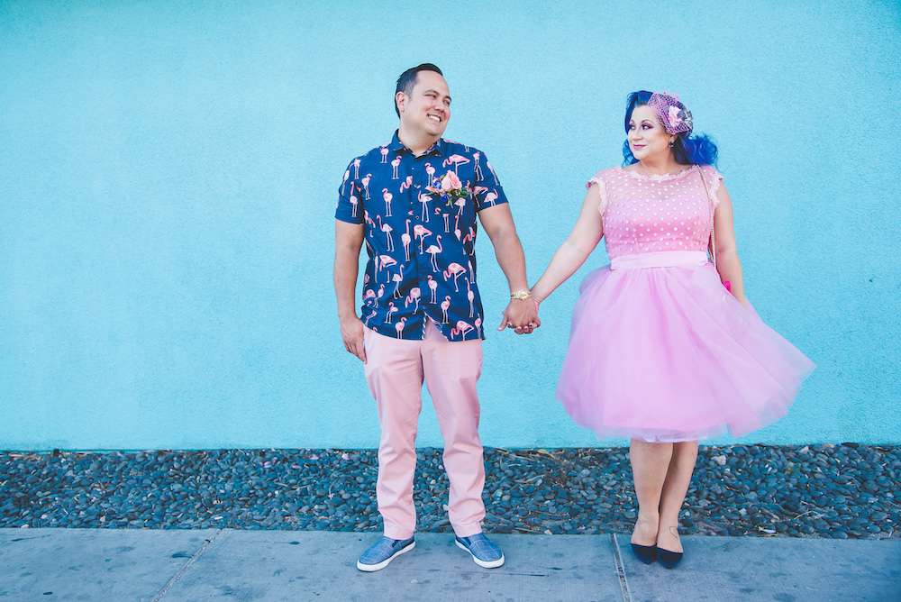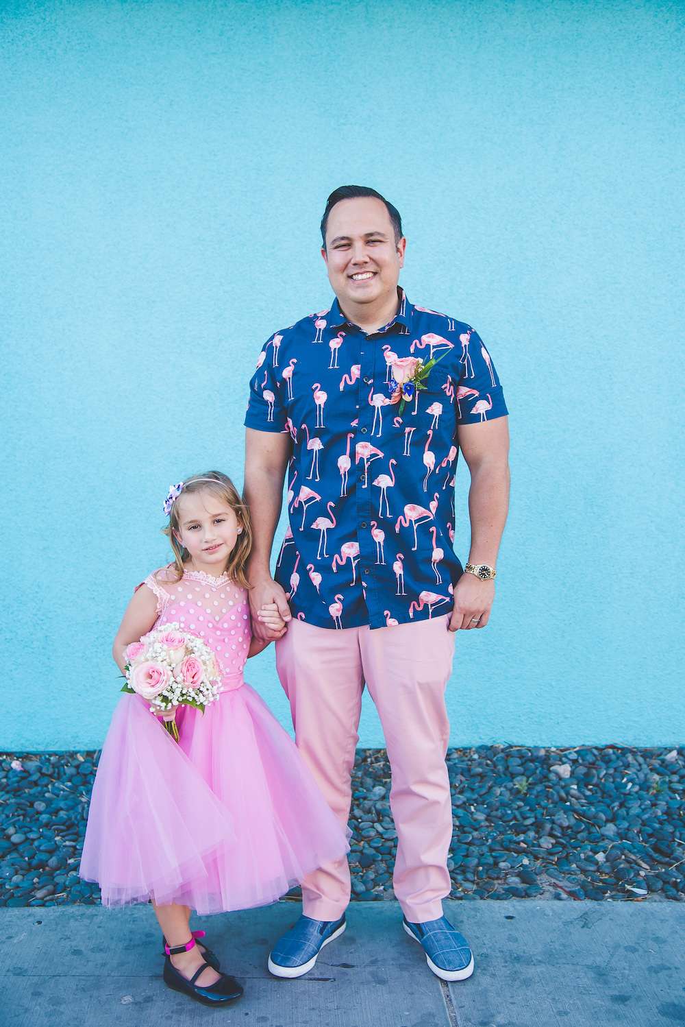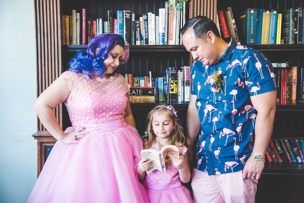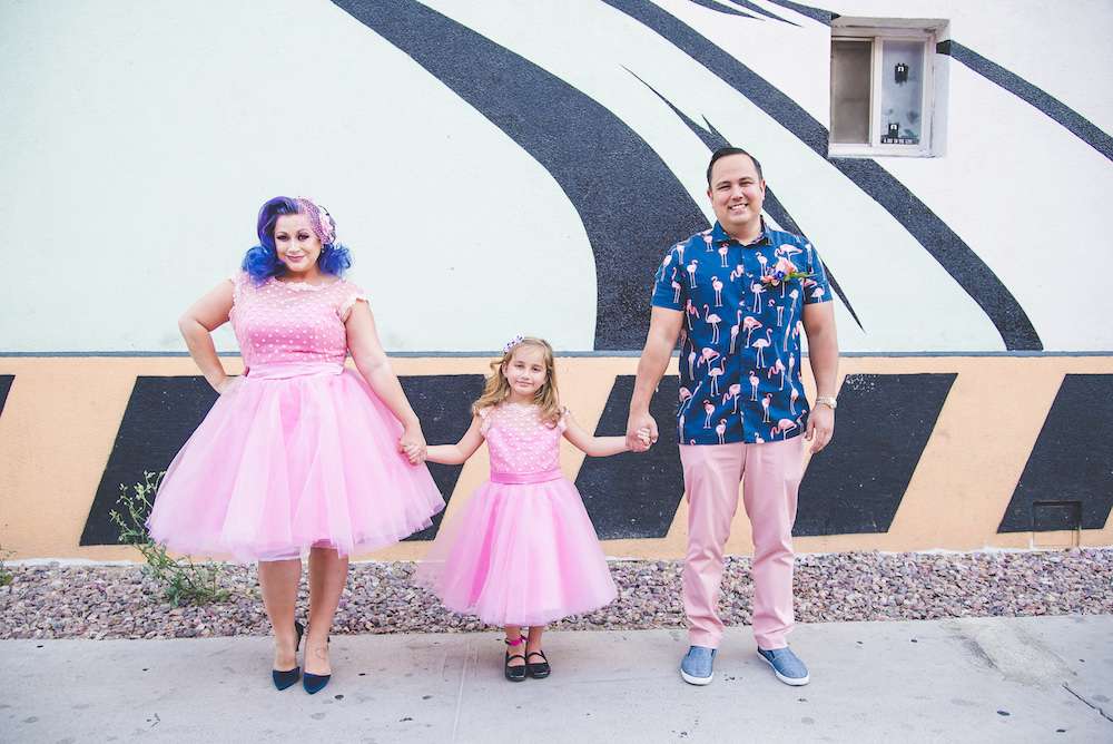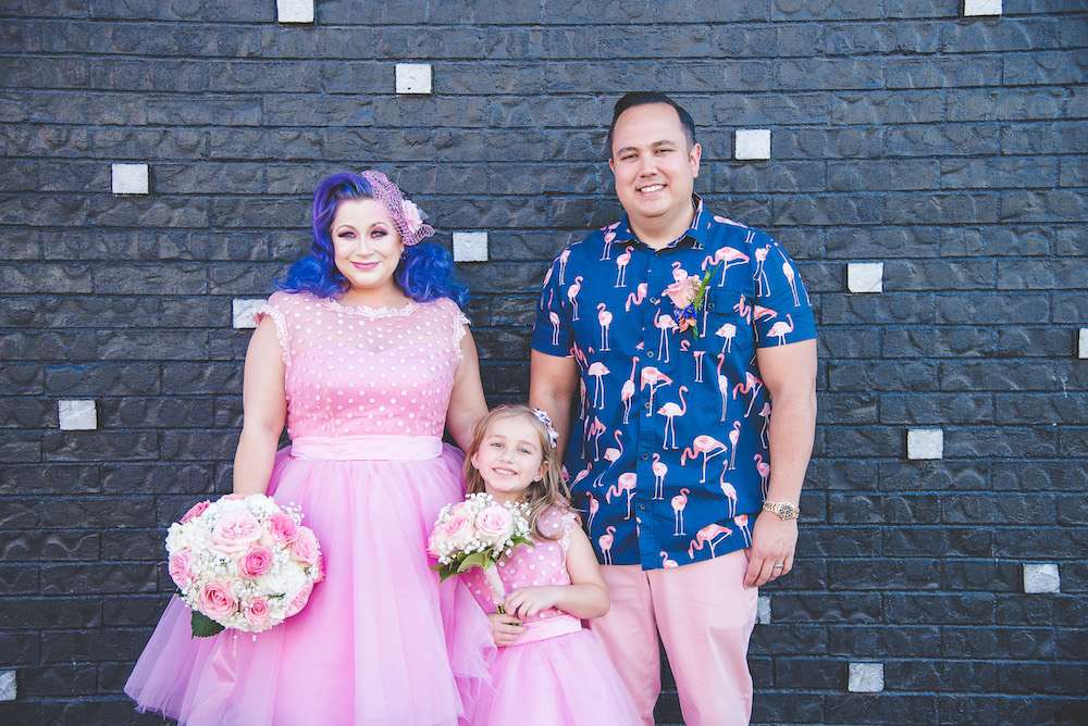 “We are both very into pin up/rockabilly culture, so we wanted our looks to be totally us, just a little more formal!” Staysi explains. “I have bright purple and blue hair and so designed and made a 50s inspired wedding dress for myself, with a matching mini me dress for my daughter, Wynter Lee. David is a great sport and knew he had to find something equally as fun so he went with pink pants and a pink flamingo shirt!”