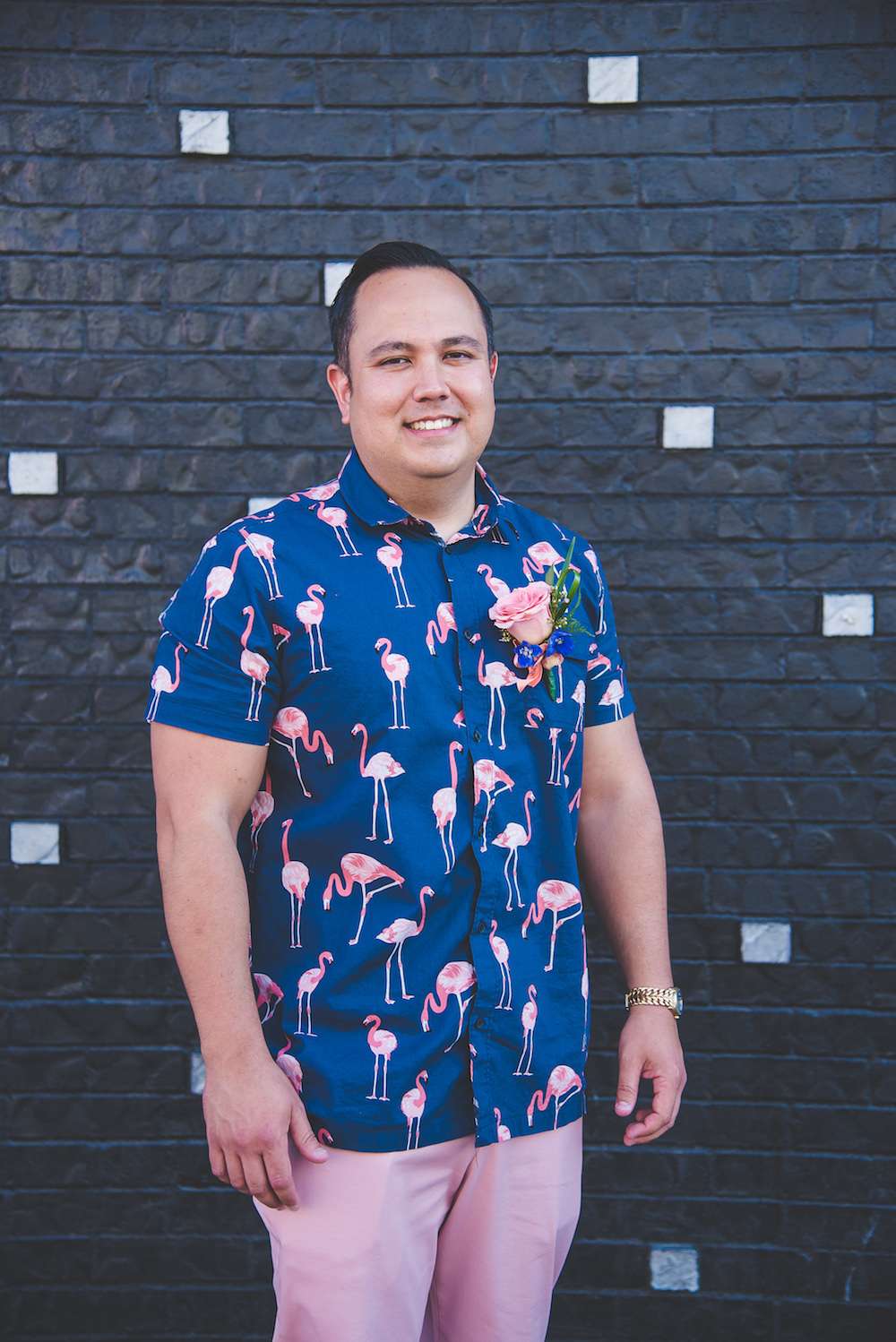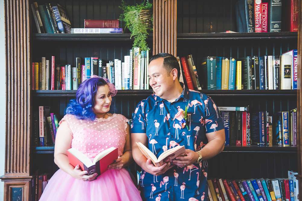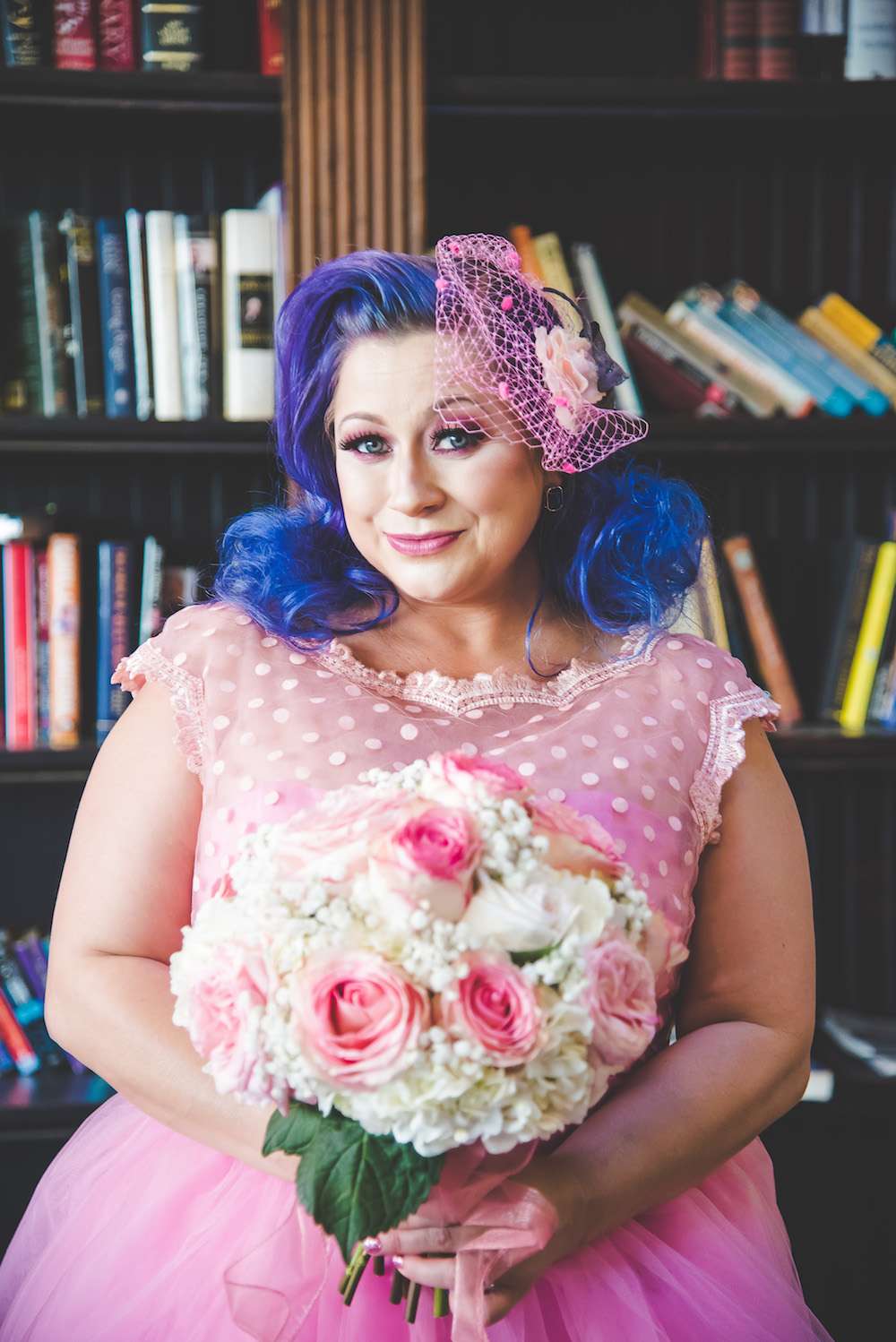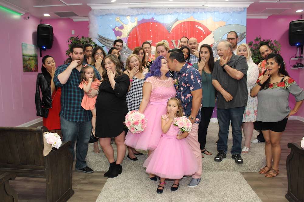 “We are both very into pin up/rockabilly culture, so we wanted our looks to be totally us, just a little more formal!” Staysi explains. “I have bright purple and blue hair and so designed and made a 50s inspired wedding dress for myself, with a matching mini me dress for my daughter, Wynter Lee. David is a great sport and knew he had to find something equally as fun so he went with pink pants and a pink flamingo shirt!”
