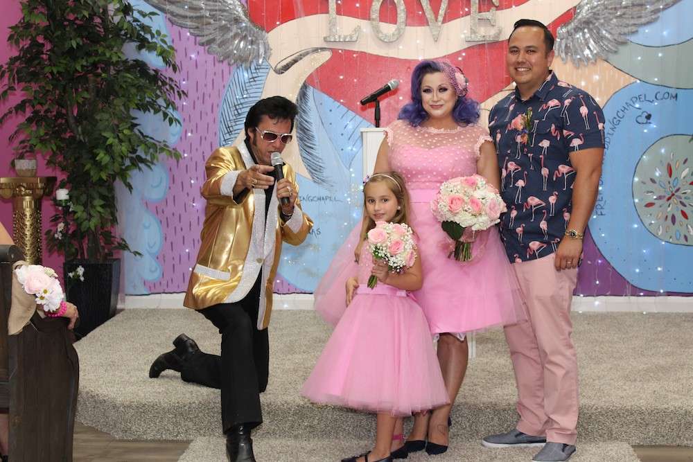They got married at the Fremont Wedding Chapel, officiated by Elvis – obviously, who else?! “Our favourite part was Elvis singing my daughter’s favourite song, Viva las Vegas. It was such a fun part of the ceremony, with everyone singing along and dancing. Our daughter being involved was the best thing about planning it – whenever she sees pictures or hears stories about our wedding she always gets so bummed she was the only person not there. she was so excited about being our maid of honour in her pink dress!”