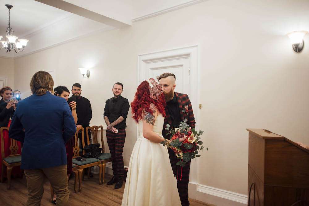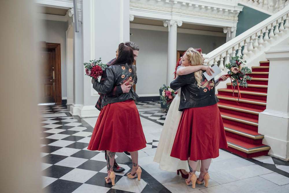 Rose’s dress was also a DIY job: “I bought my dress for £70 on Facebook Marketplace, but cut off the sheer top part and sewed on my own tulle straps (which was terrifying!).” She wore it with a veil from Crown and Glory and red shoes from New Look. Rose also did her own gorgeous hair and make up, after having a trial that just didn’t feel like her. Matt wore a checked red and black suit from Label Lab with vintage red and black brogues sourced on eBay. Her bridesmaids wore red Lindy Bop dresses and leather jackets that said ‘bride’s bitch’ on them – truly inspired.