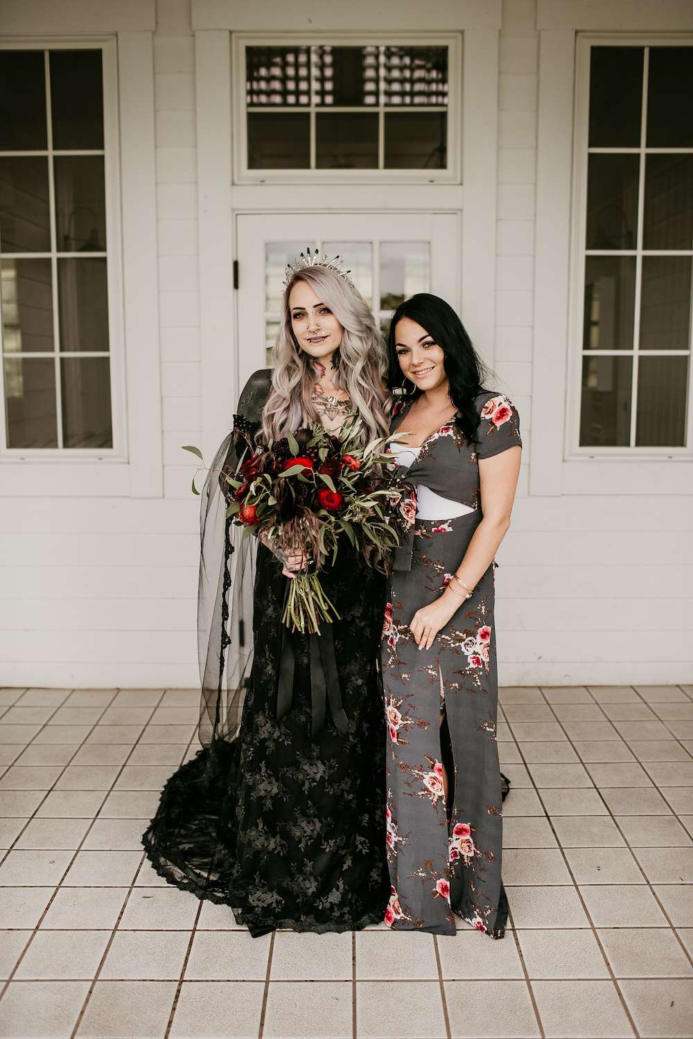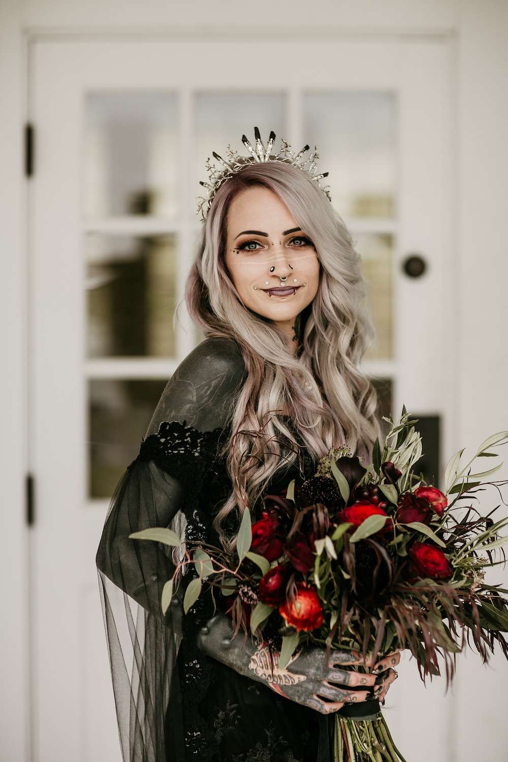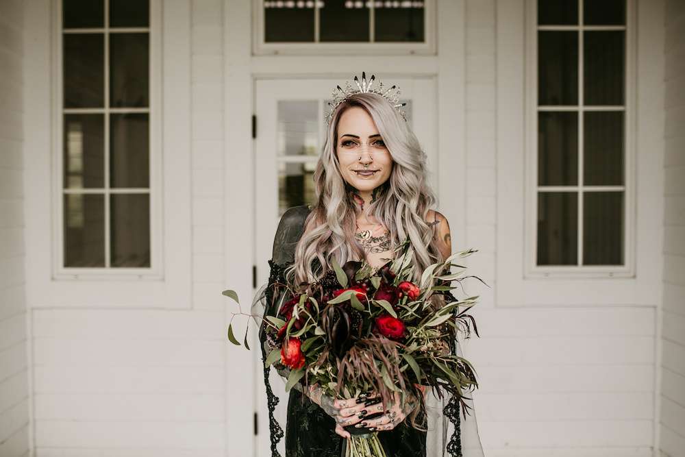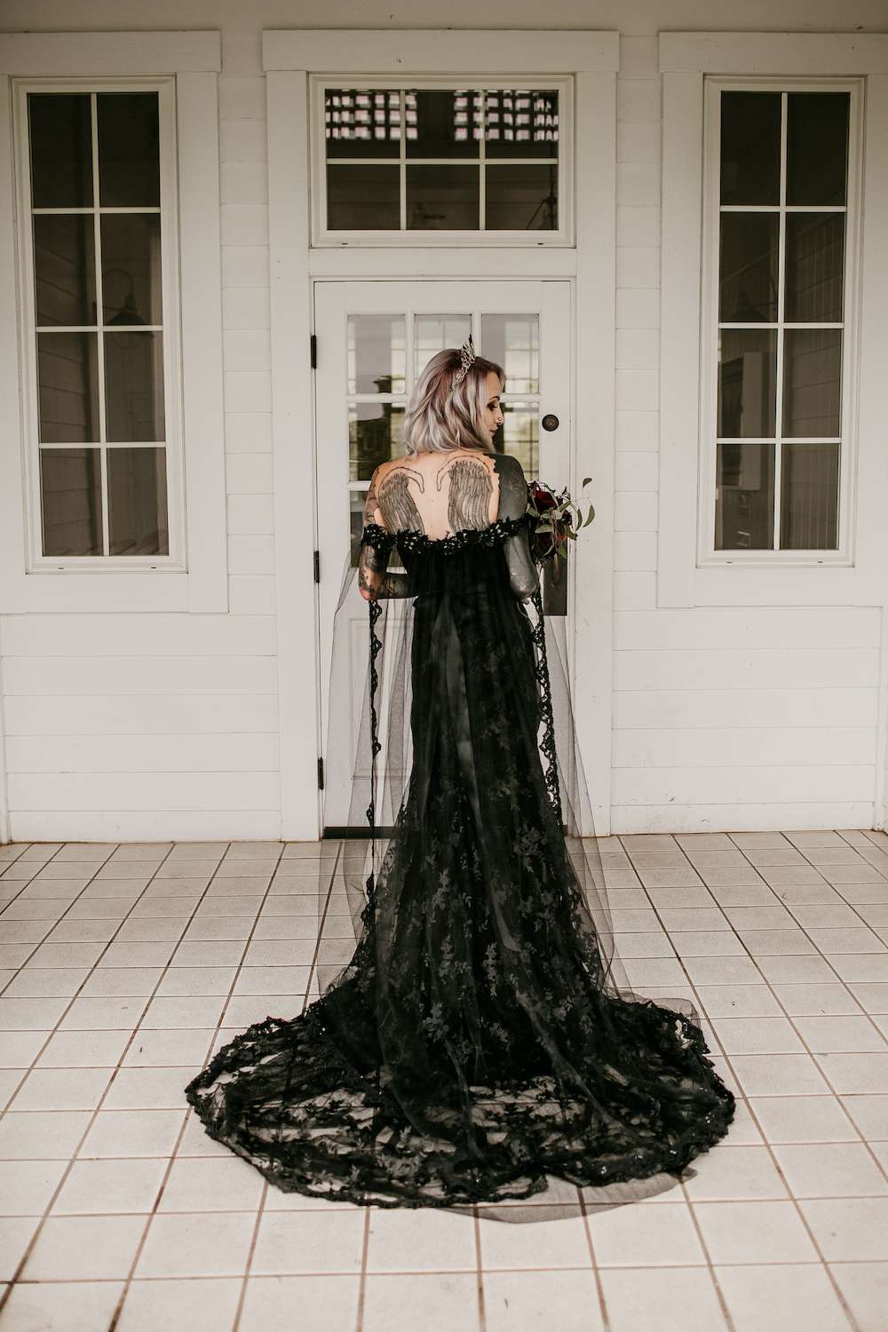 Chelsea got her black caped wedding dress from Amazon for under $100, striking lucky with a risky decision. “I did spend a few hundred on alterations, but that sill cost me less than any wedding dress would.” She also wore a crystal crown from HowlingMoonUK in her lilac hair and plugs from OaksAesthetics.