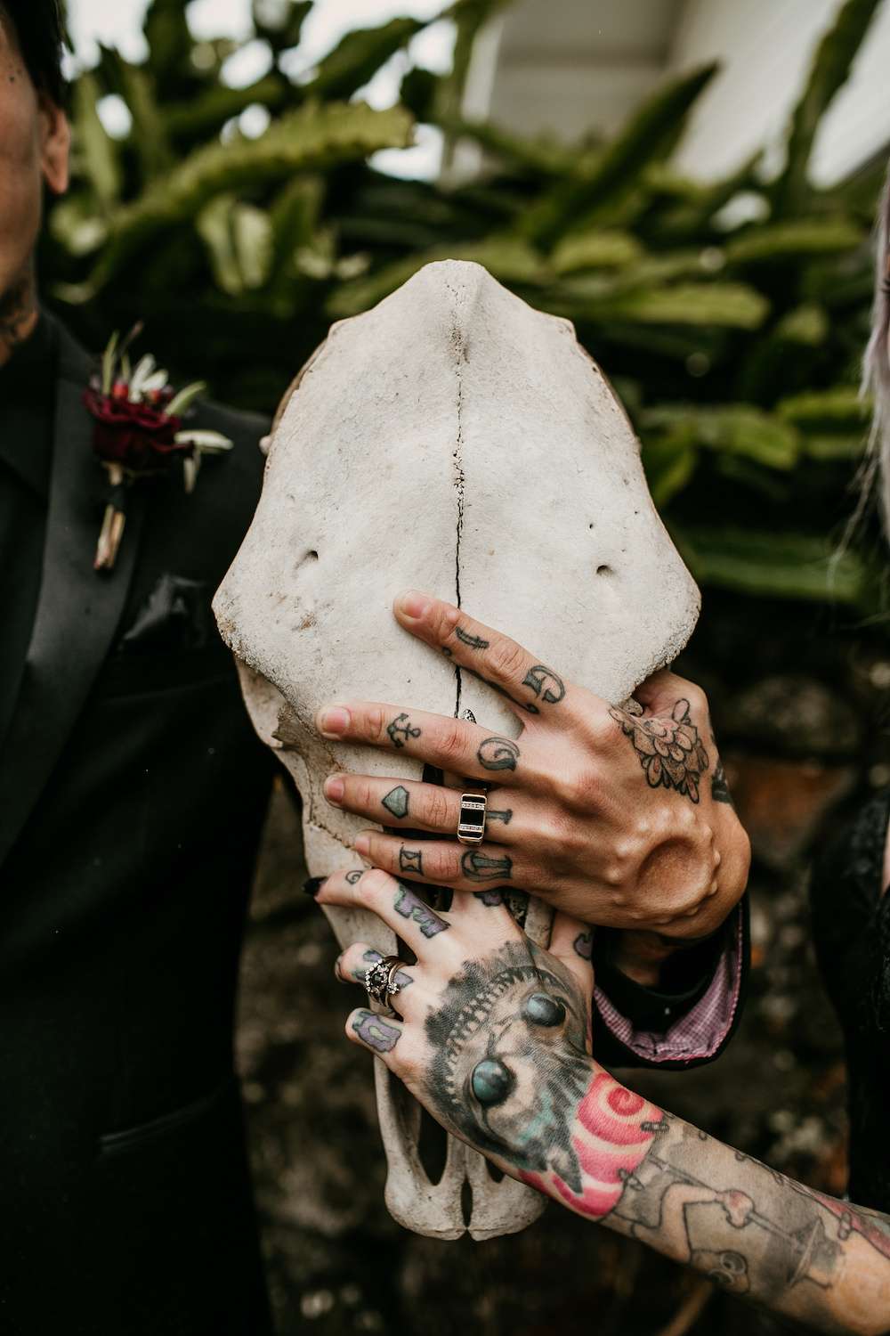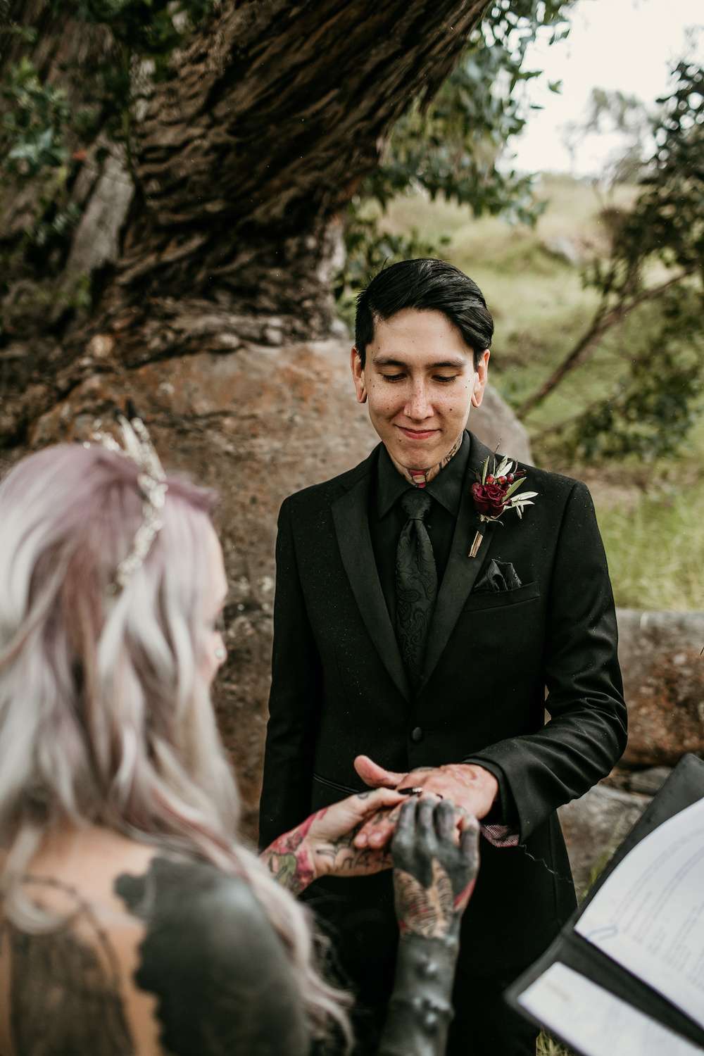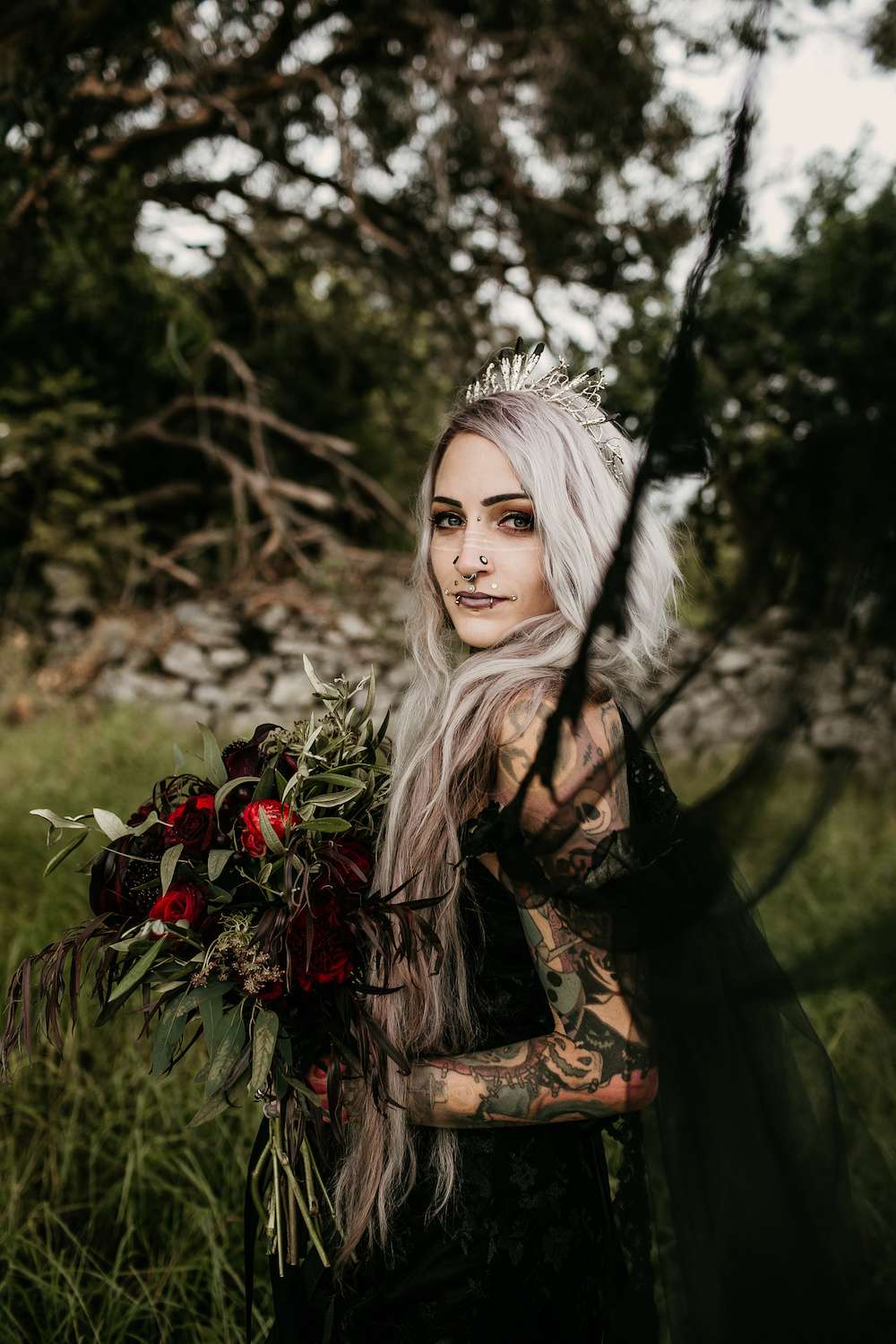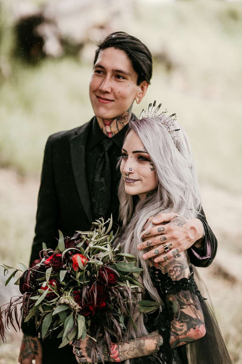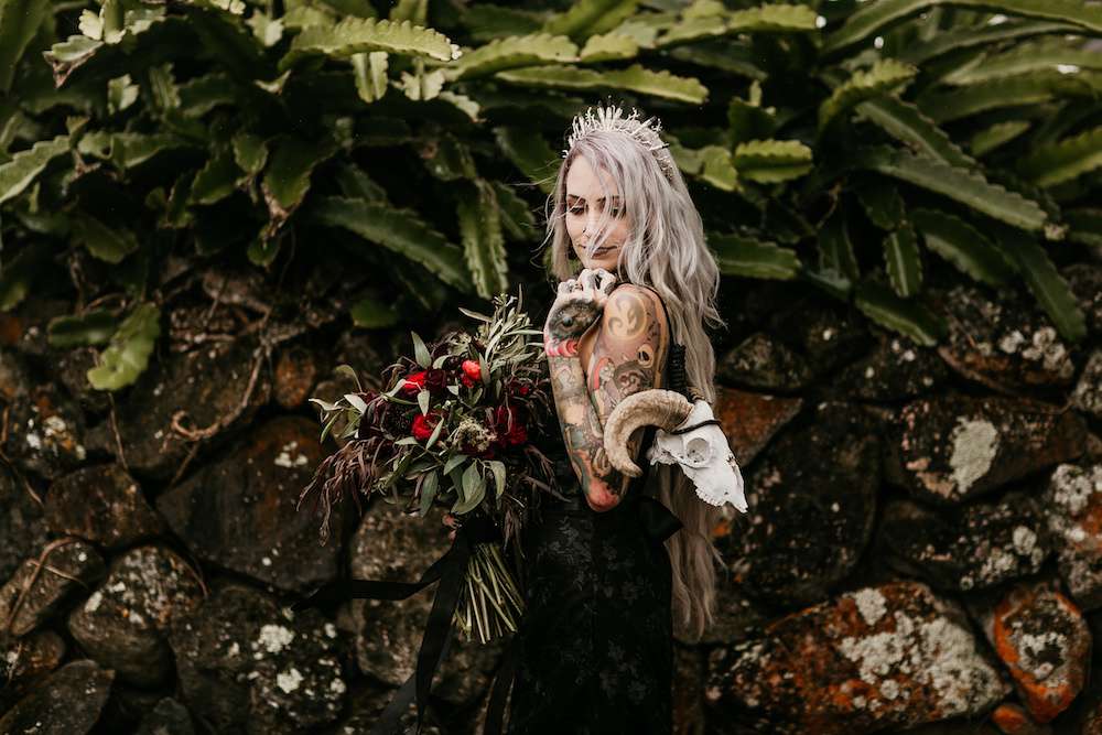 Hold onto your hats, ladies and gents, and if you’re not wearing a hat, hold on to just about anything, because this Friday 13th wedding is going to shake you to your core. The most incredible couple, deep colour palette and gothic styling have come together in this amazing wiccan-inspired wedding, where all of the Rock n Roll Bride aesthetic stars have aligned.